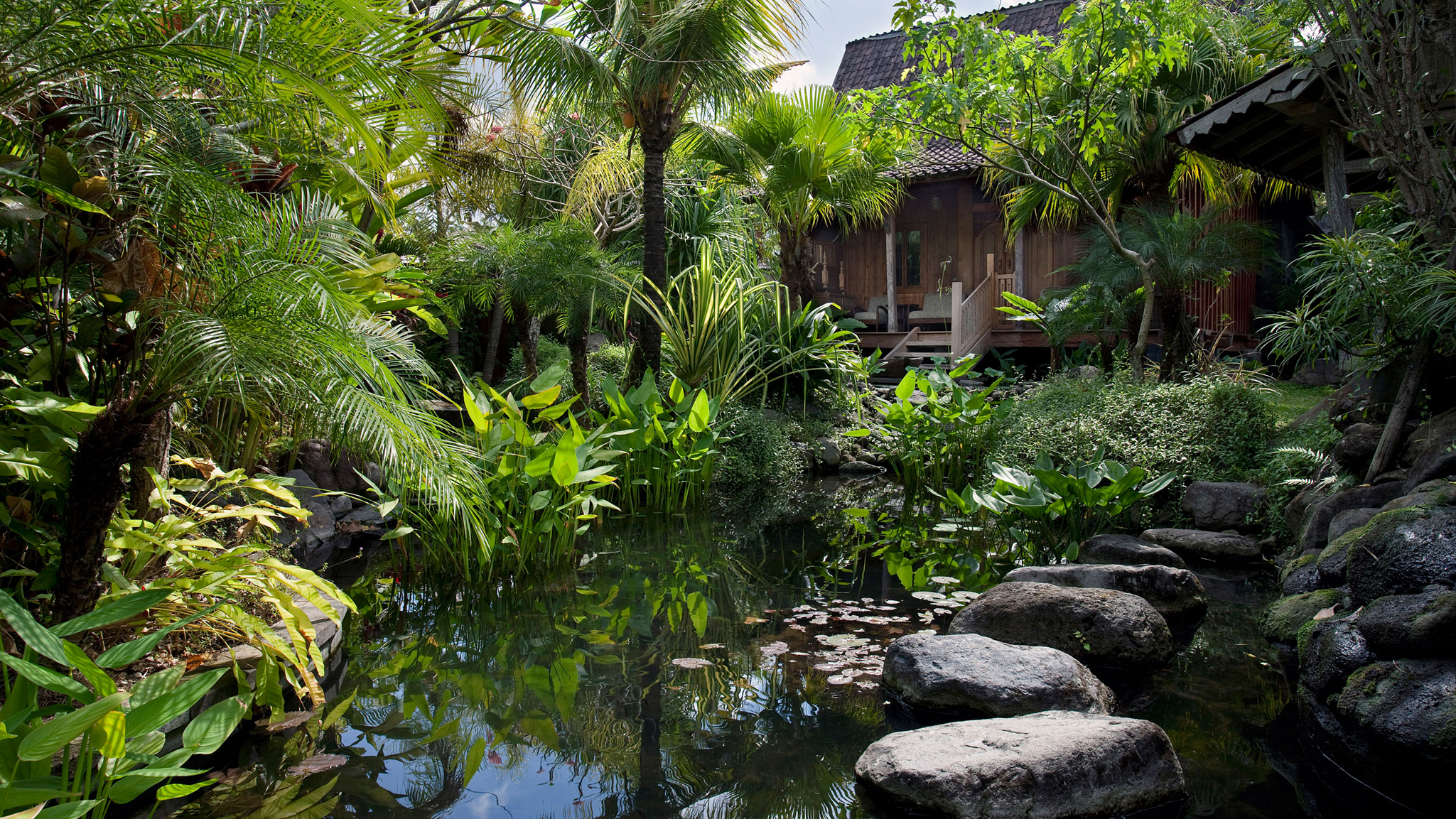 The traditional high-peaked teakwood building is approached via a series of uneven natural stepping stones over a lily pond, where it presides over the garden like a floating pavilion. Waterfalls tumble over boulders down to a little bridge, before seemingly flowing into the swimming pool. Five wooden steps lead up to the elevated veranda of this gorgeous one-bedroom house. Sheltered by the roof and offering a beautiful view of the garden, the veranda is furnished with a small table and two rattan planters’ chairs for alfresco dining, as well as a pair of armchairs and a coffee table. The walls feature shuttered peepholes, while bell-jar lanterns hang from the roof casting a soft light in the evenings.