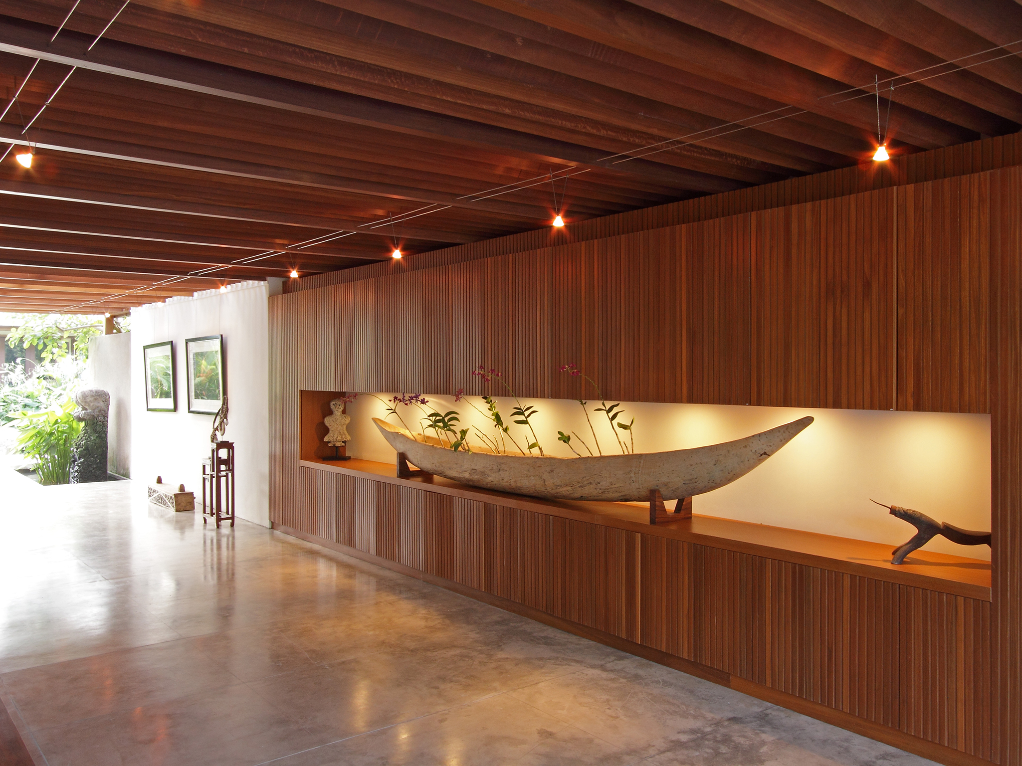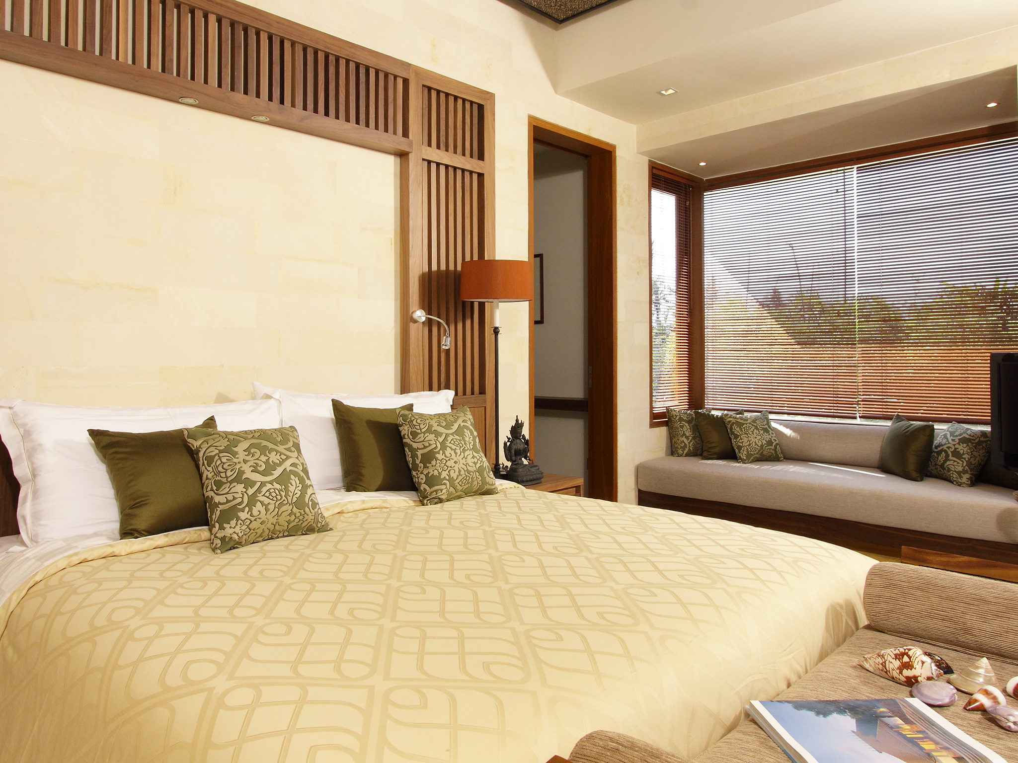 Sarasvati is accessed via stepping stones over a lotus pond and a long entrance hall adorned with striking photographs taken by the owner. The four air-conditioned bedrooms are arranged on two floors, presenting a coffee and cream colour theme. Each has a king-size bed (two of which can be converted to twins), a TV/DVD player, a dressing area, and a built-in cushioned window seat that doubles as an extra single bed for a child. The sunlit indoor/outdoor bathrooms are delightful; each fitted with twin washbasins, a walk-in rain shower and a bathtub. The master bathroom (downstairs) offers a semi-open-air bathing experience with a freestanding terrazzo tub for two, positioned beside a glass wall with doors that slide open to a private garden. The other downstairs bathroom is bordered by an ornamental pond with statues spouting running water, while the two upstairs bathrooms feature rooftop terraces, each with a dreamy outdoor bathtub resting beneath a pergola. The air conditioned living/dining pavilion runs the length of the pool with glass doors that open onto the deck and a majestic dining table for 14, with a huge cane planters’ chair at either end. Five glass bell-jar lanterns overhang the table and the room is lovingly adorned with a collection of antique wooden artefacts. The living area is furnished with sofas, armchairs and a coffee table, while, overlooking the rice field at the far end, is an open-air garden room with a pergola roof draped in cascading thunbergia. This enchanting, sunny room flows into the living pavilion, yet can be a separate area when the glass doors are closed. Sarasvati’s immaculate, designer kitchen is fashioned in creamy marble, with pots and pans hanging from the ceiling above a central island next to the dining area. The cosy, air conditioned TV lounge is on the upper floor. Sofas hug the walls and the room is equipped with a large LCD satellite-channel TV/DVD player with surround sound. Bordered by a deck crafted from lovely reclaimed wood, the 18m lap pool is furnished with sun loungers and umbrellas. A flat lawn extends into a magical garden, abundant with flowering trees, antique gazebos and garden games. At the entrance to the villa is a self-contained multipurpose studio, unfurnished and ideal for parties, while shared facilities include: Dea Spa, with massage room, outdoor treatment area, sauna, jacuzzi and showers; a fully-equipped, air-conditioned gym, and a children’s playground with sandpit, Wendy house, swings and slides. Here, parents can relax on cushions within an antique balé while they watch over their kids.
