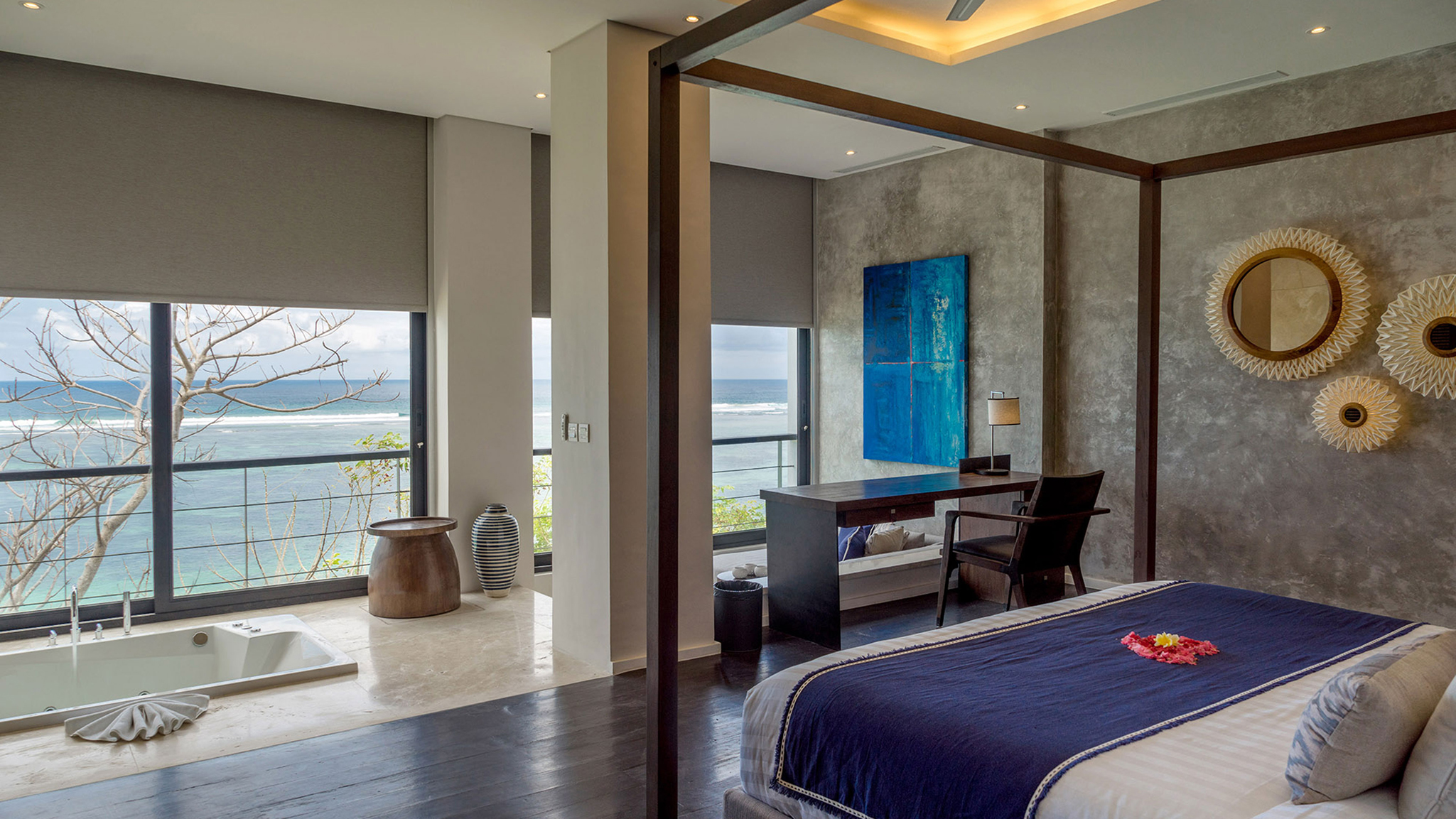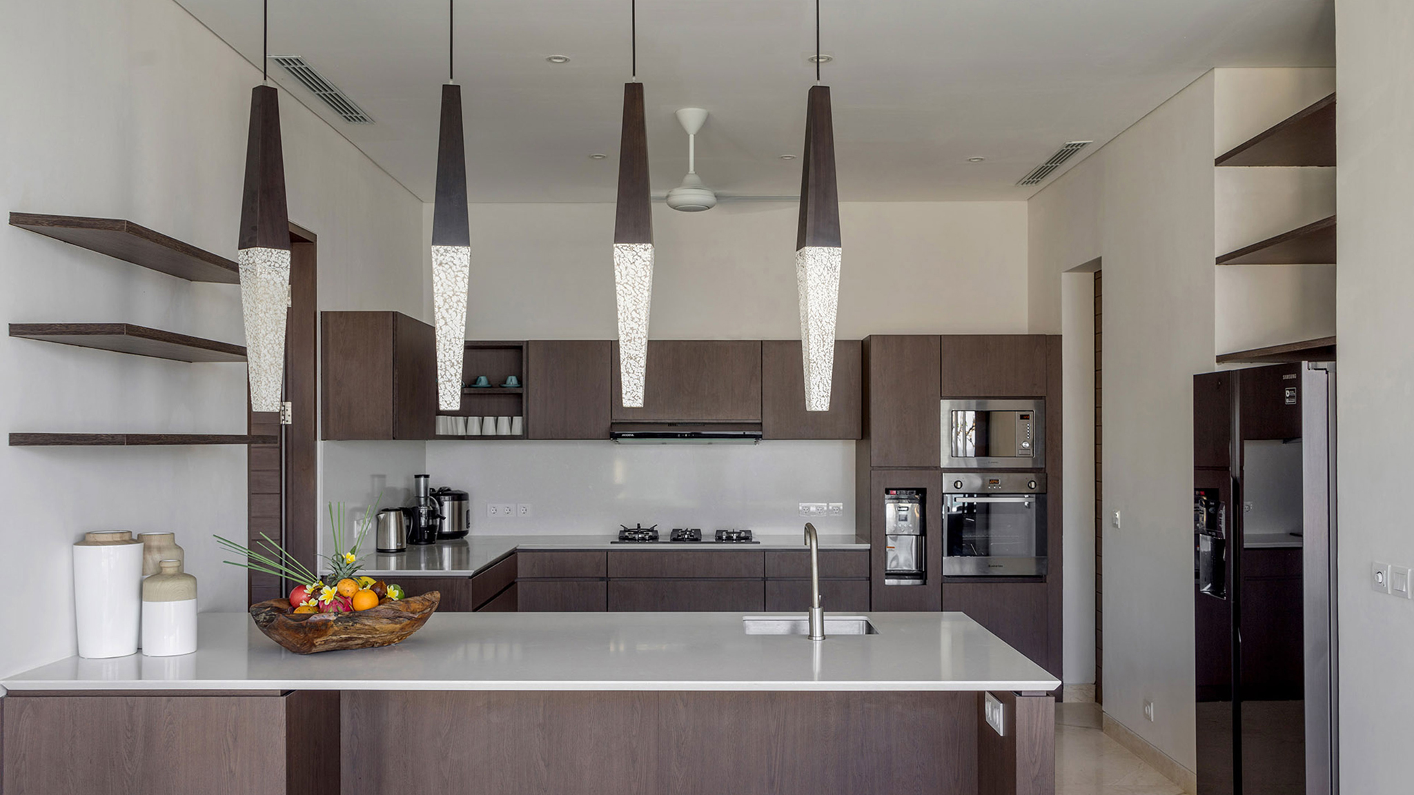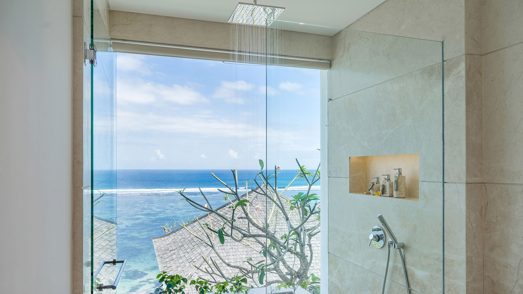 The upper floor of the villa is dominated by a huge atrium-like living space, capped with a pitched glass roof that channels and diffuses the bright sunlight. Here, a pair of elevated built-in daybeds double as extra beds (at extra cost). Two more bedrooms are situated on this level with two more on the lowest floor. All four of these generously sized rooms are furnished with king beds, with a four-poster in the Honeymoon Suite. Each has an ensuite bathroom fitted with a monsoon shower and an oversized tub (with a jacuzzi tub in the Honeymoon Suite).