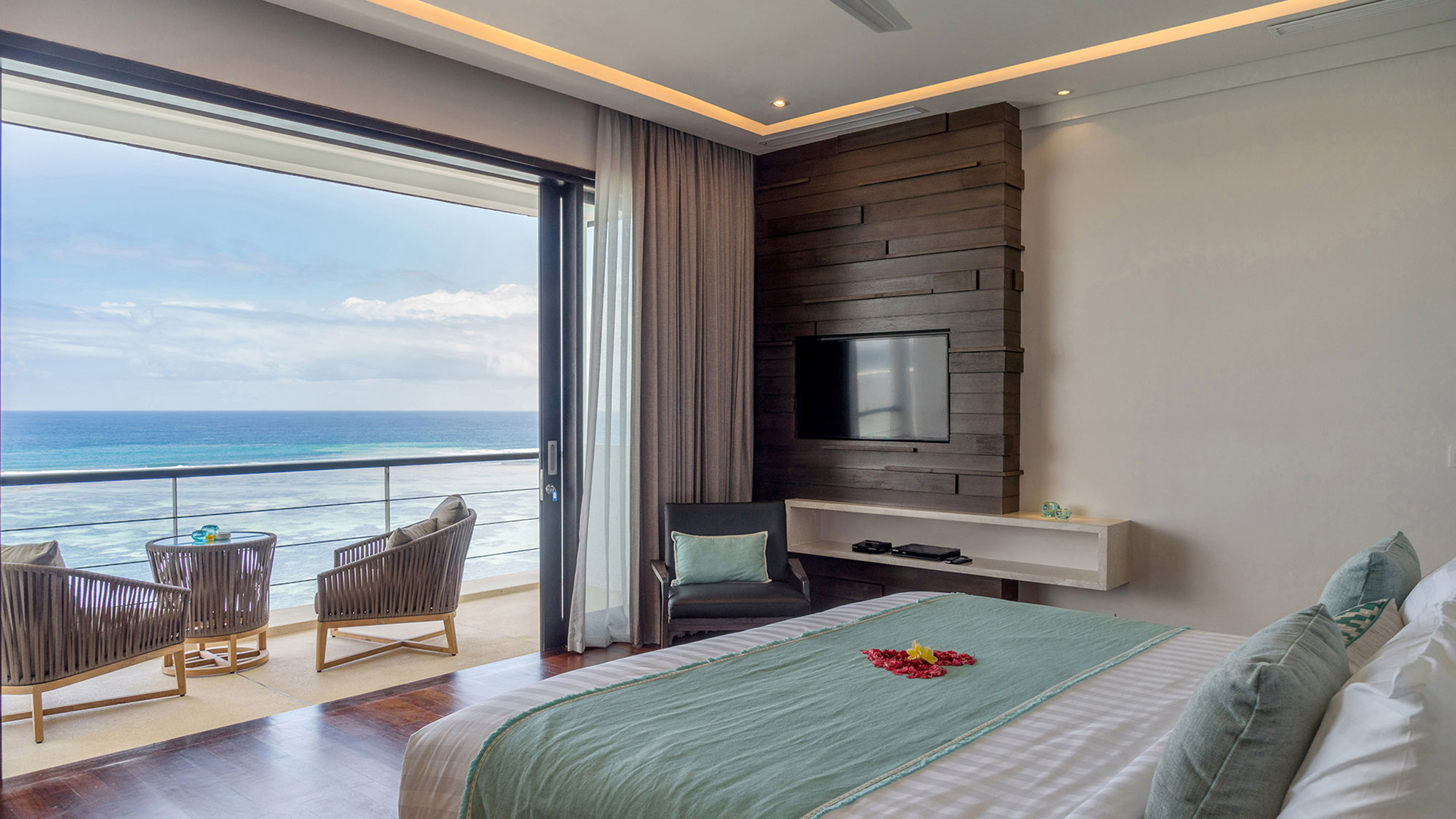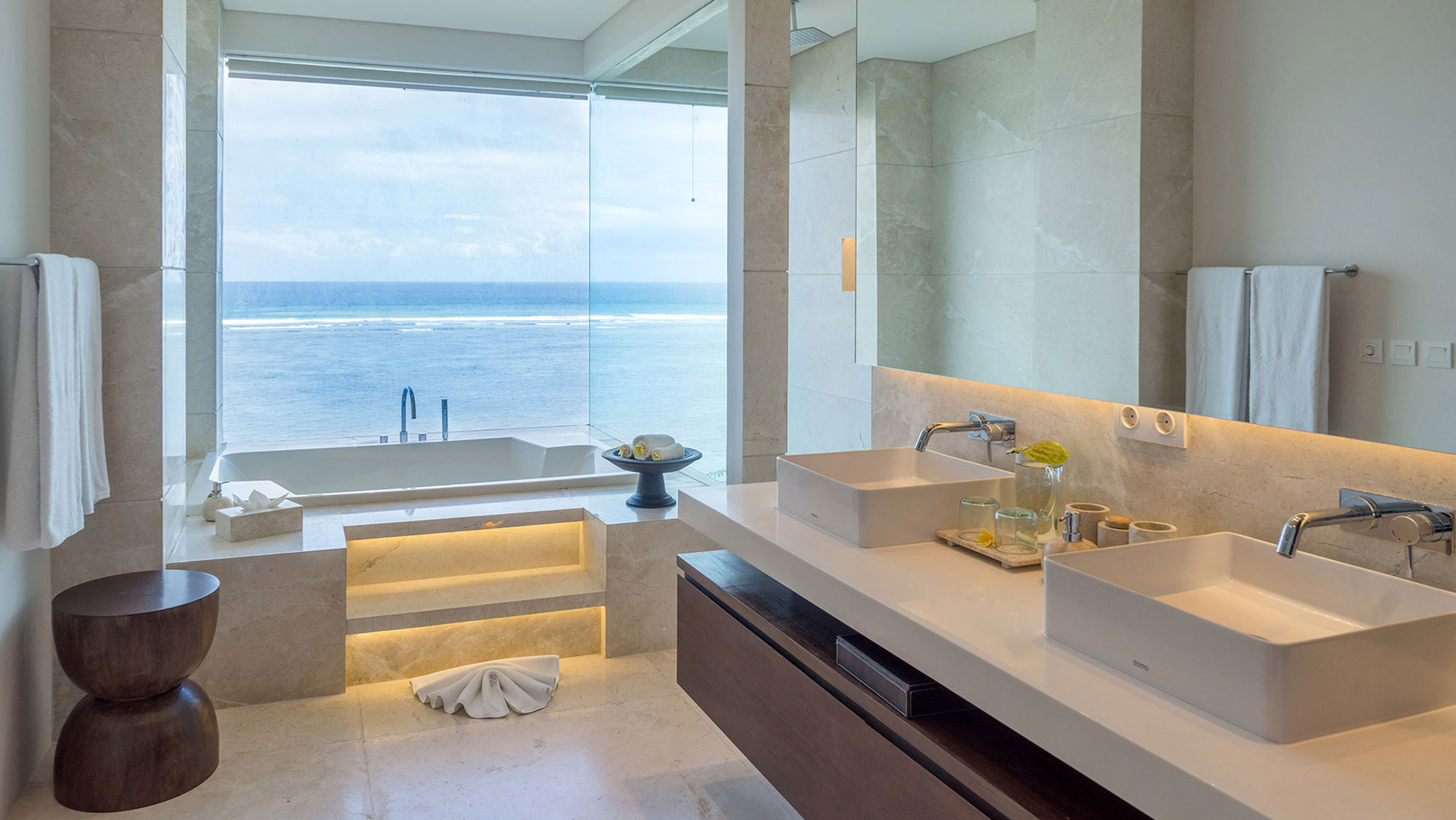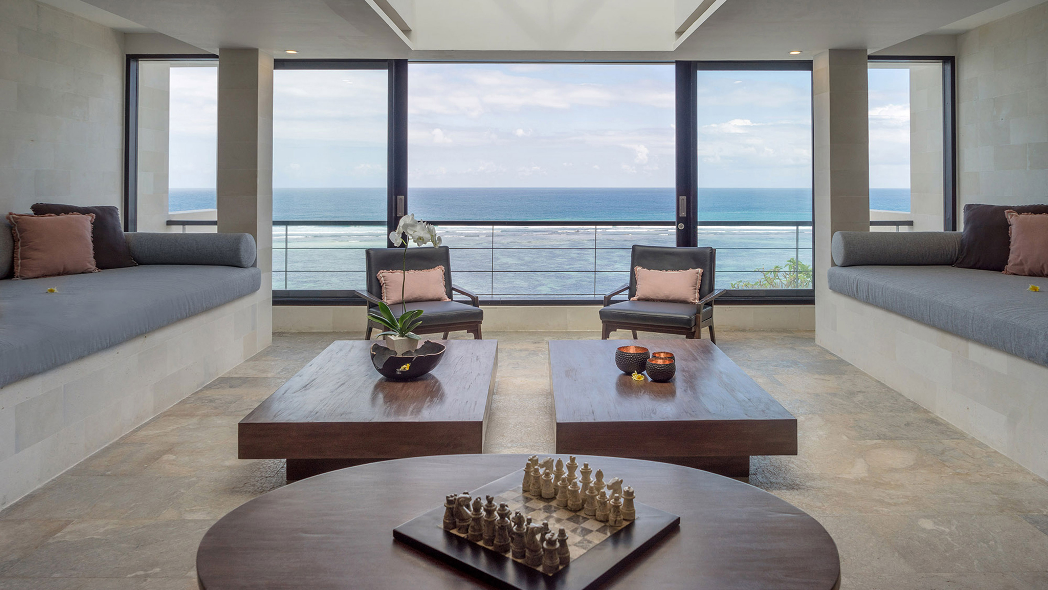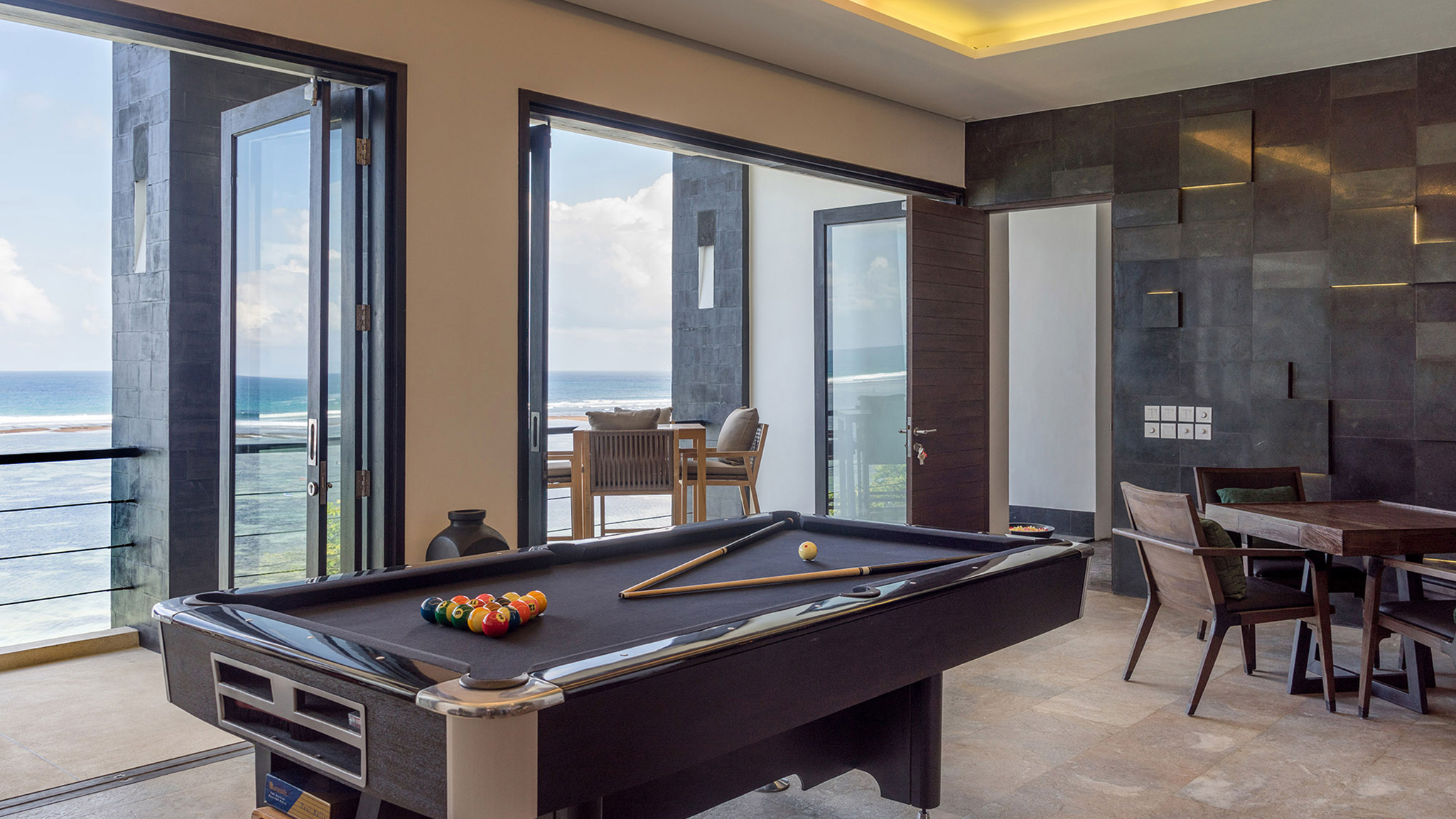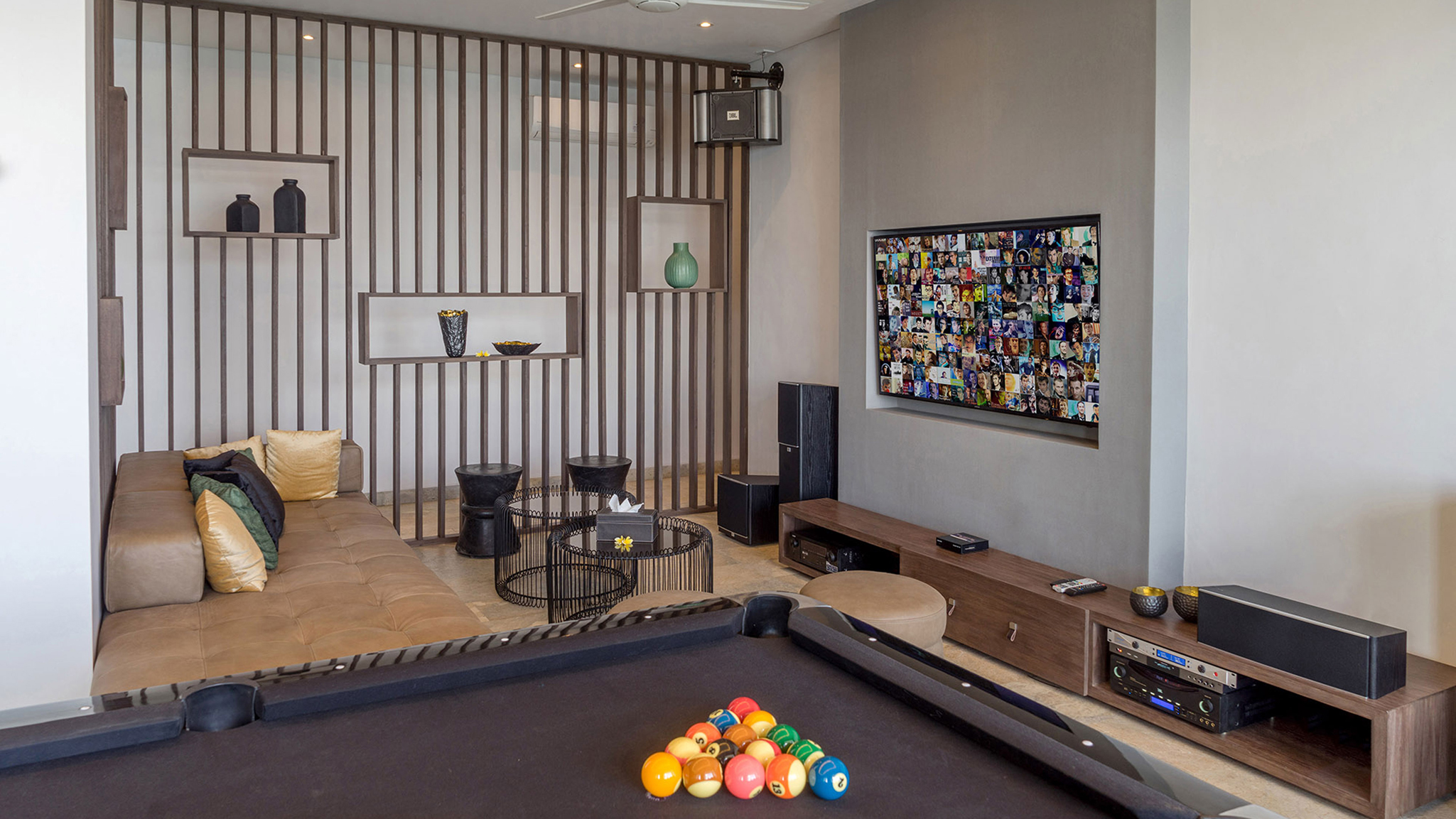 The lower floor is also home to a fabulous games room, equipped with a billiard table and a bar. A mirrored wall duplicates the magnificent ocean panorama, while bar tables and chairs extend onto an open-air balcony. The games room also comprises a cosy home theatre, equipped with a 65-inch international-channel TV, surround sound, karaoke and Playstation 4. More luxurious facilities, including a wood-panelled spa room with two massage beds, an infrared sauna and a well-equipped gym, complete this floor.