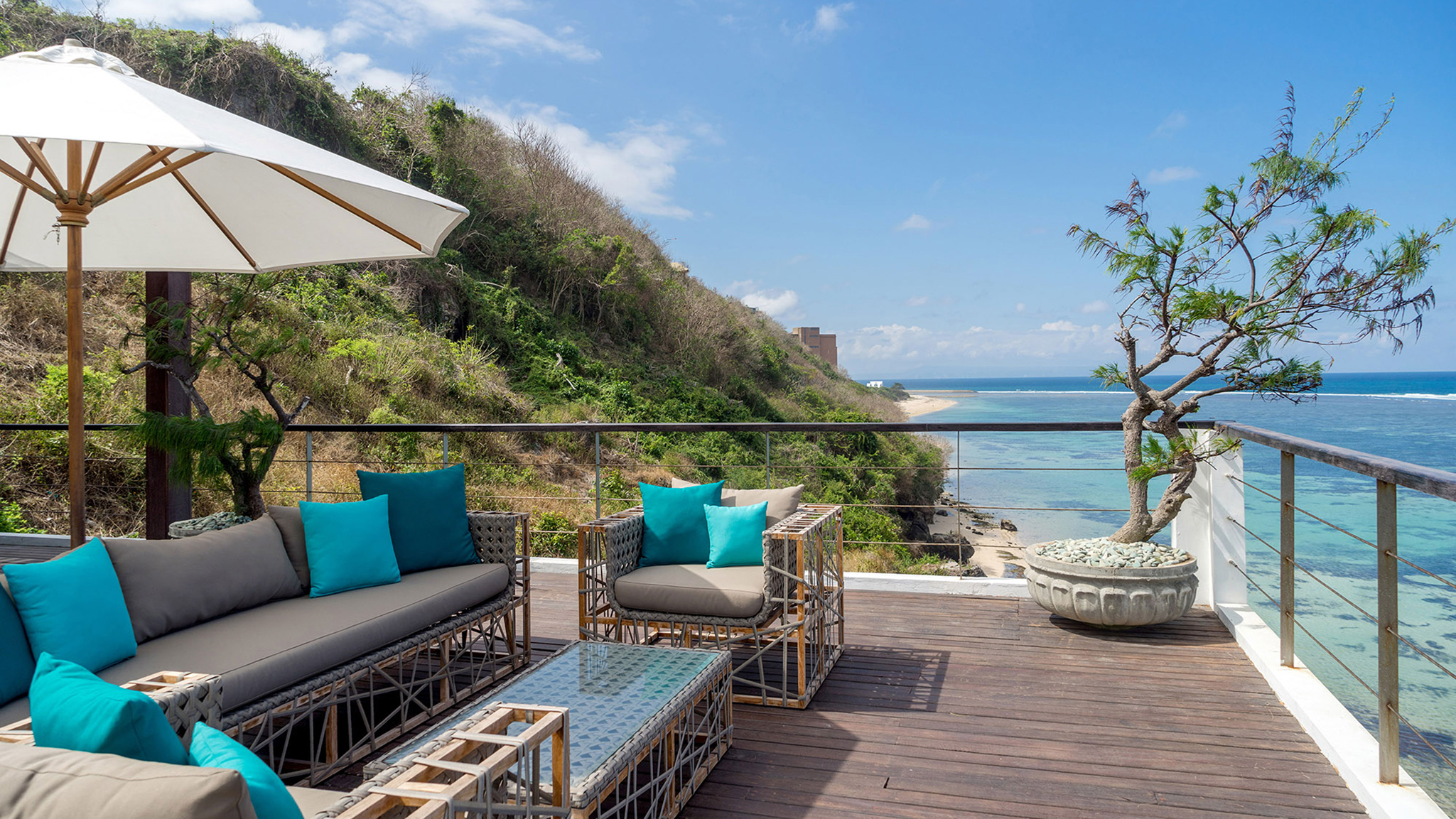 Also on this level is a twin bedroom and ensuite bathroom fitted with a rain shower. Outside is a true infinity swimming pool, where the 16-metre pool edge runs parallel with the horizon, merging with the blue waters of the sea. Punctuated with frangipani trees, and flanked by paved pathways and small areas of grass, a broad timber deck wraps around three sides of the pool, completed with a jacuzzi, a large bale relaxation pavilion and an alfresco living/dining area furnished with an all-weather sofa and chairs, another dining table and a gas barbecue. A pergola roof provides shelter and shade if required.