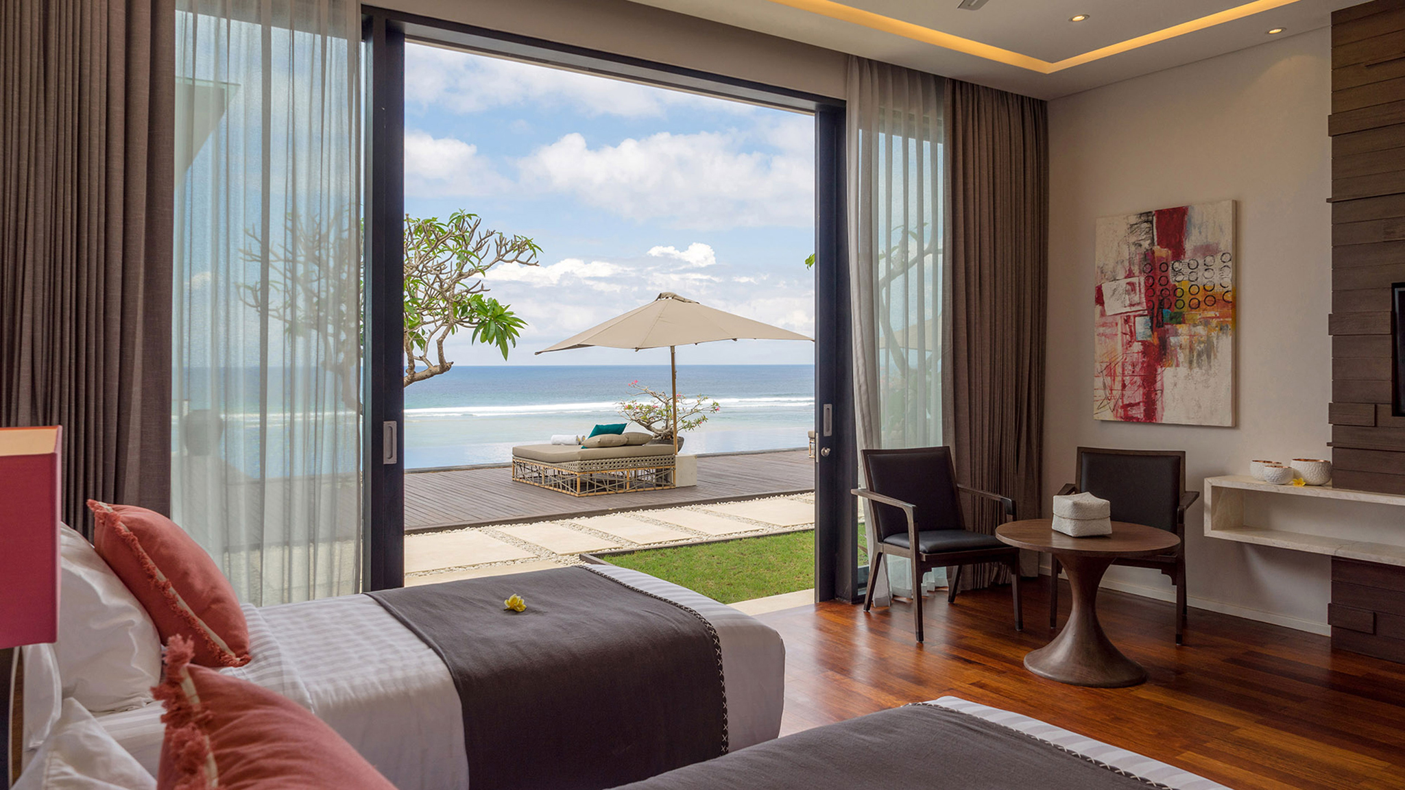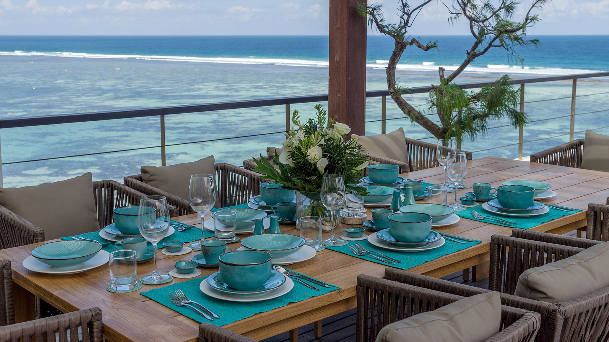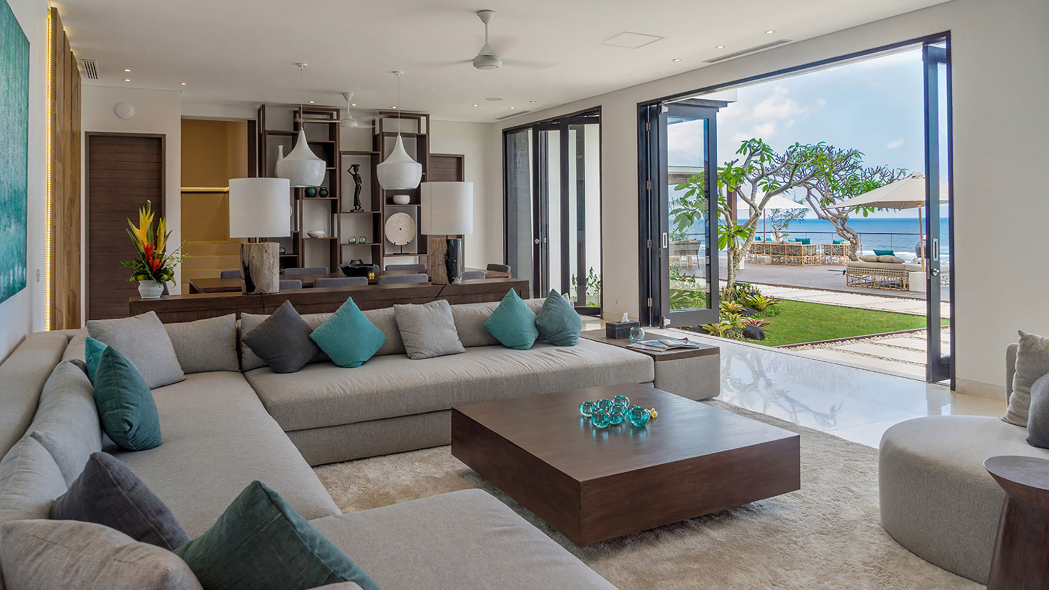 Entering the villa on the middle level, you’ll find an expansive living room integrating a sunny breakfast table, a formal dining table, and a well-equipped guest kitchen, behind which is a professional service kitchen. The living area is furnished with a huge sofa, and a 65-inch international-channel TV. The provision of Wifi and an iPad allows access to Spotify and a world of music that can be played through indoor and poolside speakers. Glass doors can be closed for air-conditioned comfort or opened to sea breezes.