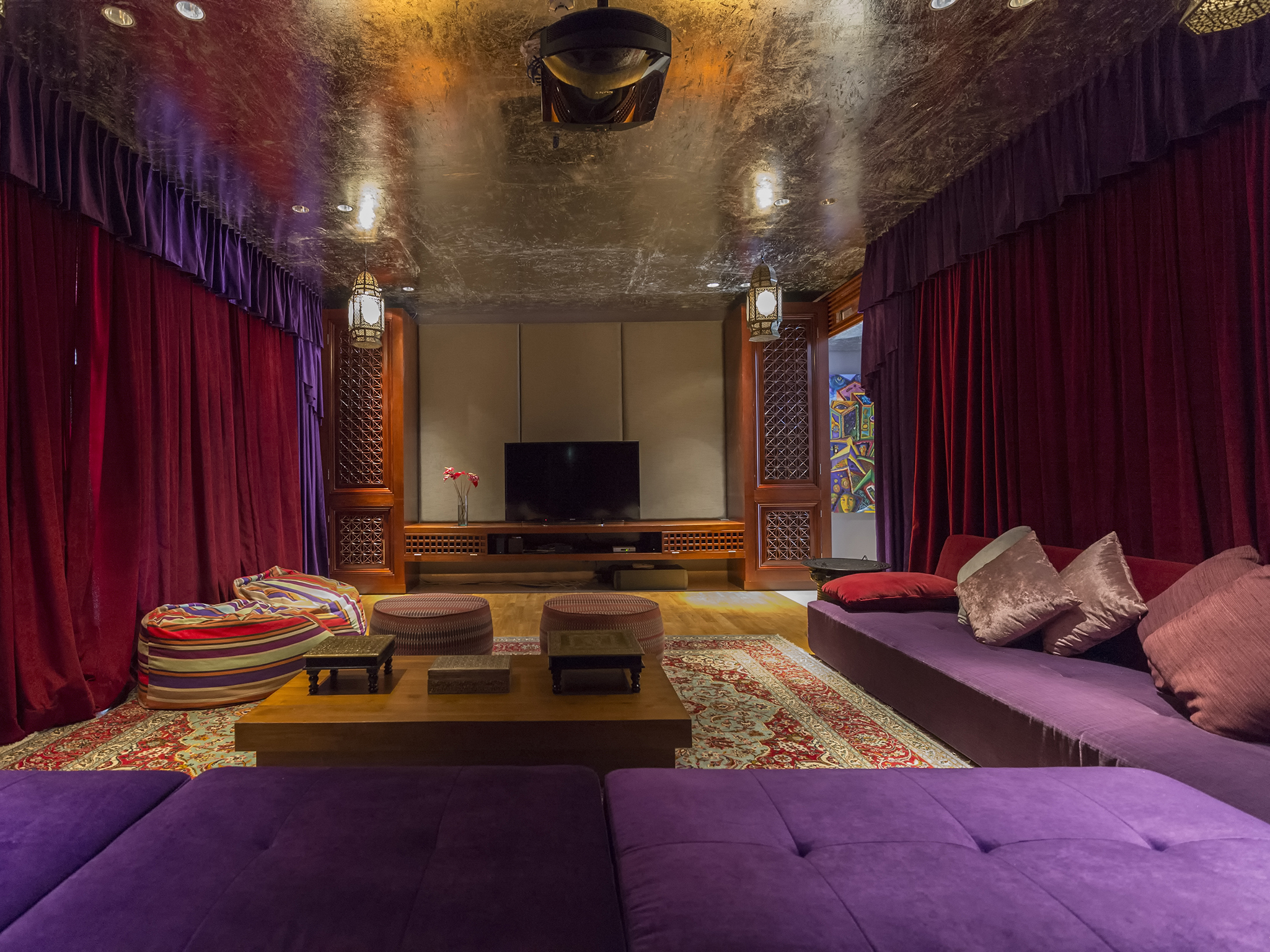 The Moroccan-themed home cinema – where velvet drapes hug burgundy walls and an L-shaped sofa can seat an audience of 12 – offers a huge pull-down projector screen, a 60-inch satellite-channel TV and a large collection of on-demand titles. A games room is well stocked with air hockey and foosball tables, Xbox, PlayStation and Nintendo, as well as board games. It also has its own bathroom and a small bar area.
