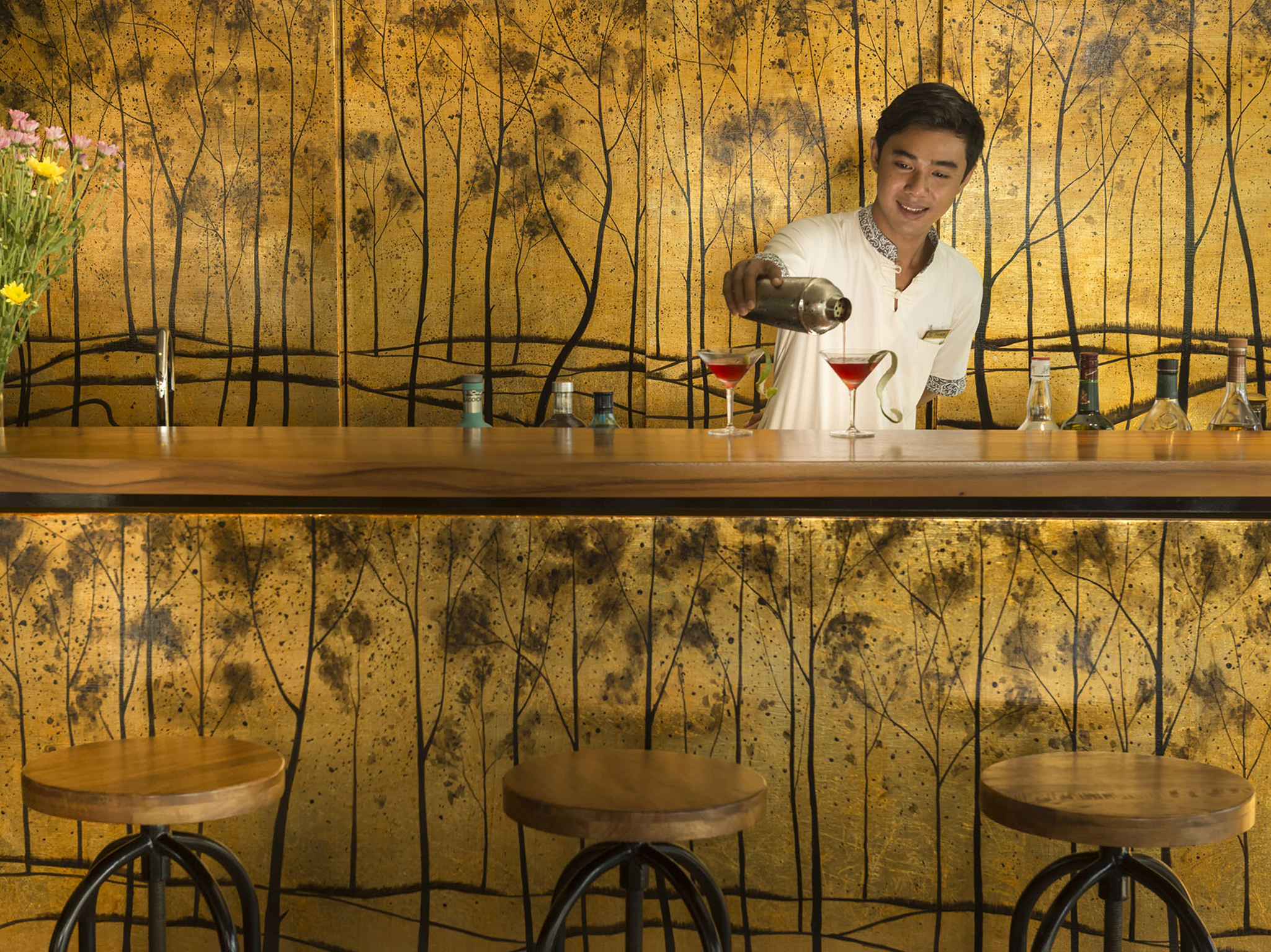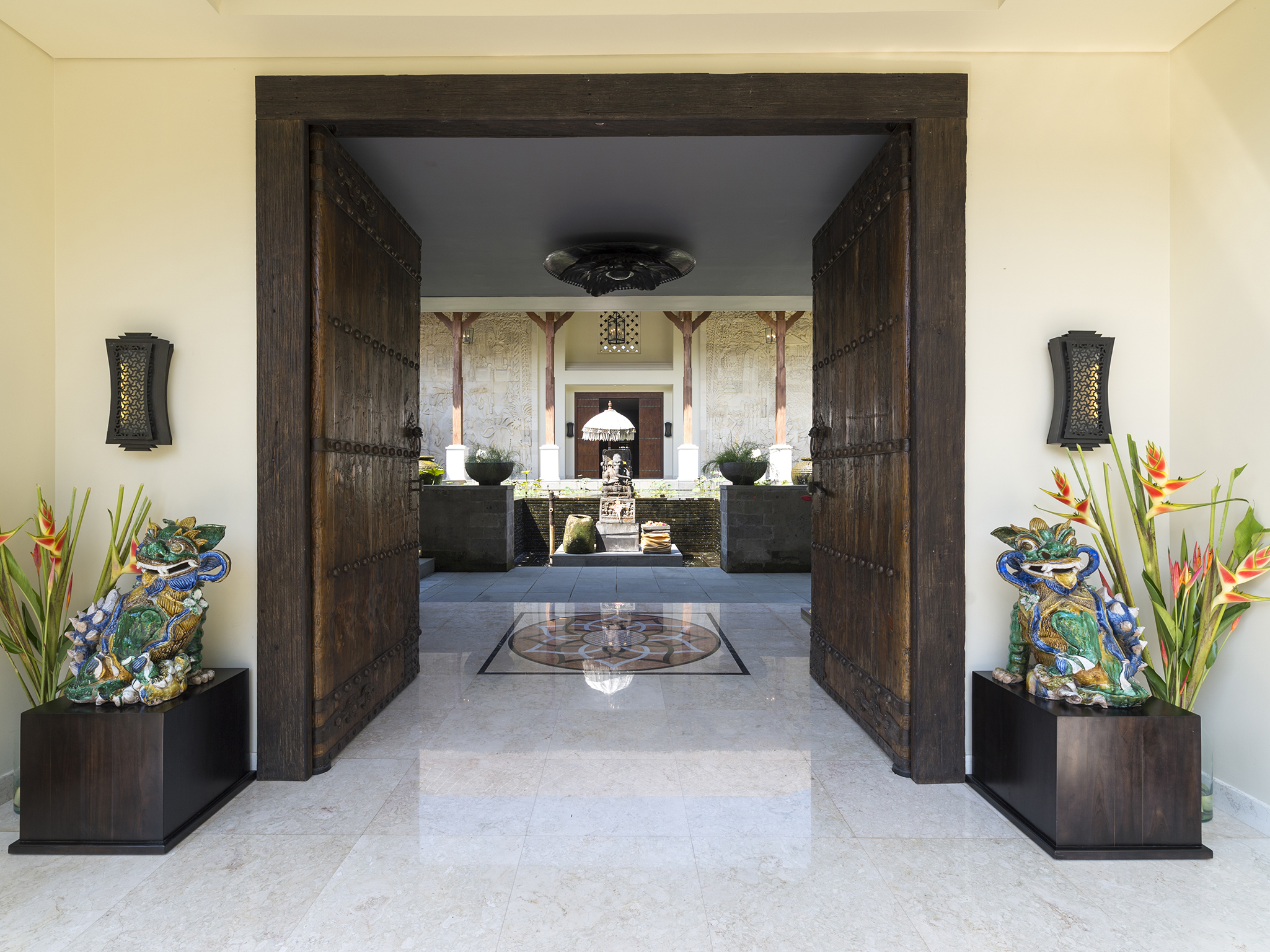 The grand master suite in the main pavilion is adjoined by a cosy air-conditioned library, which is also accessible from the garden. The bright, elegant, formal living room in the main pavilion opens widely to the pool deck offering a semi-open-air experience or air-conditioned comfort. The other two living rooms (one in each guesthouse) are open-sided and cooled by ceiling fans. Positioned next to the pool deck is the dining pavilion, adorned with fascinating antiques and with 18 chairs arranged around a six-metre-long, solid wood table under a soaring roof. On one side is a guest feature kitchen with a service bar and counter. A professional service kitchen is situated behind.