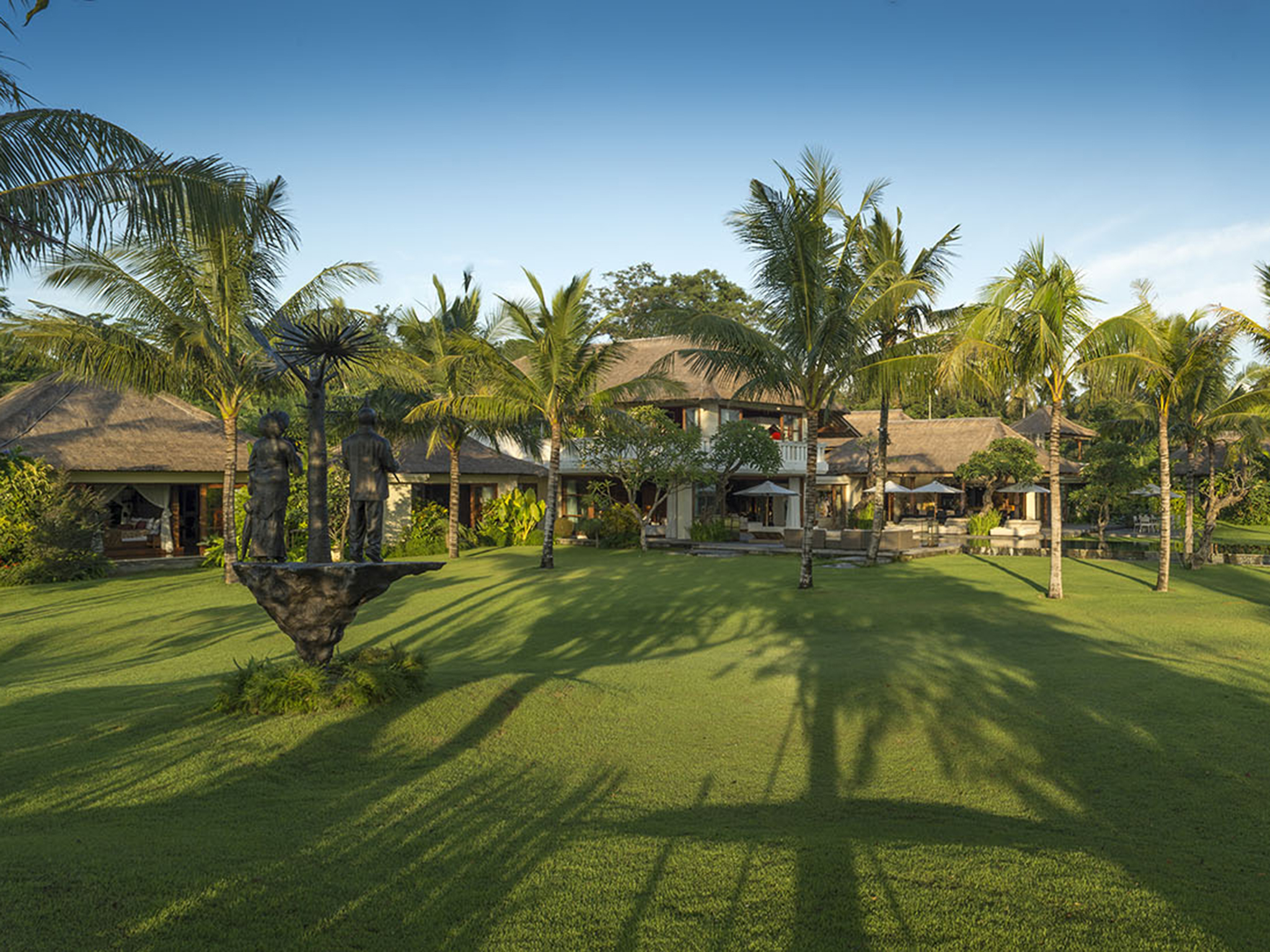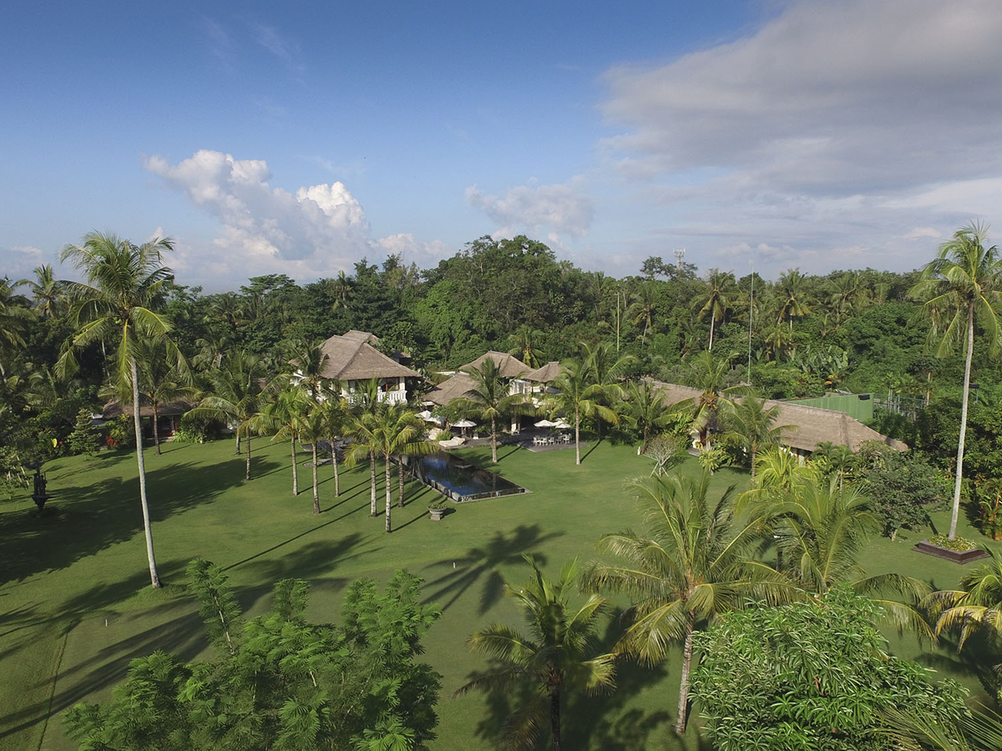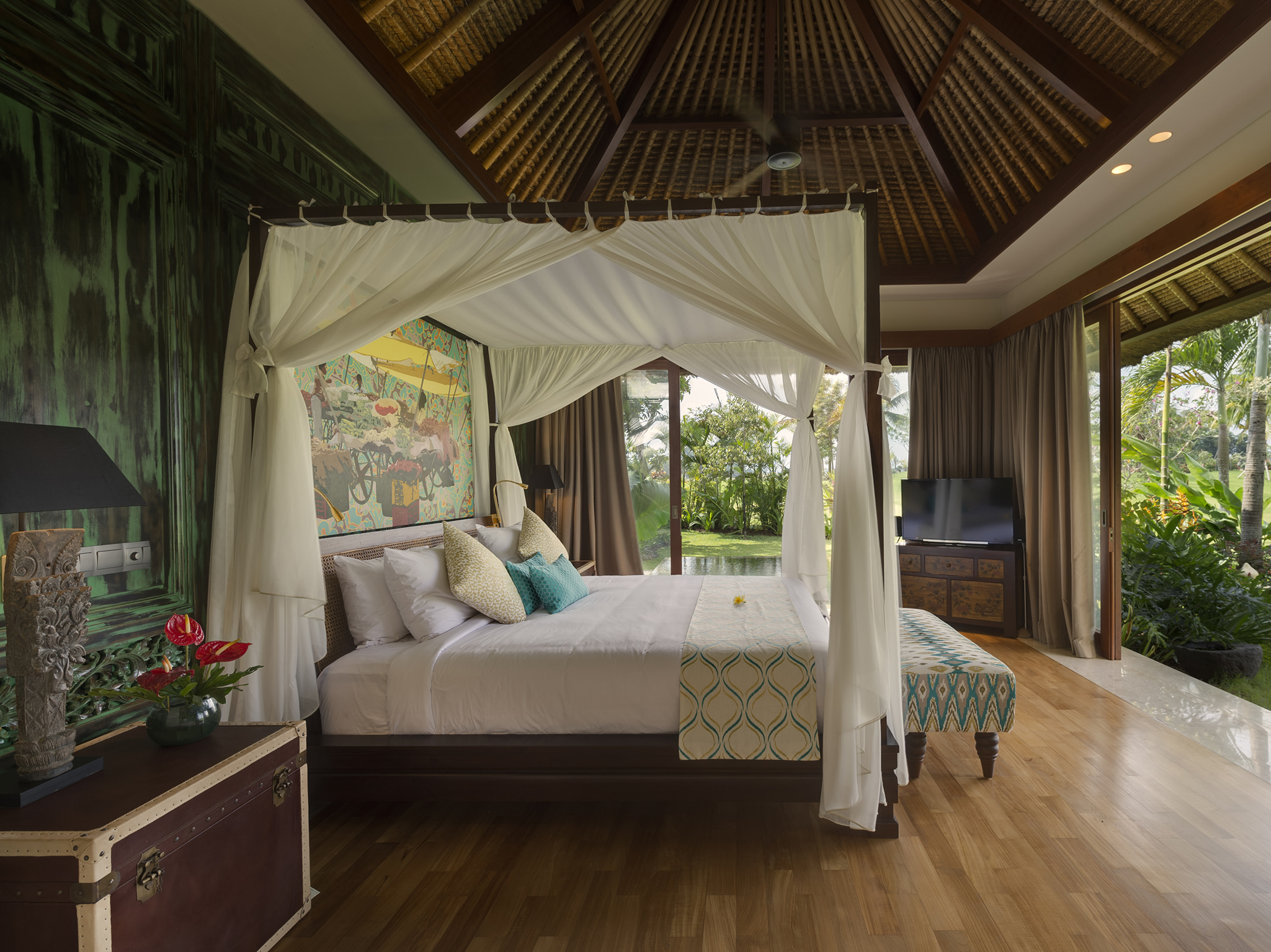 Kaba Kaba’s gorgeous garden presents rolling velvety lawns, lily ponds, a duck pond, croquet lawn, tennis court, and 25m swimming pool bordered by a broad timber sun deck furnished with loungers and umbrellas, all of which is surrounded by spectacular rice-field views.