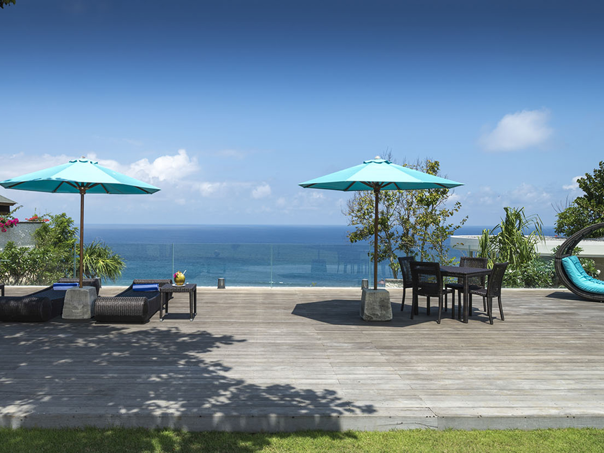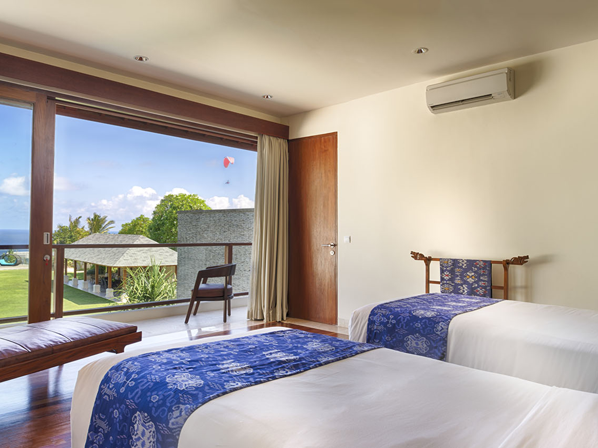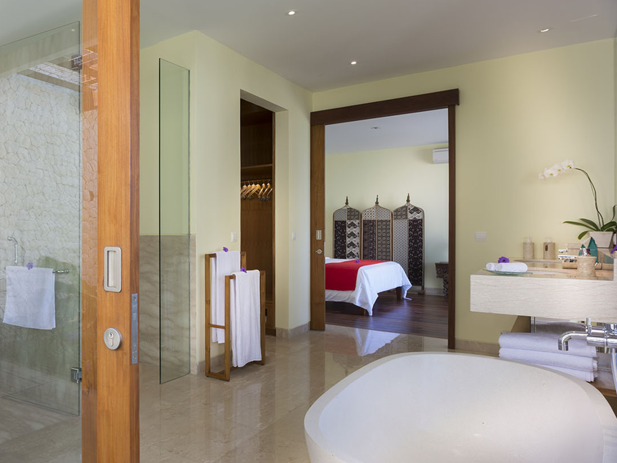 A walkway from Villa Markisa’s main entrance leads to the upper level of the guest pavilion, which is split vertically into a pair of two-bedroom apartments. Mirror-image air-conditioned living rooms are separated by a huge teakwood door that can retract to create one large space for those wishing to socialise together. In each room, comfortable sofas and chairs are set before 43-inch satellite channel TVs, and a sensational ocean vista spreads out beyond the glass balcony doors. Enjoying the same vista on either side of the living spaces are two air-conditioned guest bedrooms, with spilt king beds – one arranged as a king, one as twins – a seating area, and enormous marble bathroom with twin basins, bathtub, monsoon shower enclosure and walk-in wardrobe.