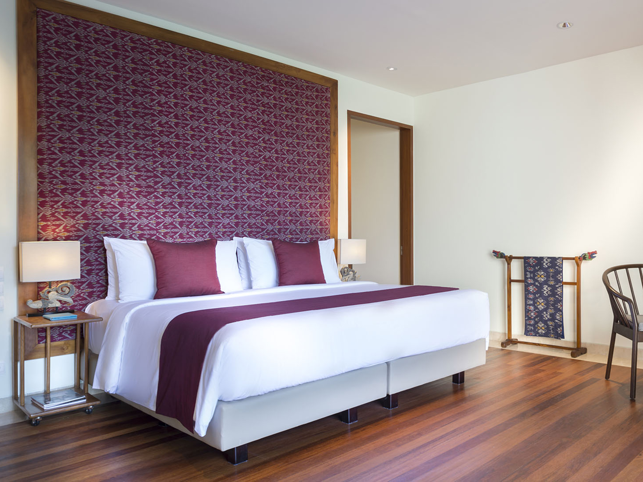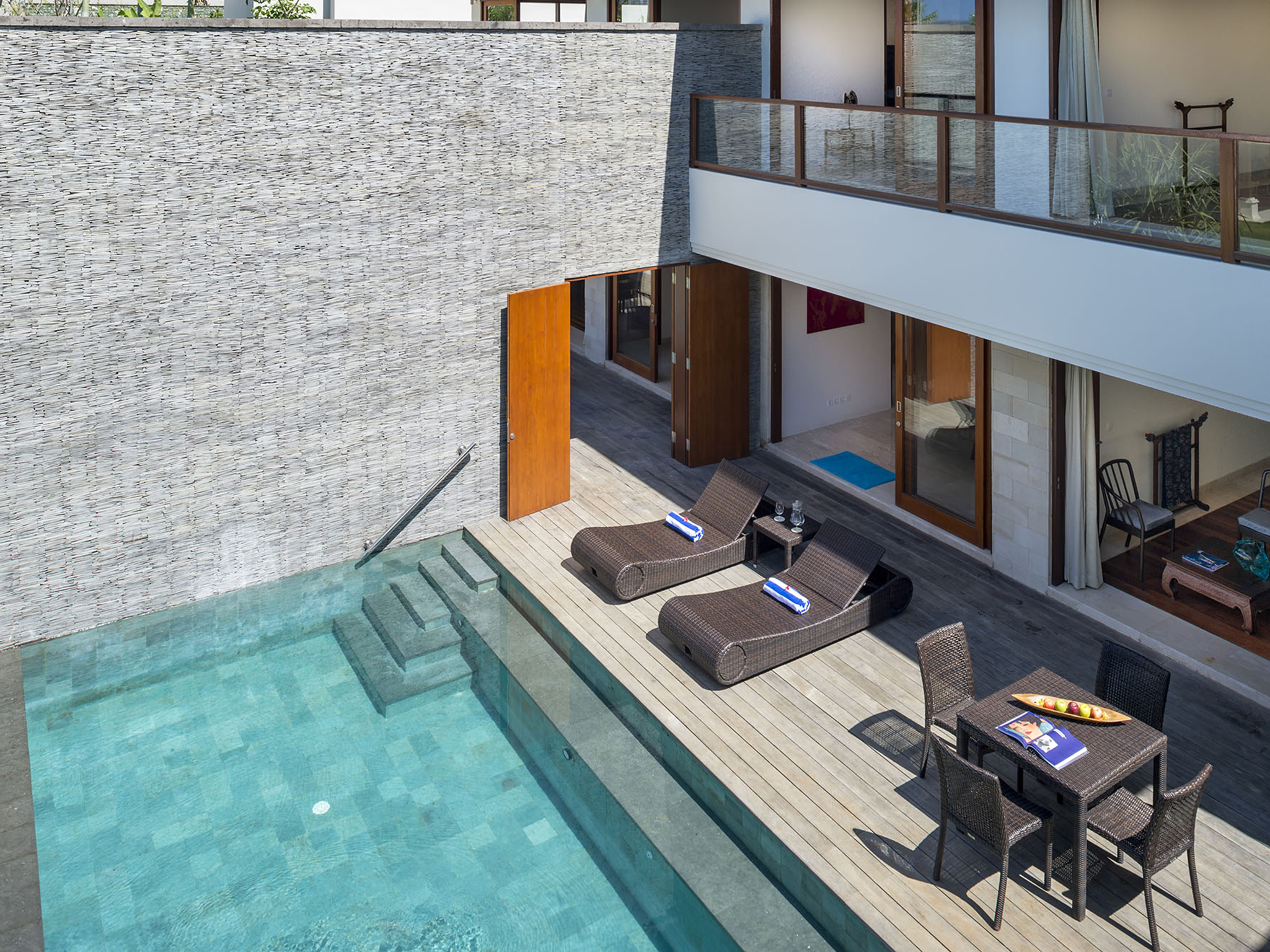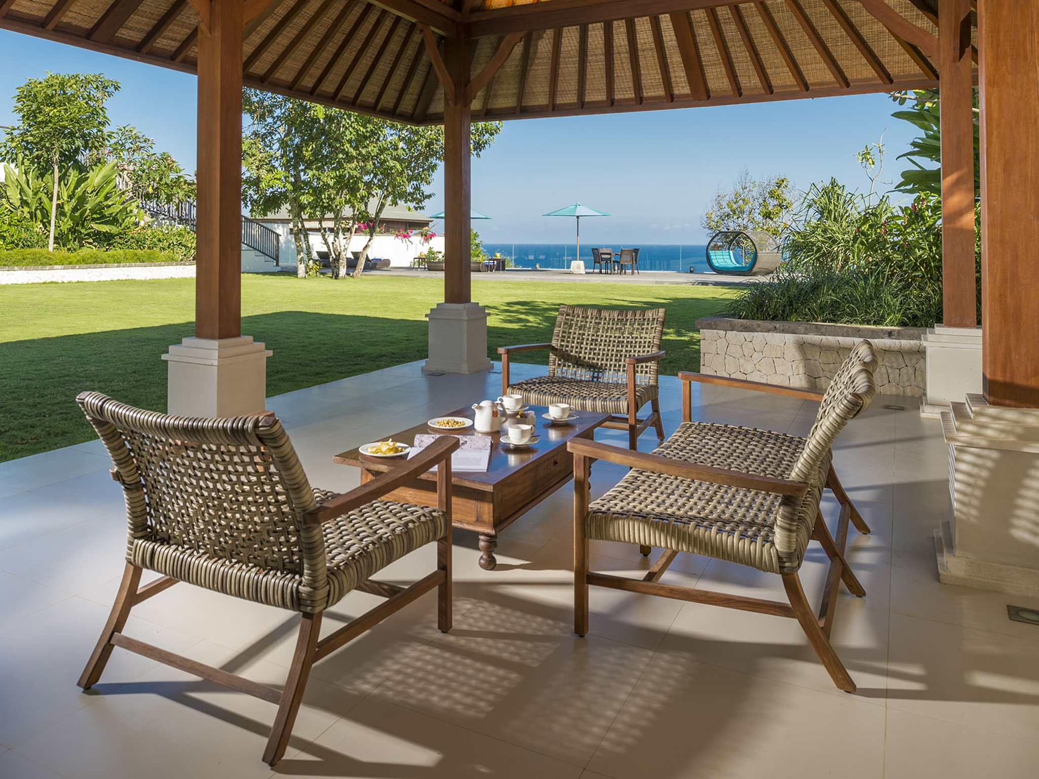 A walkway from Villa Markisa’s main entrance leads to the upper level of the guest pavilion, which is split vertically into a pair of two-bedroom apartments. Mirror-image air-conditioned living rooms are separated by a huge teakwood door that can retract to create one large space for those wishing to socialise together. In each room, comfortable sofas and chairs are set before 43-inch satellite channel TVs, and a sensational ocean vista spreads out beyond the glass balcony doors. Enjoying the same vista on either side of the living spaces are two air-conditioned guest bedrooms, with spilt king beds – one arranged as a king, one as twins – a seating area, and enormous marble bathroom with twin basins, bathtub, monsoon shower enclosure and walk-in wardrobe.