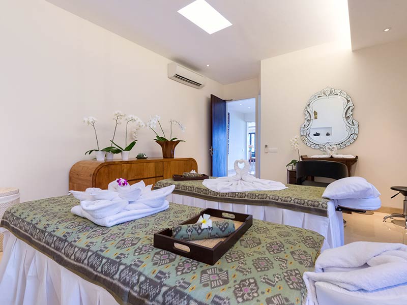 Set over two floors on either side of The Pala’s entrance hall are four large guest suites – each comprising an air-conditioned bedroom leading to a study or sitting area that can be screened off with clever sliding doors. This area also converts easily into an extra bedroom for young children. Decorative panels of wooden latticework separate the beds (kings downstairs, twins – that can also be configured as kings – upstairs), from the luxury ensuite bathrooms and dressing areas behind.