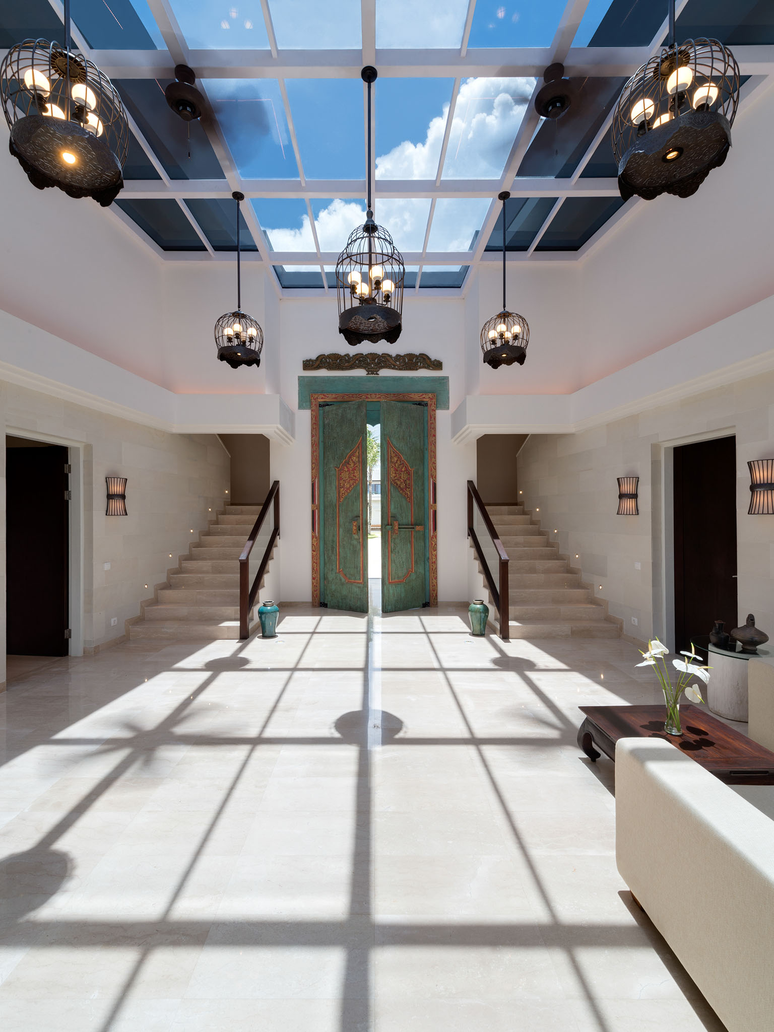 From the entrance hall, a bright passageway bordered by ponds leads to the vast ocean-view living room furnished with several large and luxurious sofas. Soaring high above, the tiered ceiling features a fresco of scenes from the Ramayana, and beyond a wall of glass sliding doors is a widely curved balcony comfortably furnished for outdoor living.
