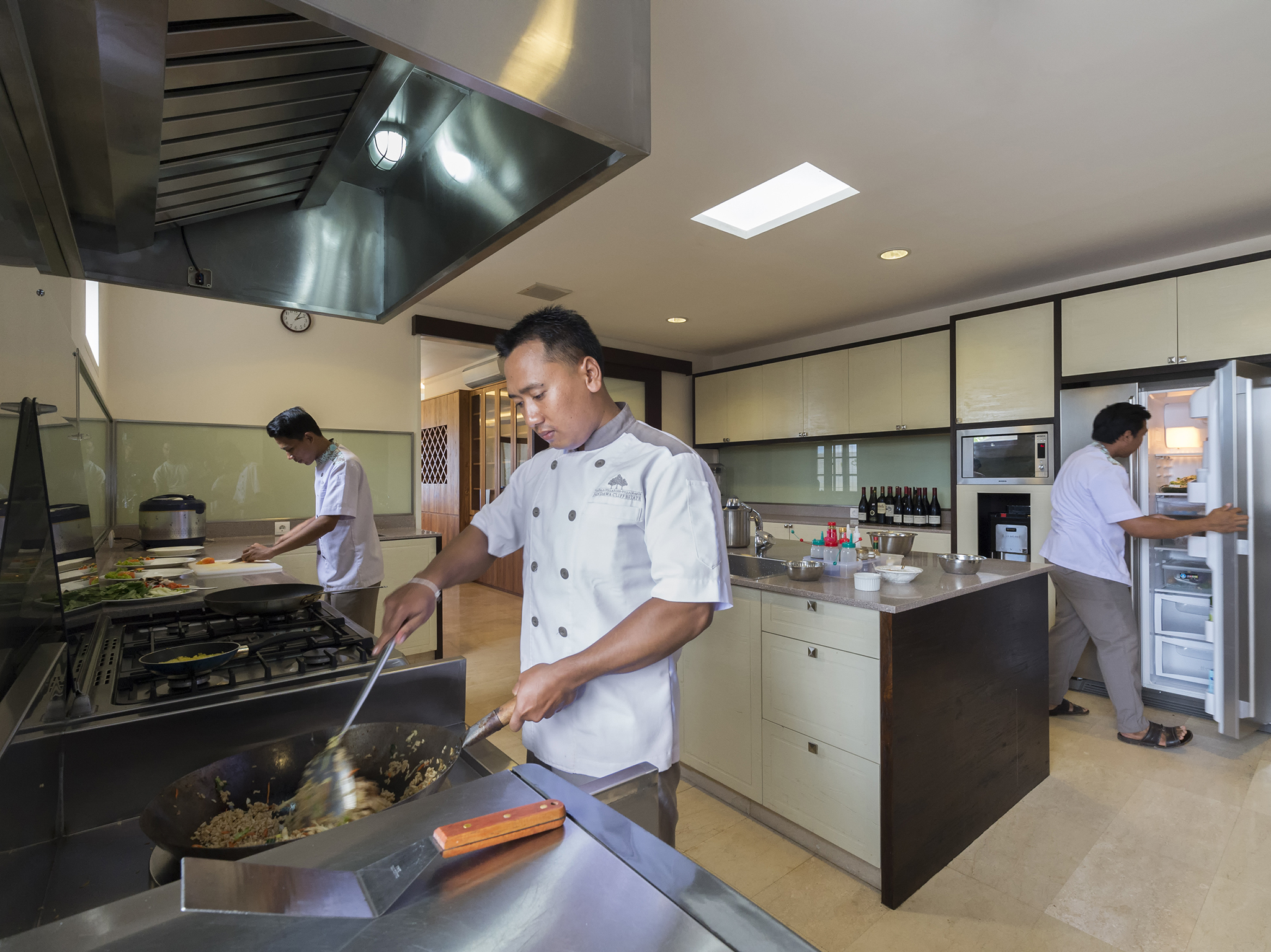 The large marble-floored dining room offers two eating areas – a huge teakwood table seating 12 in upholstered armchairs, and a round table seating eight. In front is a terrace with informal seating. Behind is a teakwood-lined bar, butler station and a well-equipped kitchen. (A larger professional kitchen behind the kitchen courtyard has been designed for big events and weddings, and can be used by external caterers).