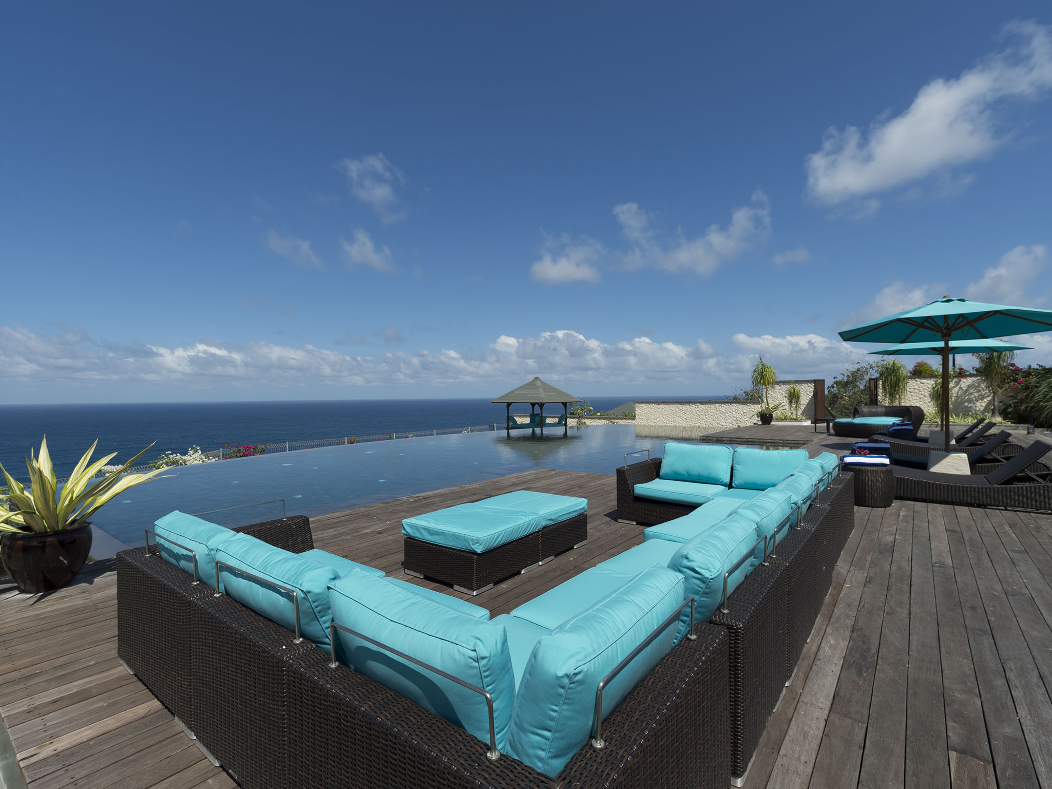 The gardens provide further places for relaxation. Flanking the pool is a deck with loungers and U-shaped seating and, right at the cliff-edge, a garden bale. An open-sided area below the master bedroom offers semi-alfresco dining for 10 and a bar overlooking a cliff-edge amphitheatre.
