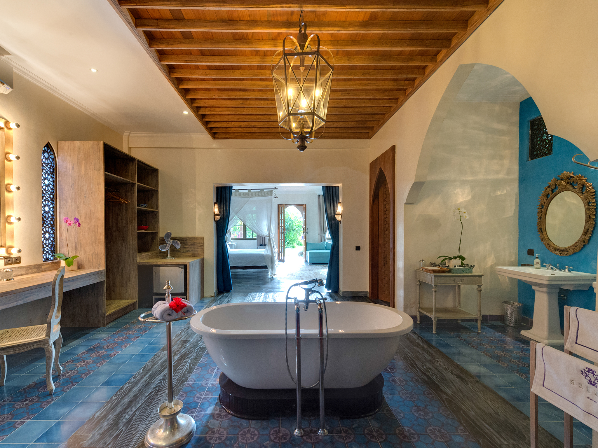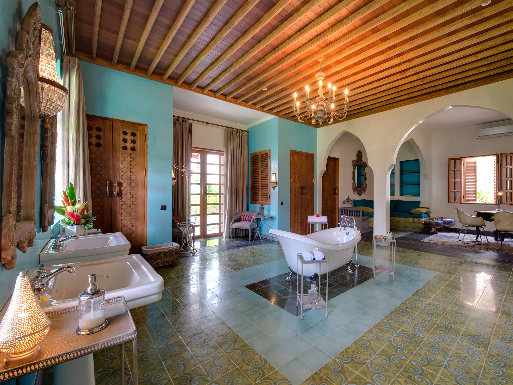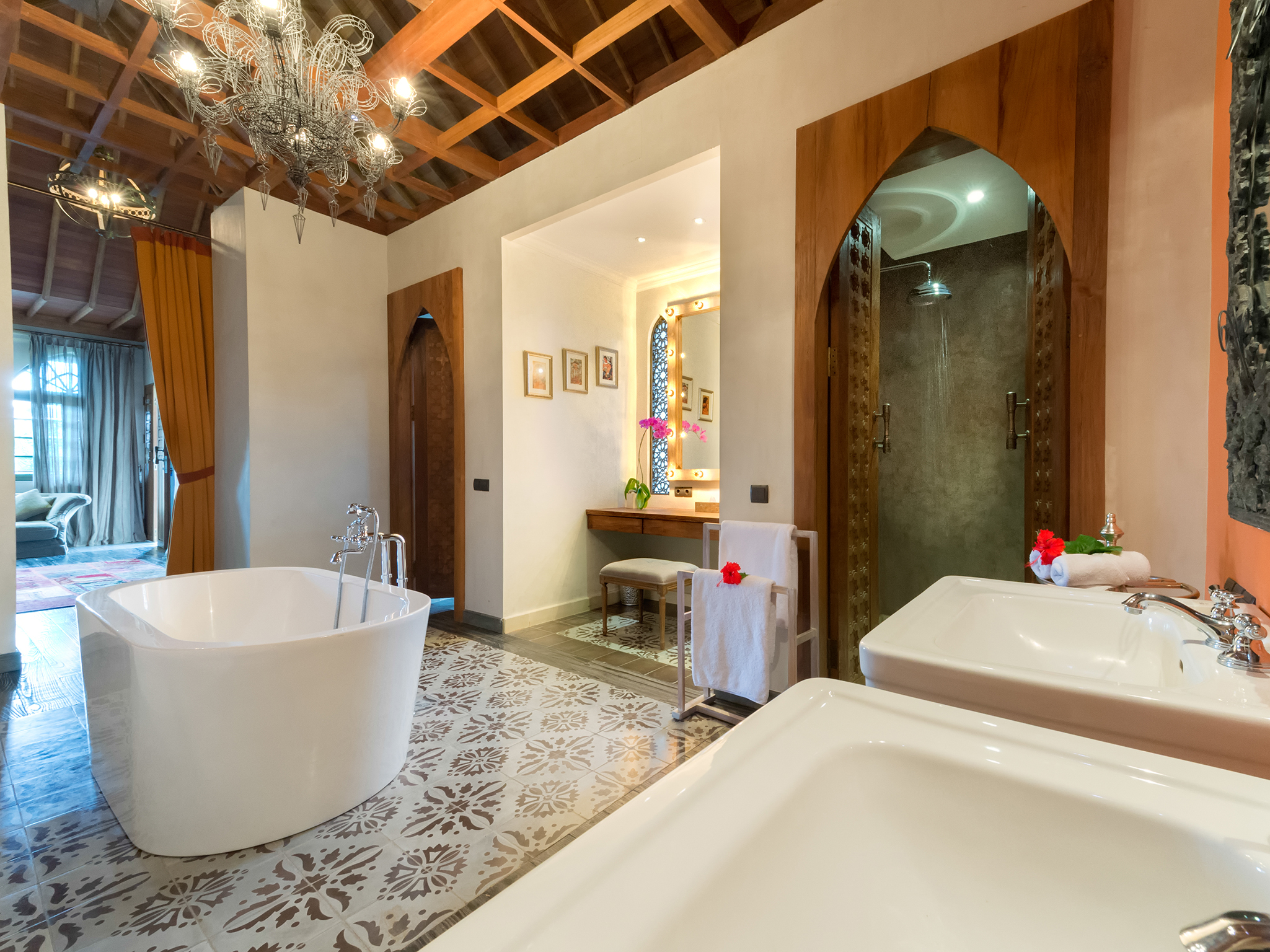 Two sets of double-leafed doors lead into each air-conditioned bedroom. Equipped with a 40-inch satellite-channel TV/DVD player, iPod dock, safe and mini-fridge, each room has a sleeping and sitting area, a dressing area and a bathroom. Bed configurations range from twin-queens in two of the rooms to king beds in the others. Each air-conditioned bathing area has a freestanding bathtub, twin pedestal washbasins, a walk-in rainshower and a toilet behind wooden doors. Bathroom floors blend floorboards and colourfully patterned Moroccan-style tiles. The master suite is enormous with several sitting areas and some fascinating artefacts.