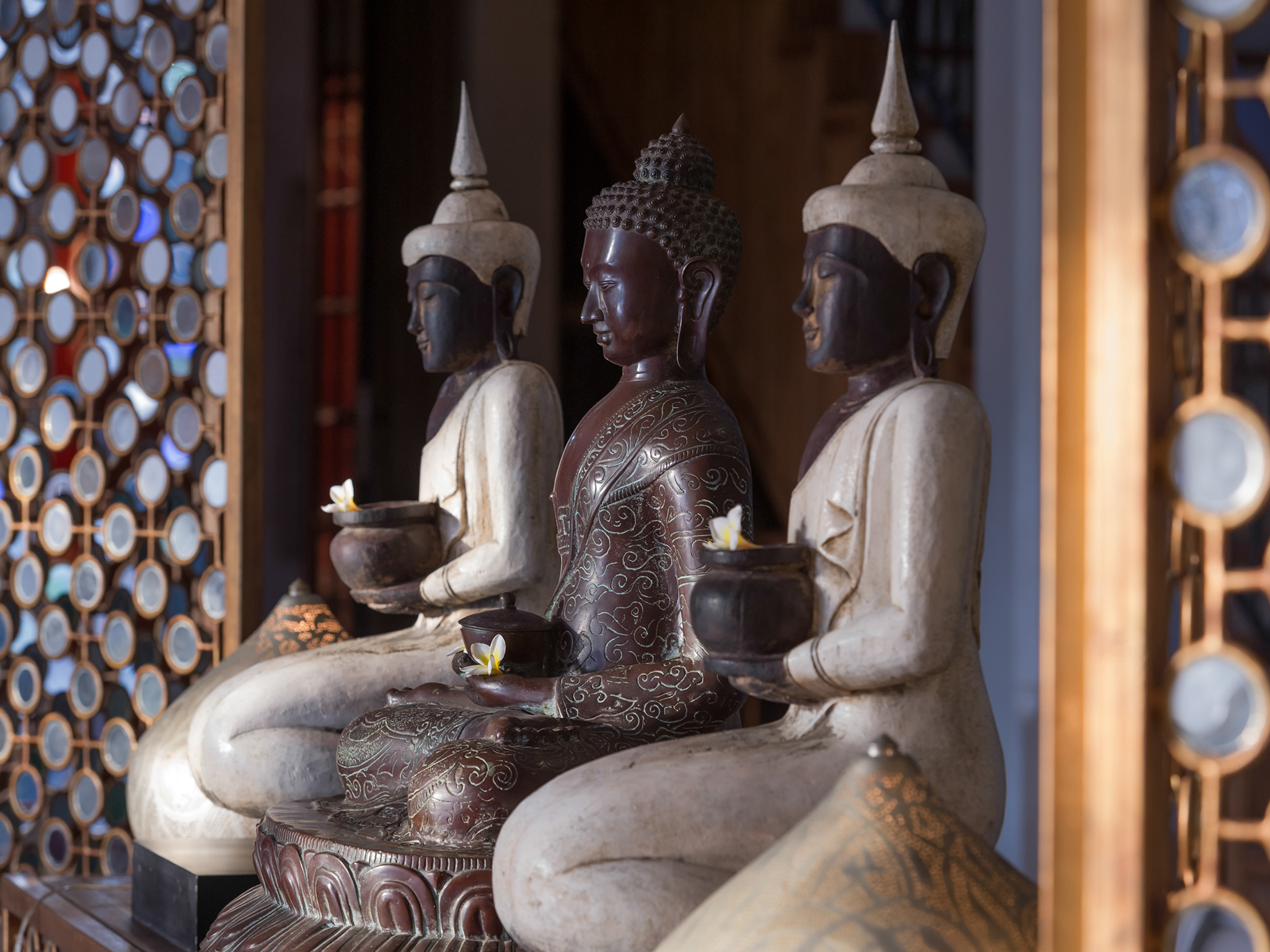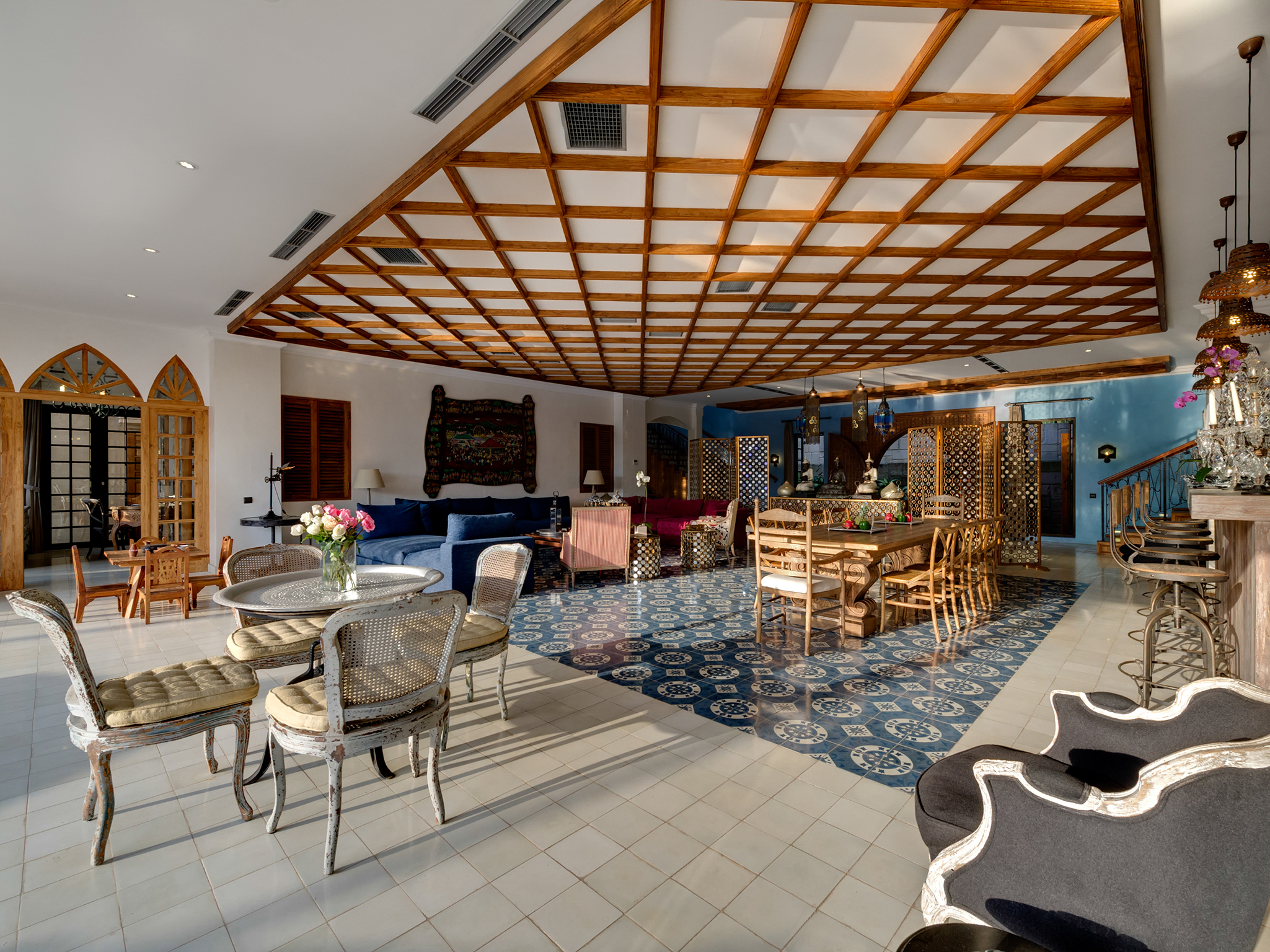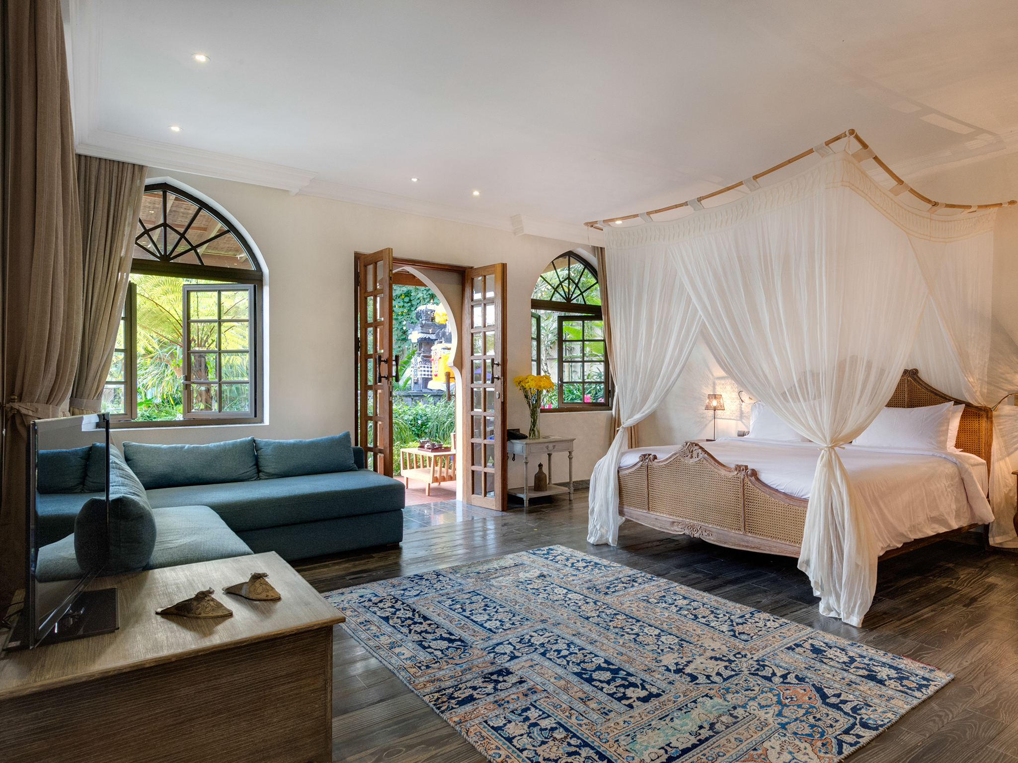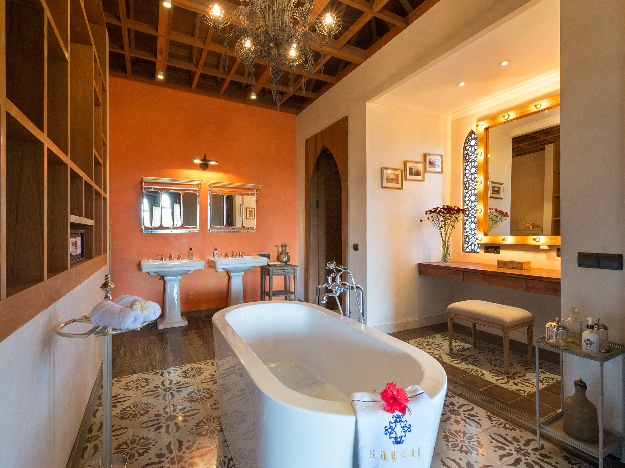 Two sets of double-leafed doors lead into each air-conditioned bedroom. Equipped with a 40-inch satellite-channel TV/DVD player, iPod dock, safe and mini-fridge, each room has a sleeping and sitting area, a dressing area and a bathroom. Bed configurations range from twin-queens in two of the rooms to king beds in the others. Each air-conditioned bathing area has a freestanding bathtub, twin pedestal washbasins, a walk-in rainshower and a toilet behind wooden doors. Bathroom floors blend floorboards and colourfully patterned Moroccan-style tiles. The master suite is enormous with several sitting areas and some fascinating artefacts.