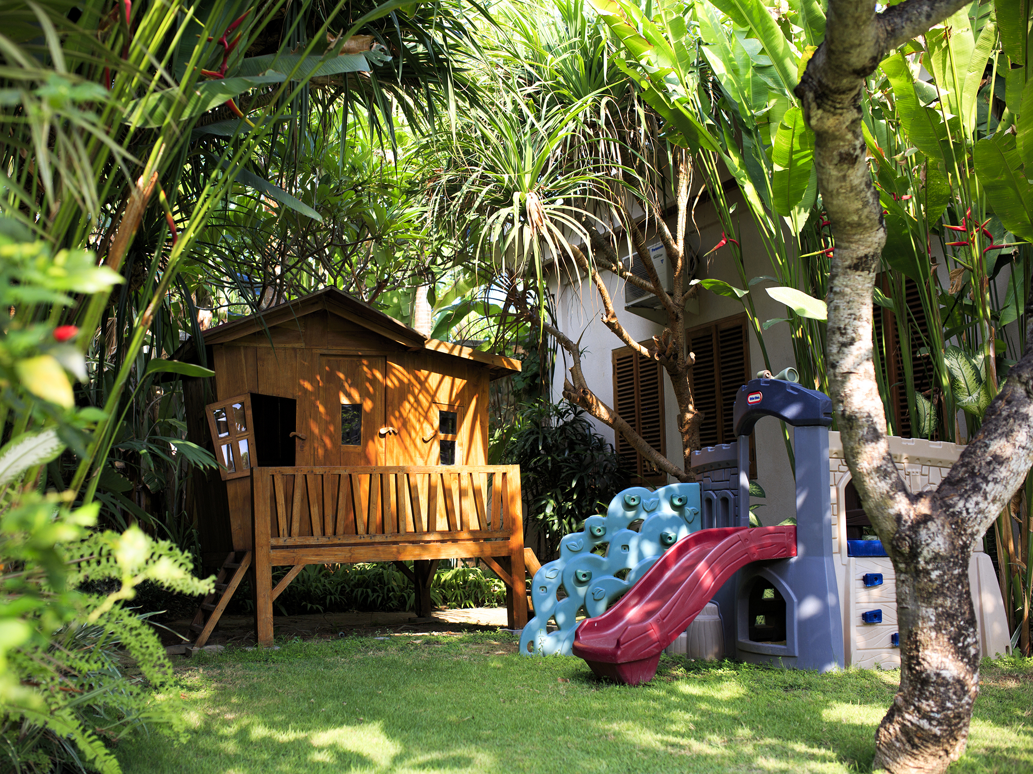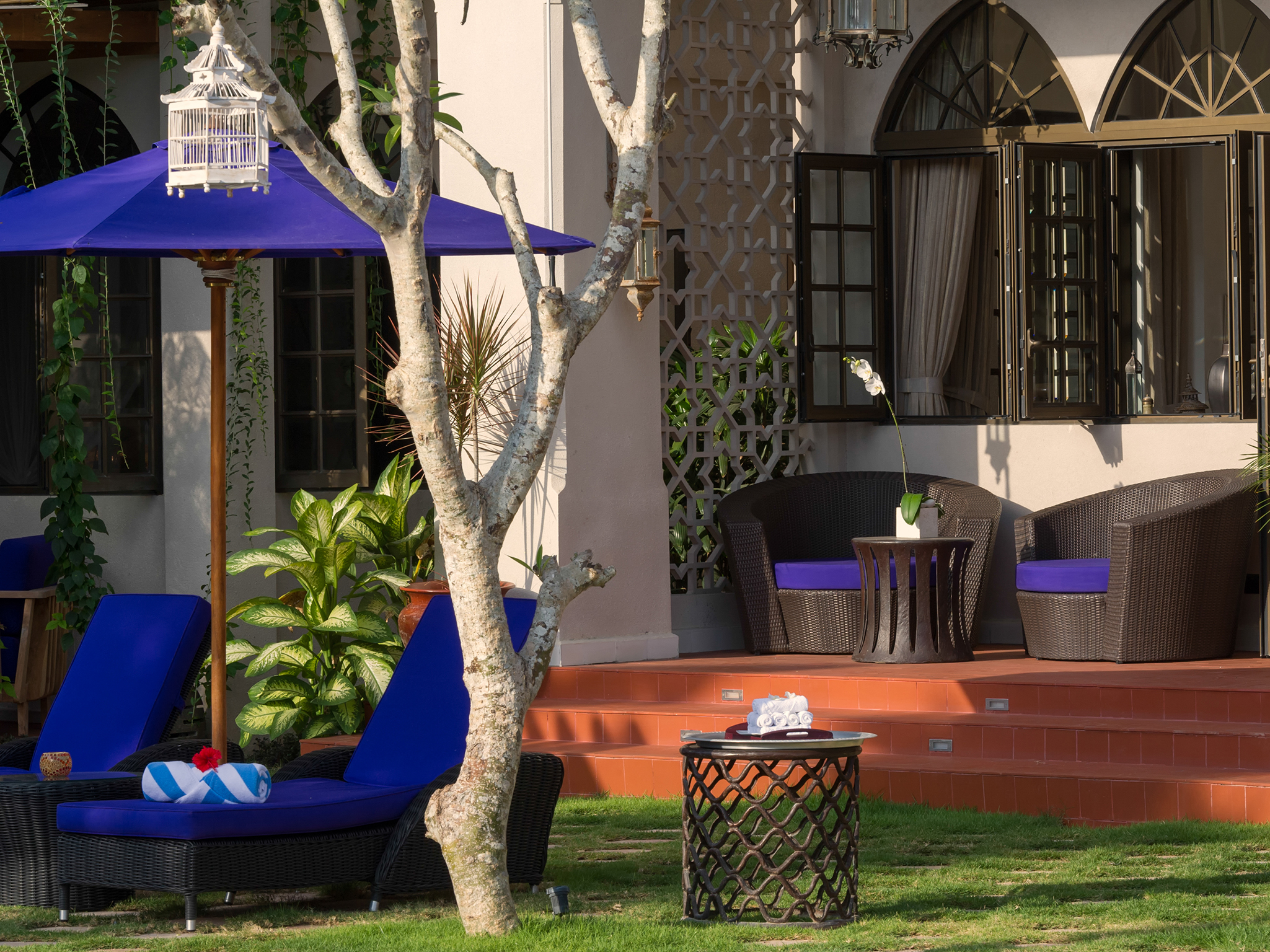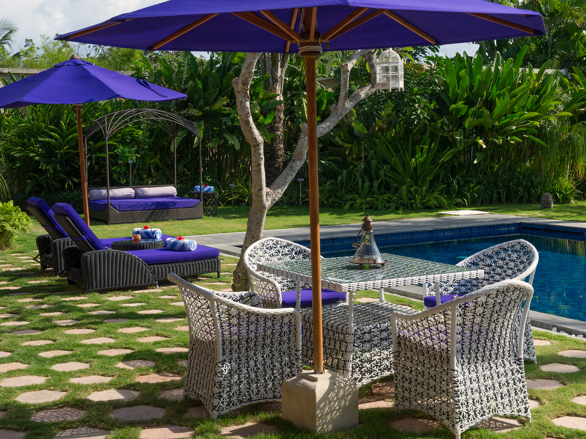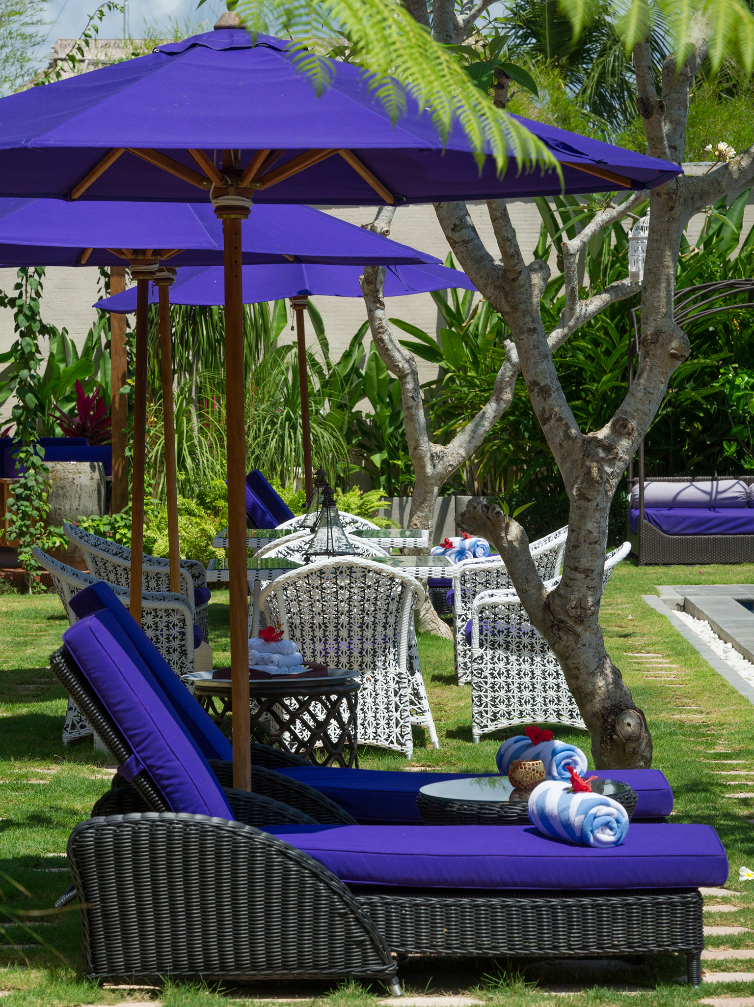 The expansive flat lawns are dotted with palms and filled with flowering trees and shrubs, with the swimming pool as the centrepiece. All-weather tables and chairs are arranged on one side of the pool, with purple cushions and purple umbrellas. Sunbeds await on the other side and each bedroom has a personal veranda, terrace or balcony furnished with more comfy purple-cushioned chairs. The pool has a kids’ area at one end, while a children’s wooden playhouse offers another place for fun.