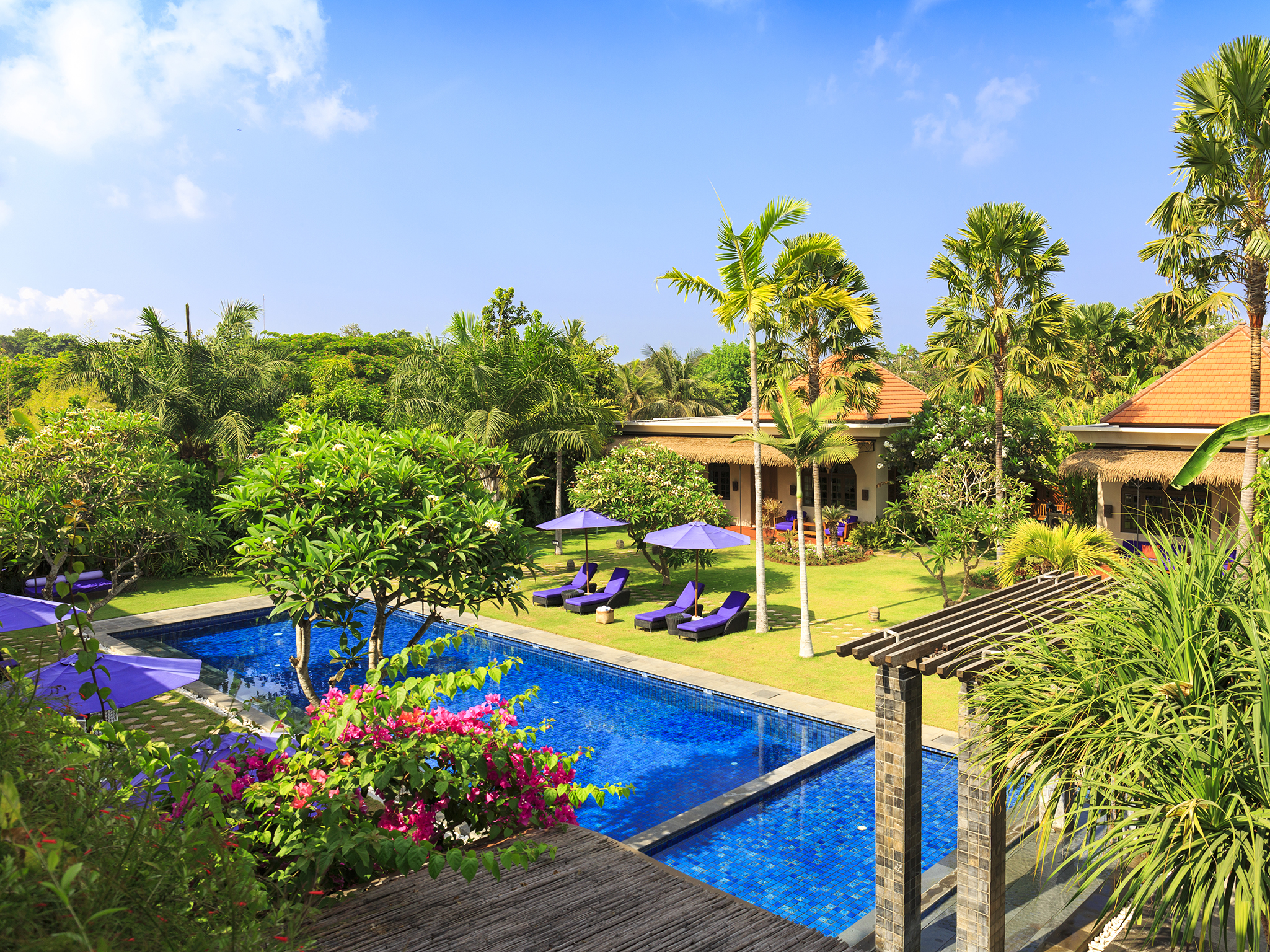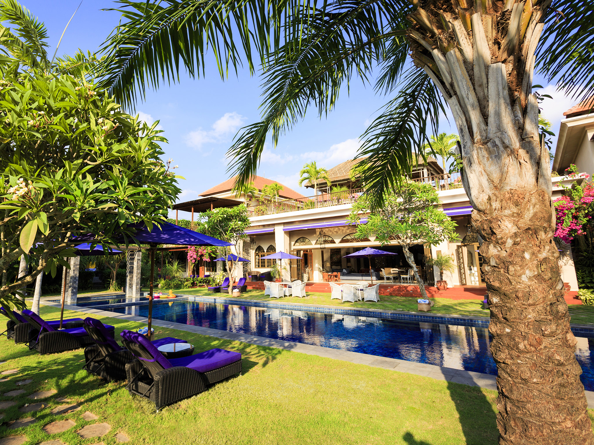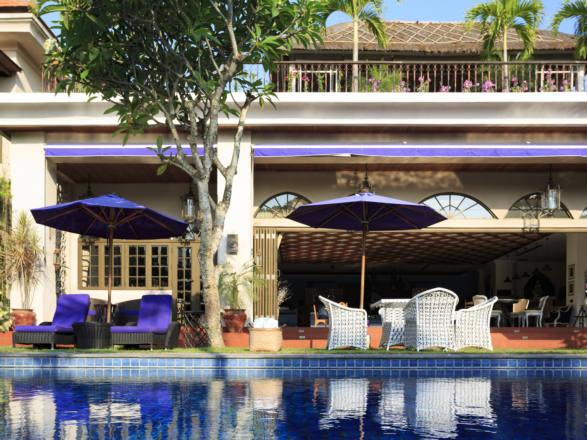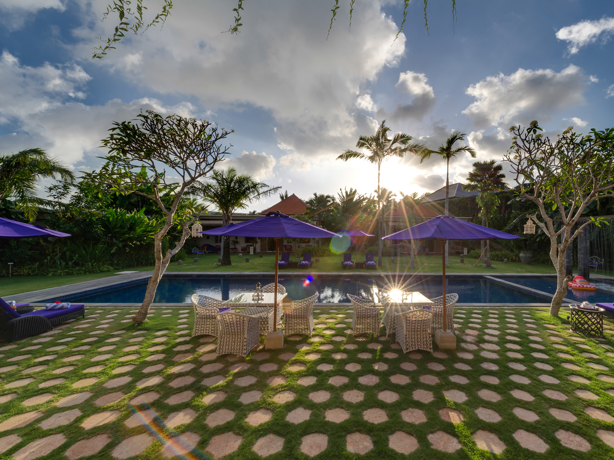 The expansive flat lawns are dotted with palms and filled with flowering trees and shrubs, with the swimming pool as the centrepiece. All-weather tables and chairs are arranged on one side of the pool, with purple cushions and purple umbrellas. Sunbeds await on the other side and each bedroom has a personal veranda, terrace or balcony furnished with more comfy purple-cushioned chairs. The pool has a kids’ area at one end, while a children’s wooden playhouse offers another place for fun.