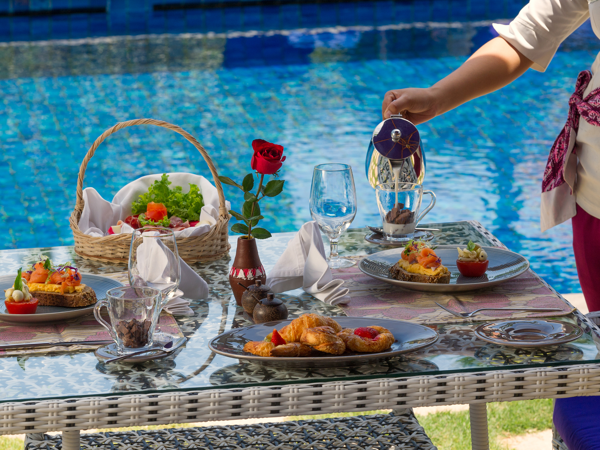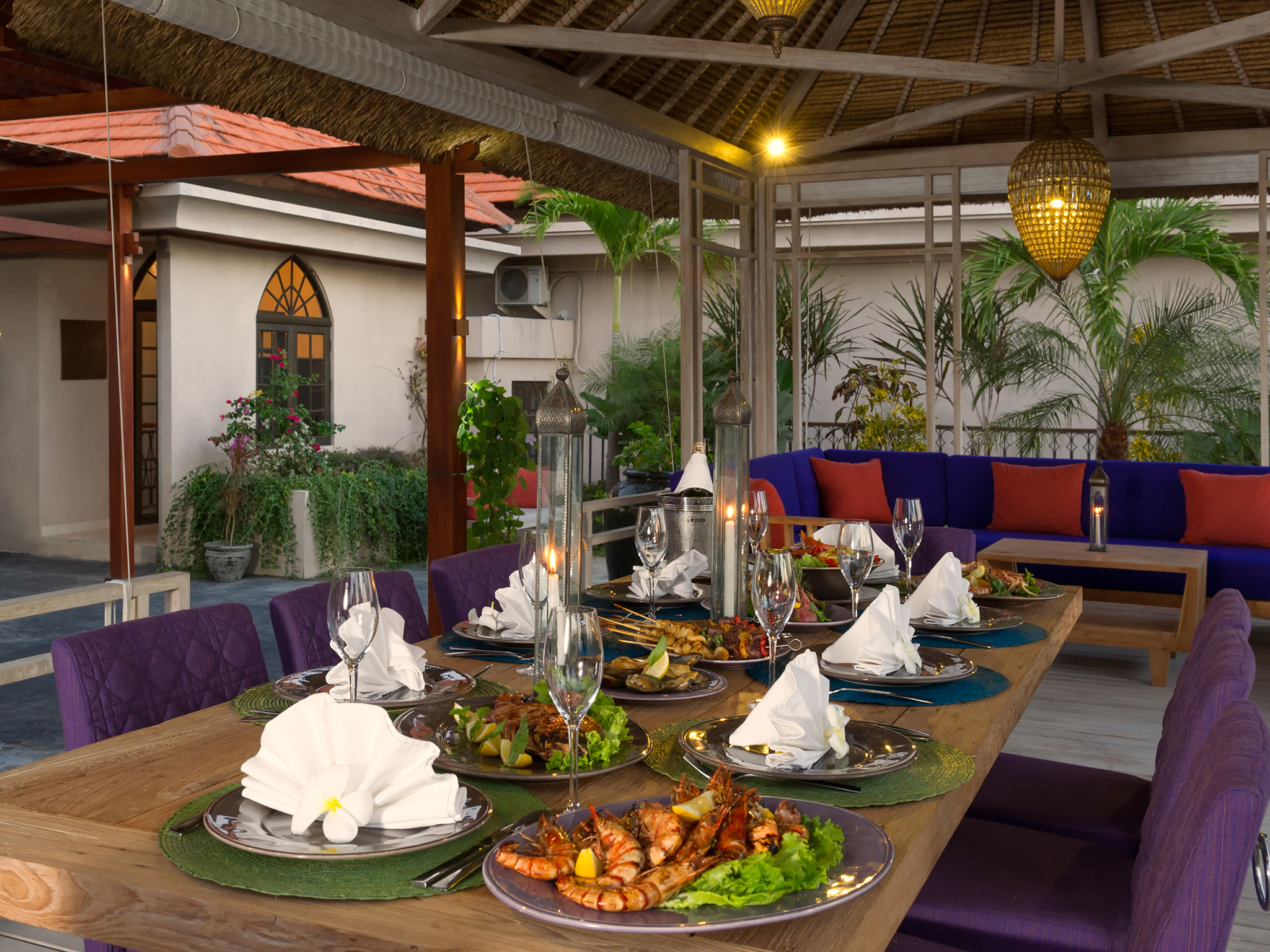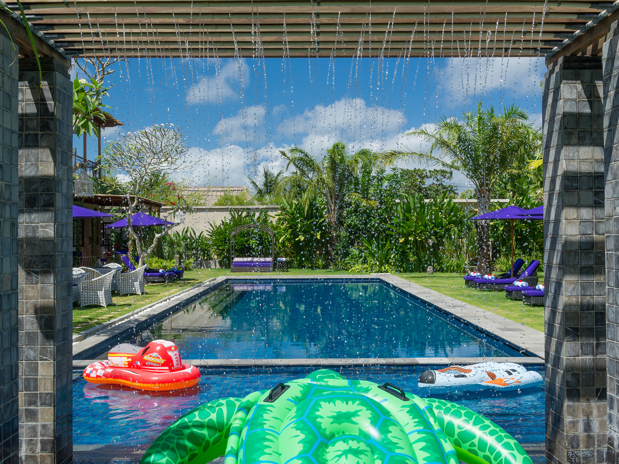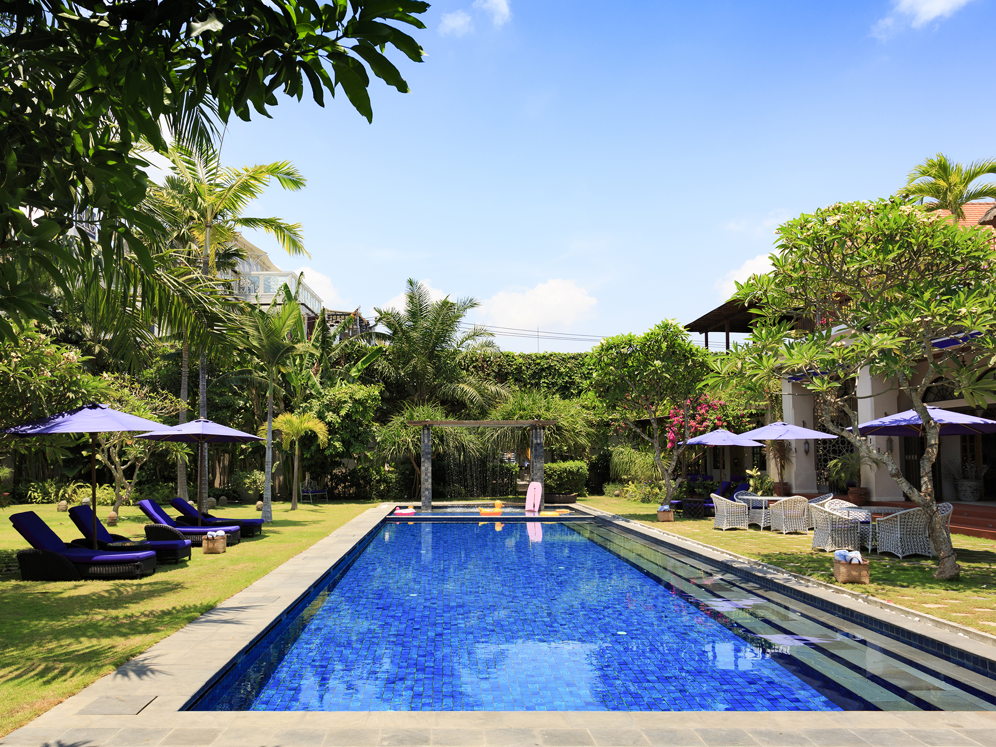 The expansive flat lawns are dotted with palms and filled with flowering trees and shrubs, with the swimming pool as the centrepiece. All-weather tables and chairs are arranged on one side of the pool, with purple cushions and purple umbrellas. Sunbeds await on the other side and each bedroom has a personal veranda, terrace or balcony furnished with more comfy purple-cushioned chairs. The pool has a kids’ area at one end, while a children’s wooden playhouse offers another place for fun.