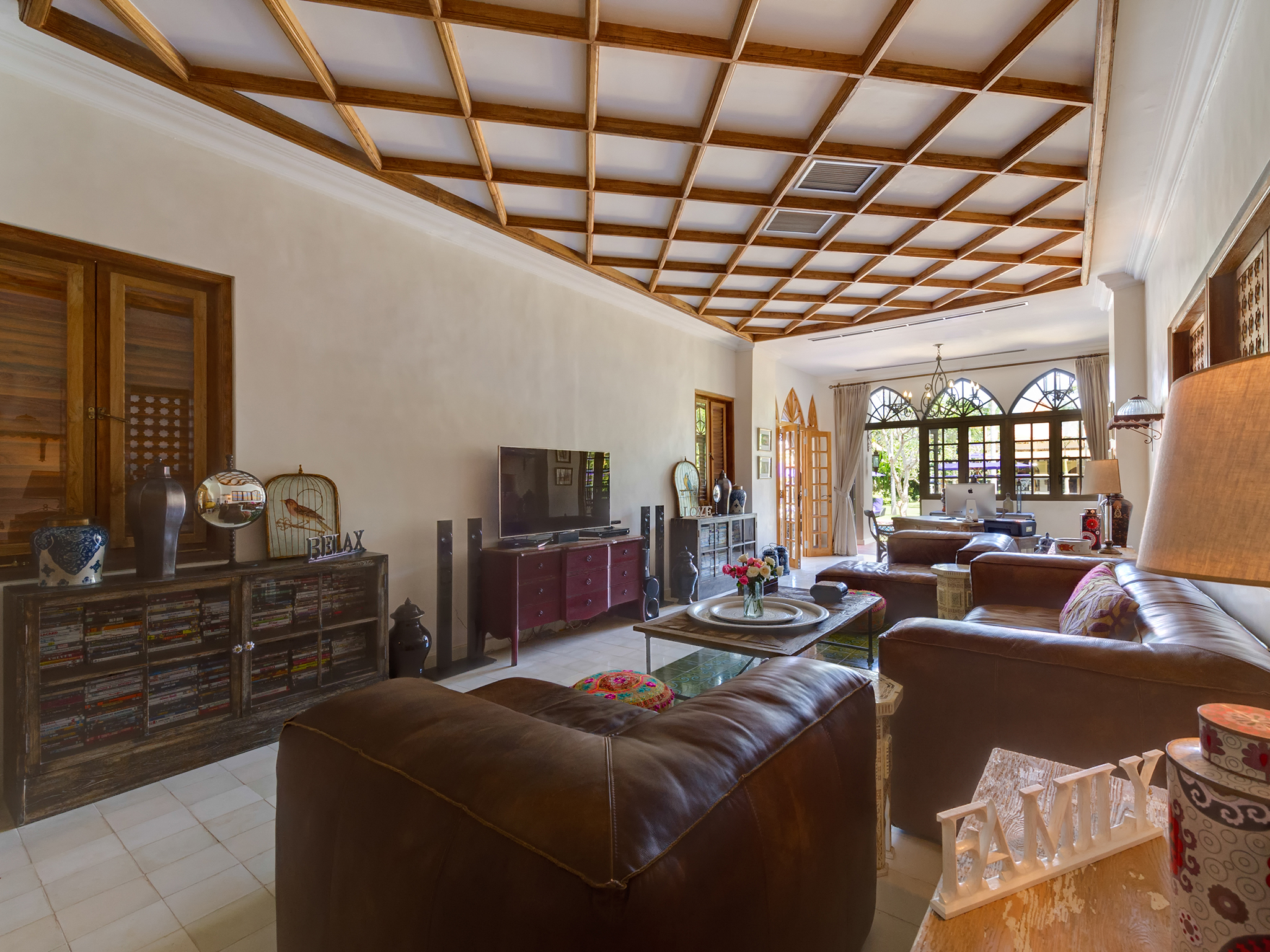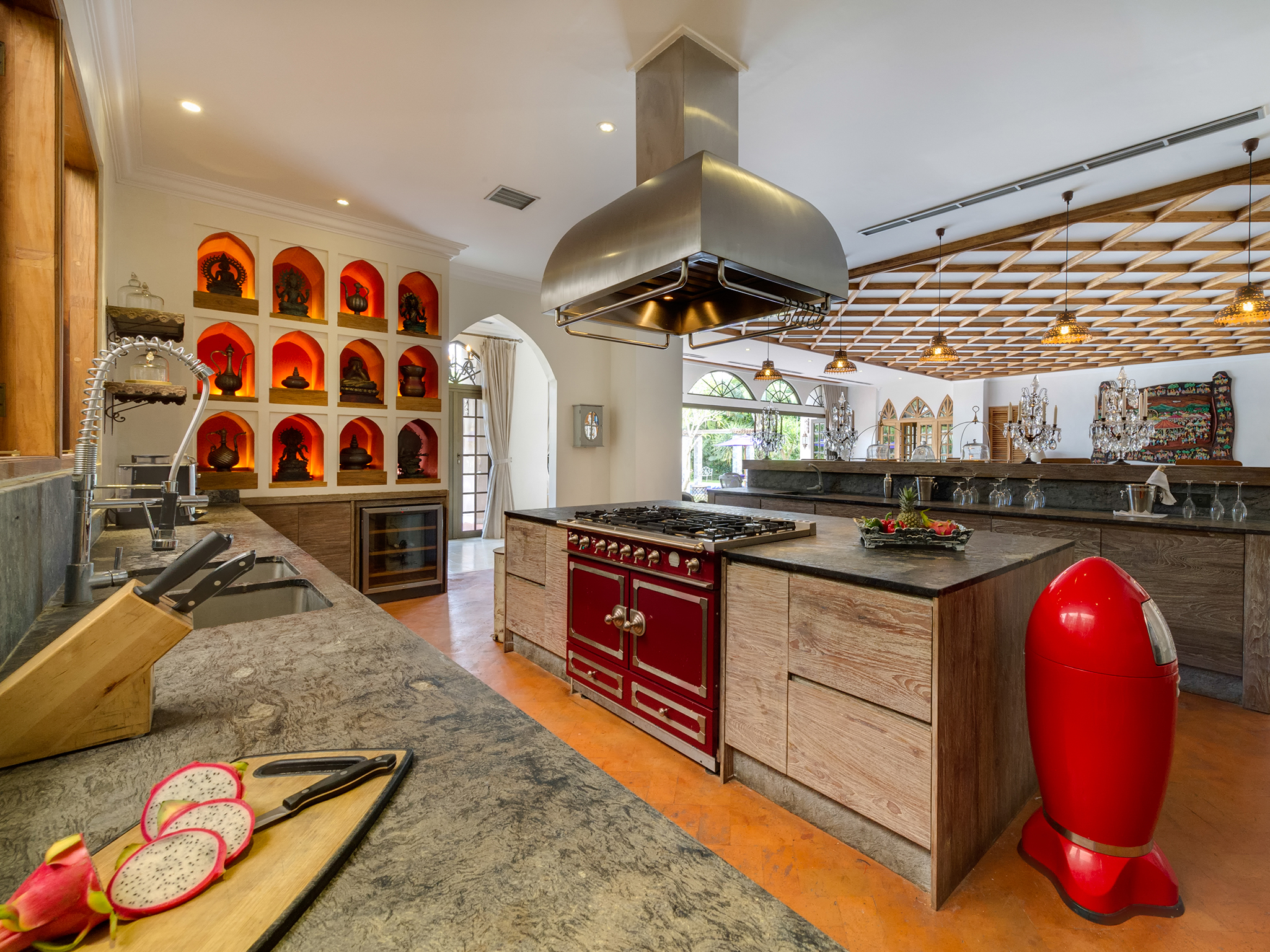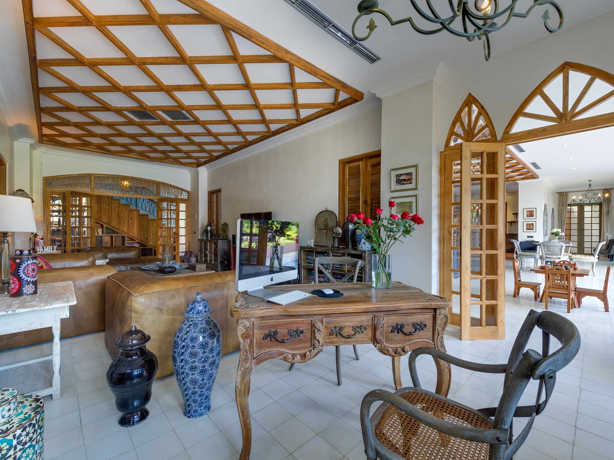 The living/dining room opens widely to the garden, but folding glass doors can be closed for air-conditioned comfort; this room features an eclectic choice of sitting areas including a kids’ table and chairs. A dining table for 12 is positioned on one side where there is also a kitchen service bar with five high bar chairs. The fully-equipped designer kitchen has a central island, oven, hobs and everything else the chef needs.