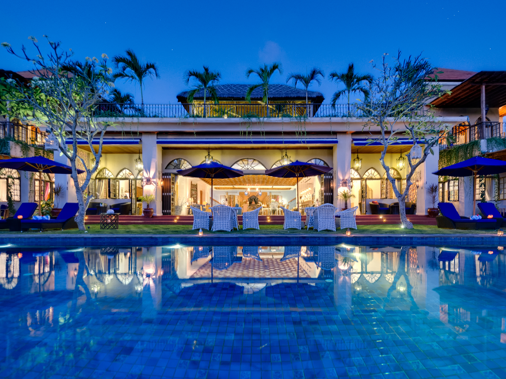The villa sits on 3,000sqm of land, and comprises three buildings arranged on two sides of a 20 x 6m pool. The main house incorporates a central living/dining room with integrated kitchen, and a separate, air-conditioned office/TV room with 56-inch TV/DVD player, a library of (mainly French) movies, deep leather sofas, and a desk with Apple Mac computer and scanner/printer/photocopier for guest use. Two staircases sweep up to a rooftop sunset lounge, where a thatched gazebo is furnished with a cushioned sofa and a table for alfresco dining. The area is protected by a wrought iron fence for safety. At each end of the main house are two double-storey sleeping pavilions (the upper floor bedrooms are accessible by both internal and external staircases). The two downstairs bedrooms are entered via private garden verandas. The remaining two bedrooms are housed in single-storey stand-alone pavilions on the opposite side of the pool.