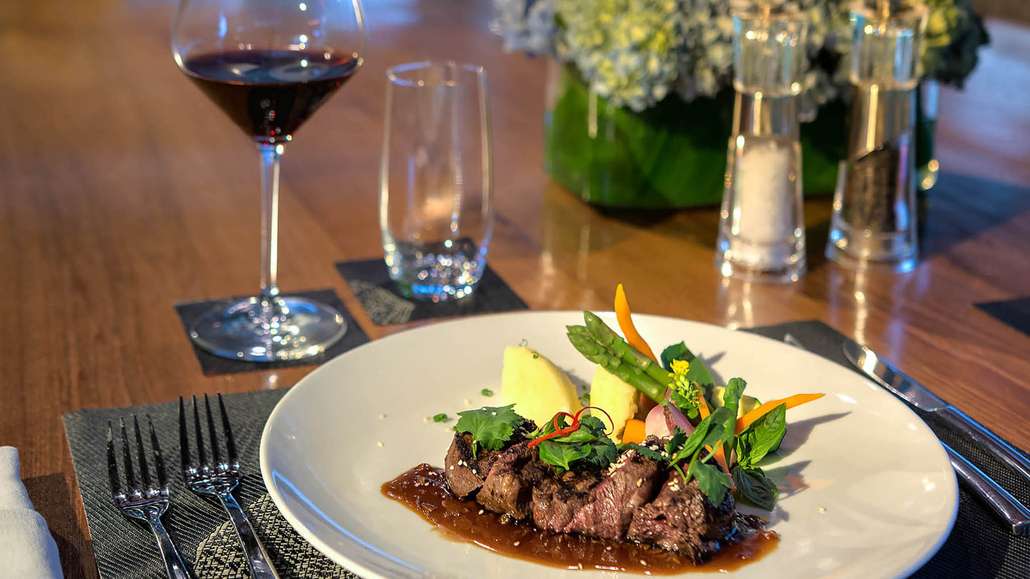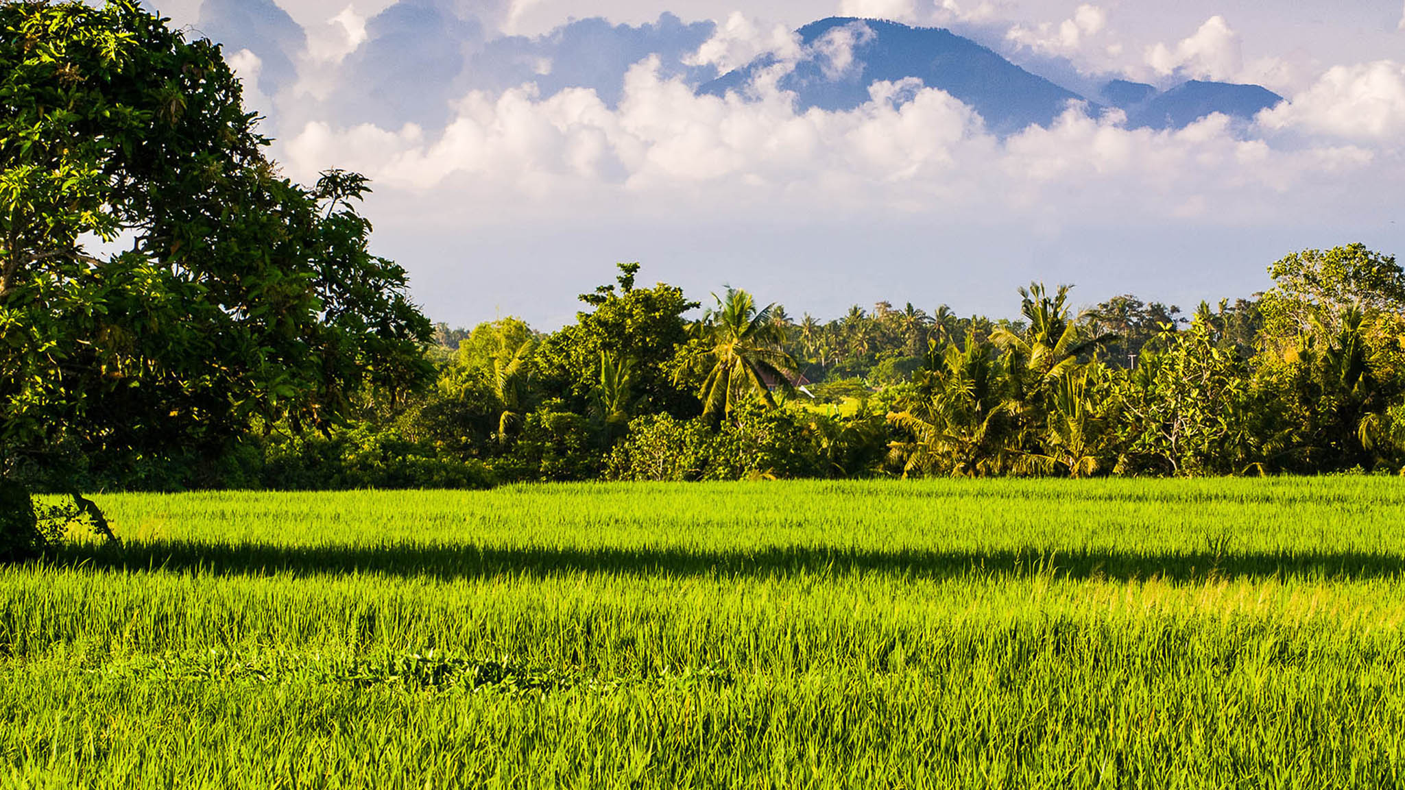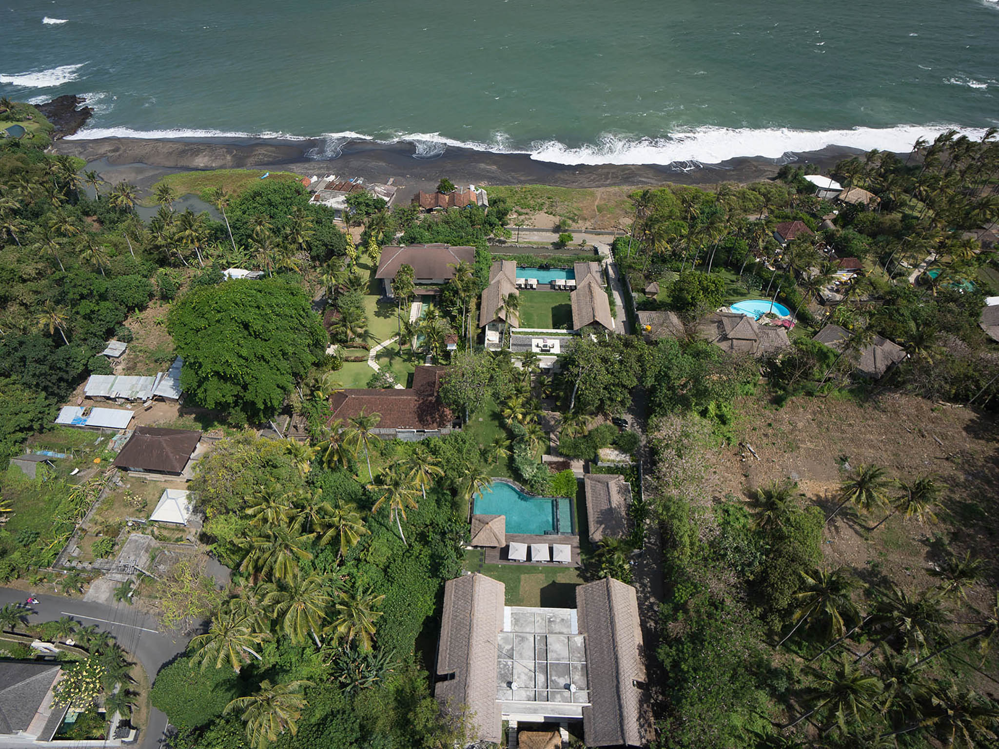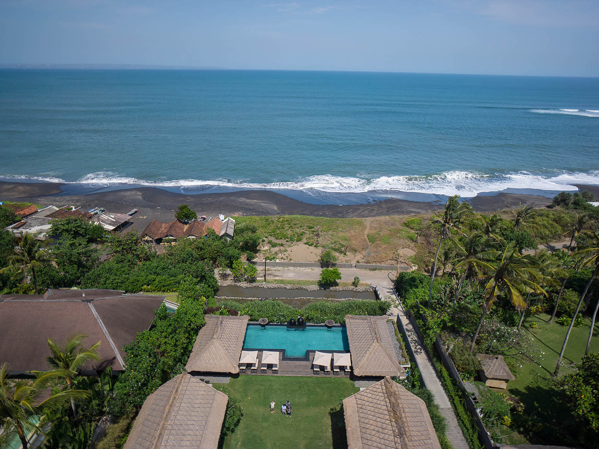 At Seseh Beach Villa, a thatched gateway opens to a pretty terraced garden, where wooden decking steps down to a goldfish pond and the villa’s main entrance. The villa’s rooms – almost all of which offer ocean views – are arranged in a symmetrical U-shape, with the living and dining room straddling two double-storey bedroom wings. Earthy tones, Asian ceramics and artefacts, a massive solid wood table (seats 12) and two deep, comfortable sofas define the living and dining room. Copper kettle lamps hang over a bar counter at one end and a 70-inch TV screen set into display shelving at the other.