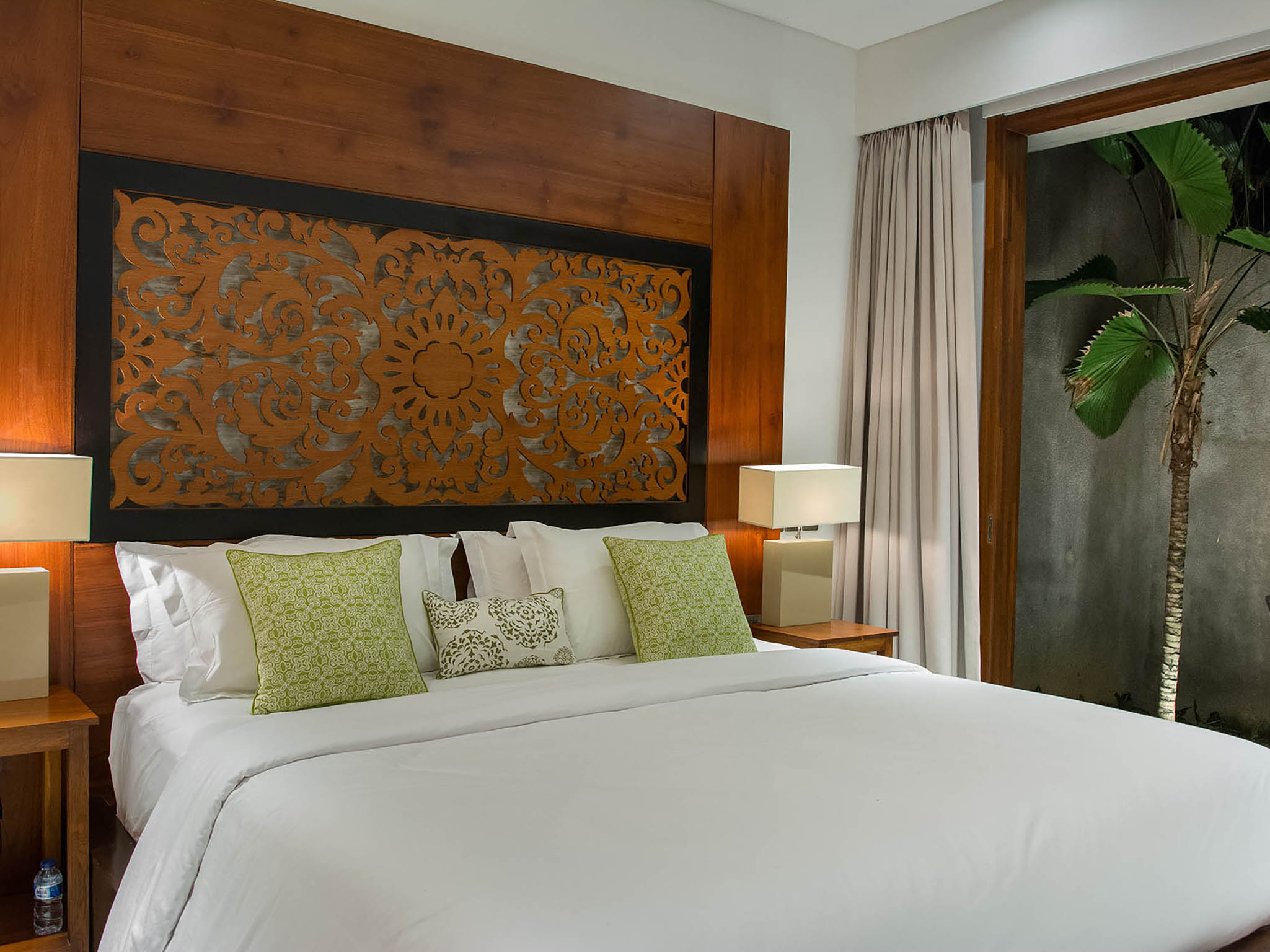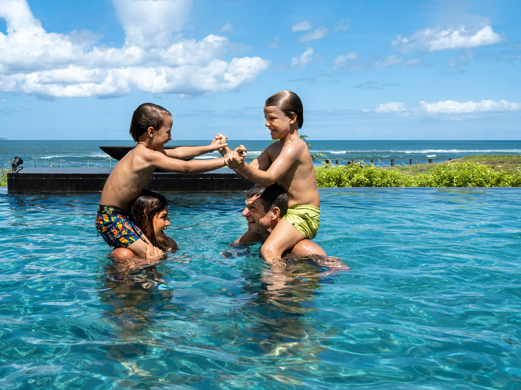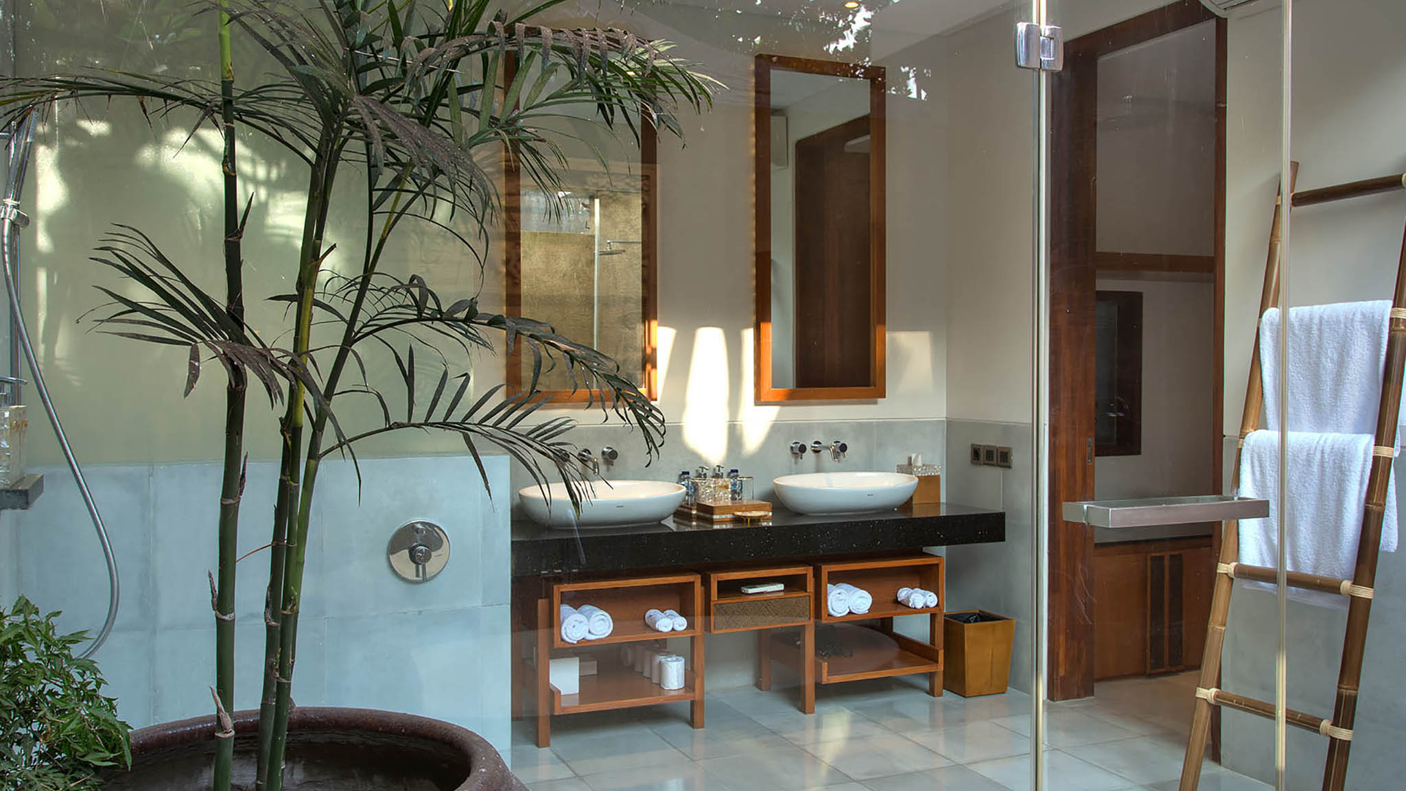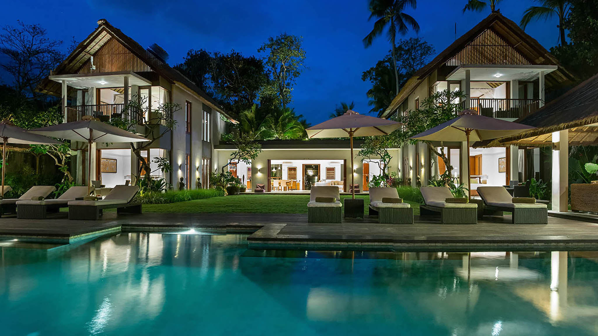balé pavilions – one housing comfortable rattan sofas arranged around a 60-inch TV (discreetly hidden behind carved teak screens), the other furnished with a 12-seater dining table for relaxed poolside meals. Two handy guest washrooms are tucked behind. These