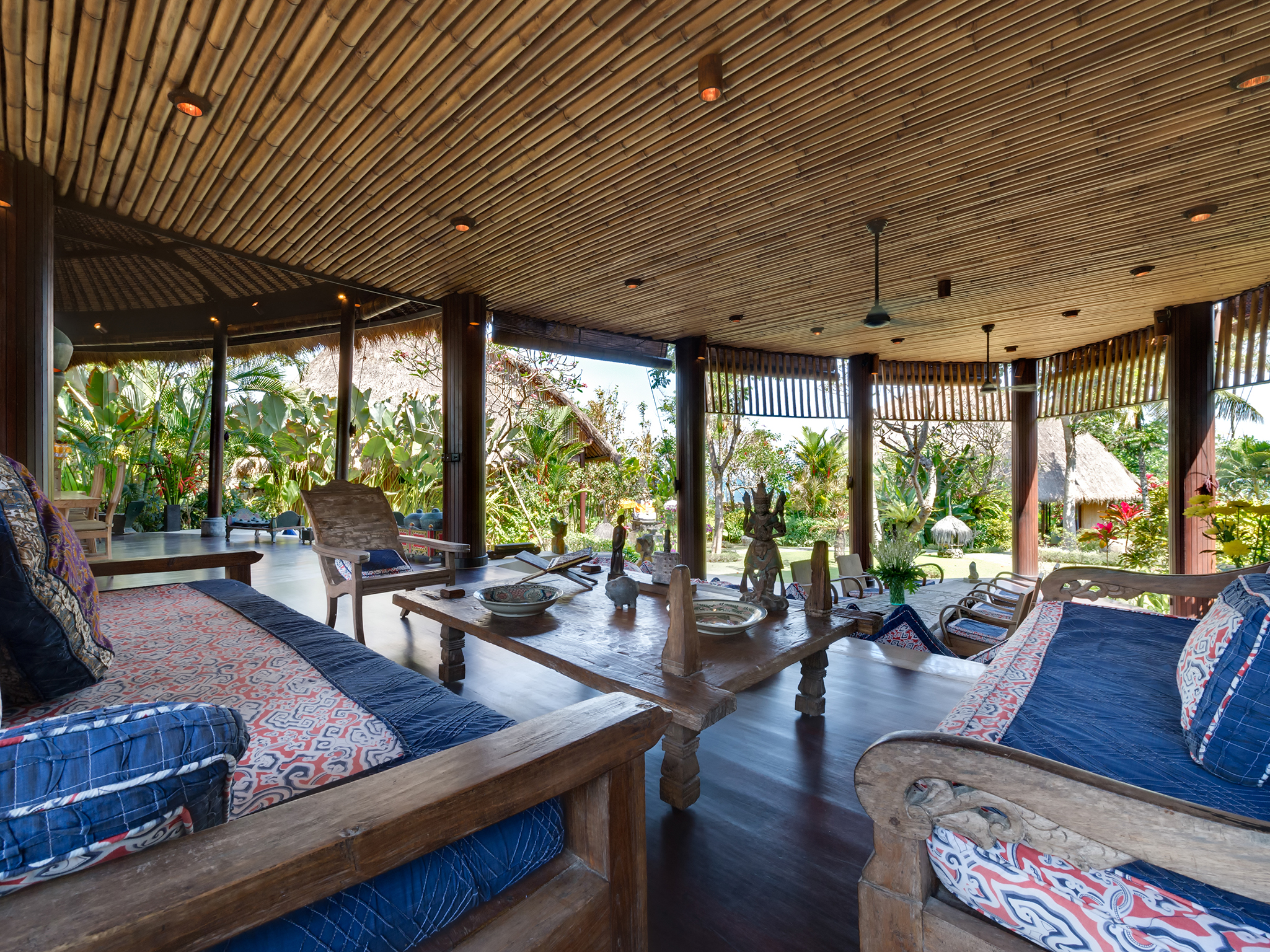 Guests enter Taman Ahimsa through an intriguing two-storey pavilion, evocative of a boat. This building is open-sided at ground level, facing the garden, with an elevated area furnished with antique daybeds and a lower section presenting a pair of built-in couches and an open-air timber deck with a frangipani tree growing through the floor. An antique window panel frames a service hatch into a fully equipped kitchen, adjacent to which is a huge, 16-seater dining table.