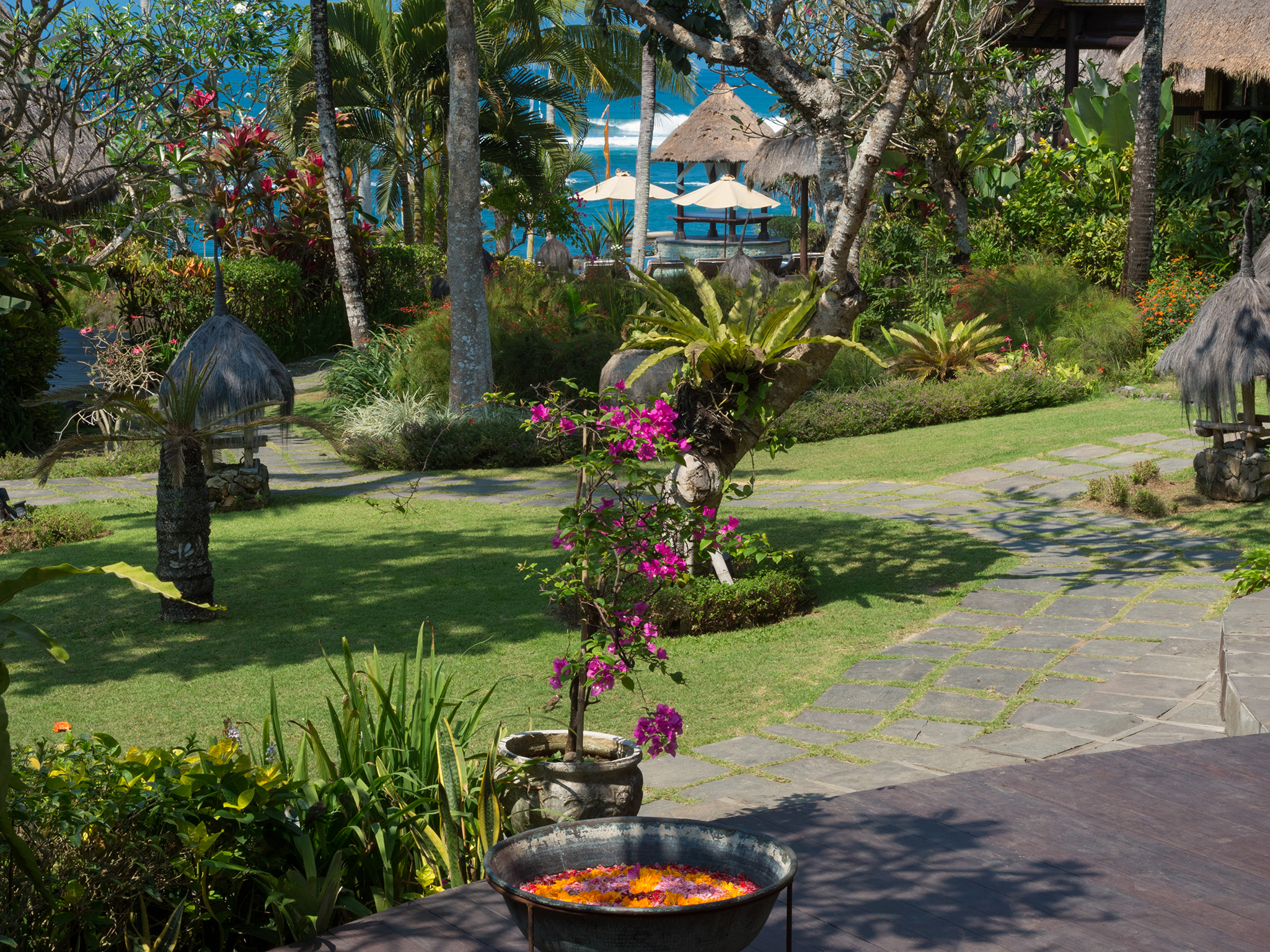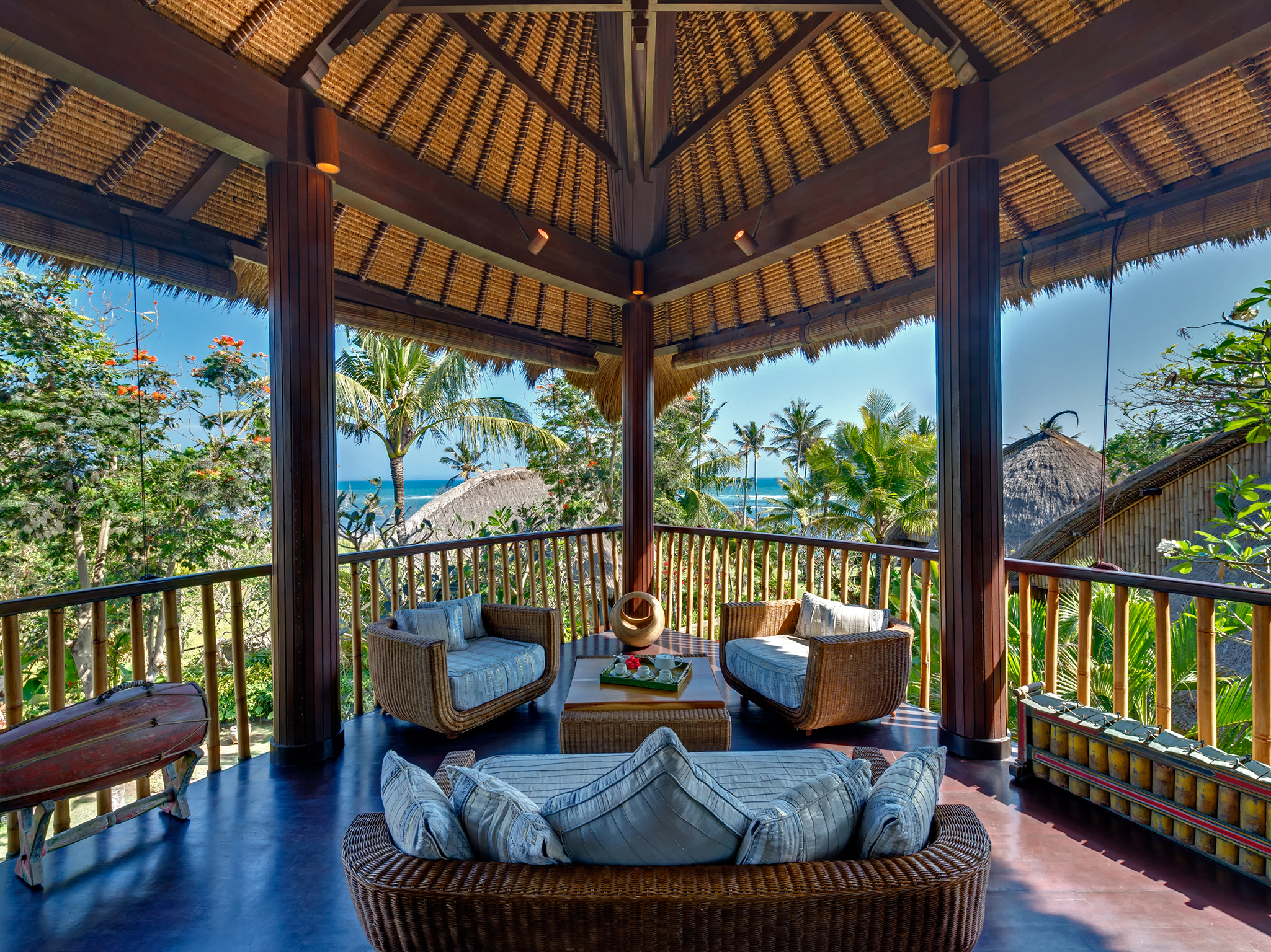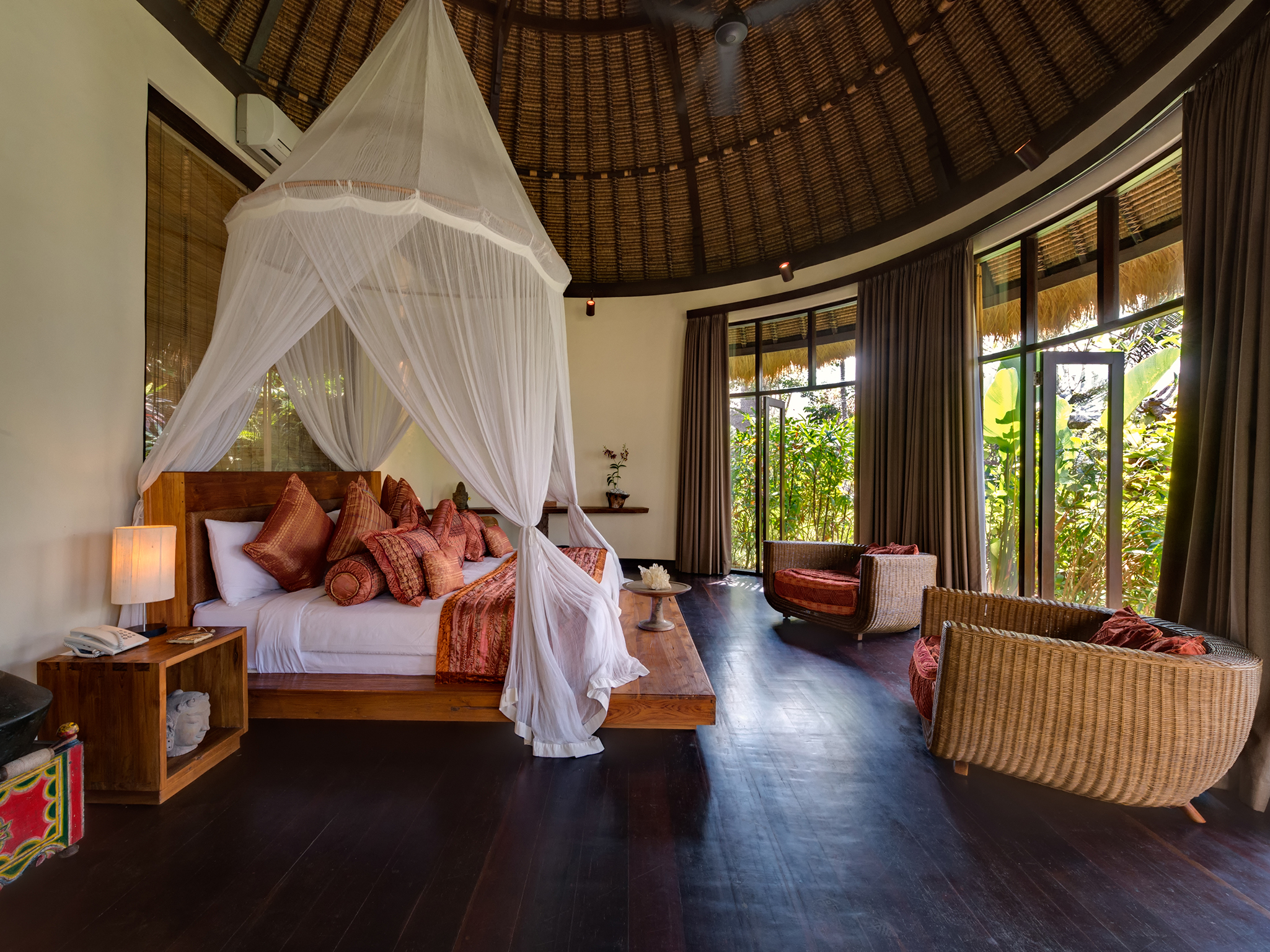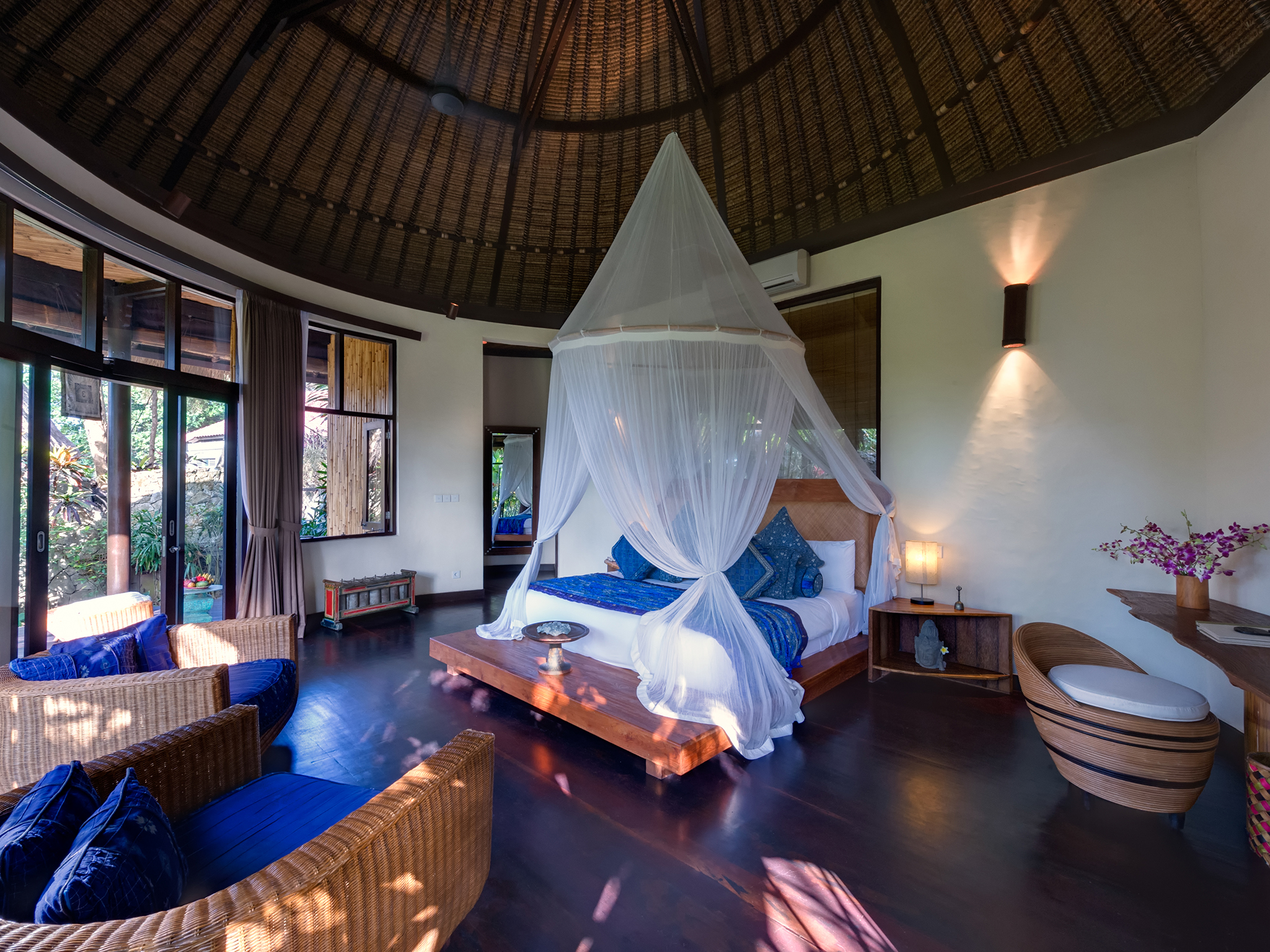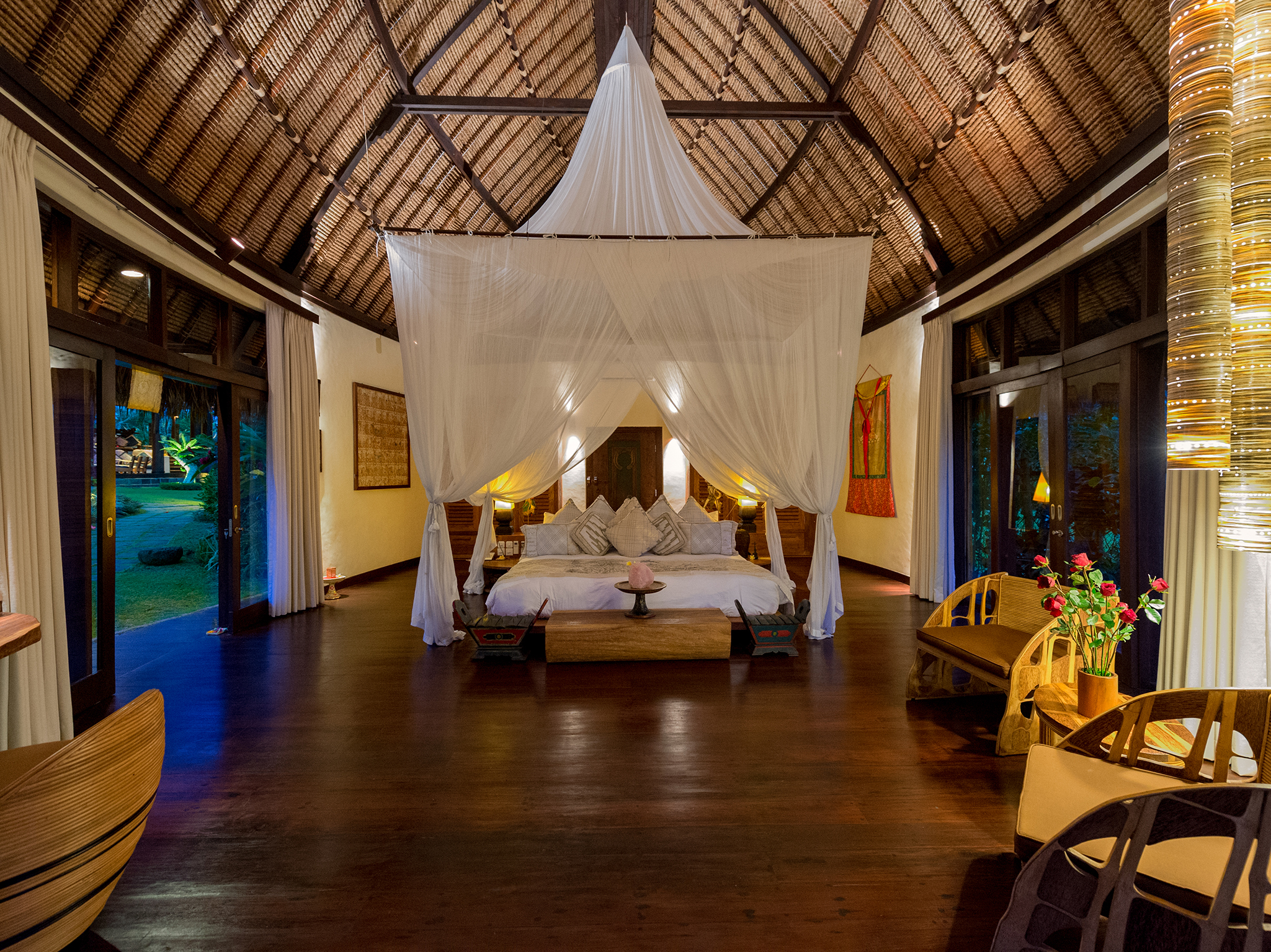 A solid wood staircase leads up to two air-conditioned bedrooms, one of which is a master room complete with an adjoining lounge with comfortable rattan furnishings and a 37-inch TV/DVD player. This is an ideal family area, reminiscent of a tree house, with stunning views from two balconies that are linked by a bridge. Kids love it! Both bedrooms are furnished with king beds, and have ensuite bathrooms fitted with terrazzo bathtubs, river rock washbasins, and walk-in rain showers. There are five more air-conditioned bedrooms dotted throughout the garden; all have dressing areas with fitted wardrobes and a safe; Tibetan hand-painted