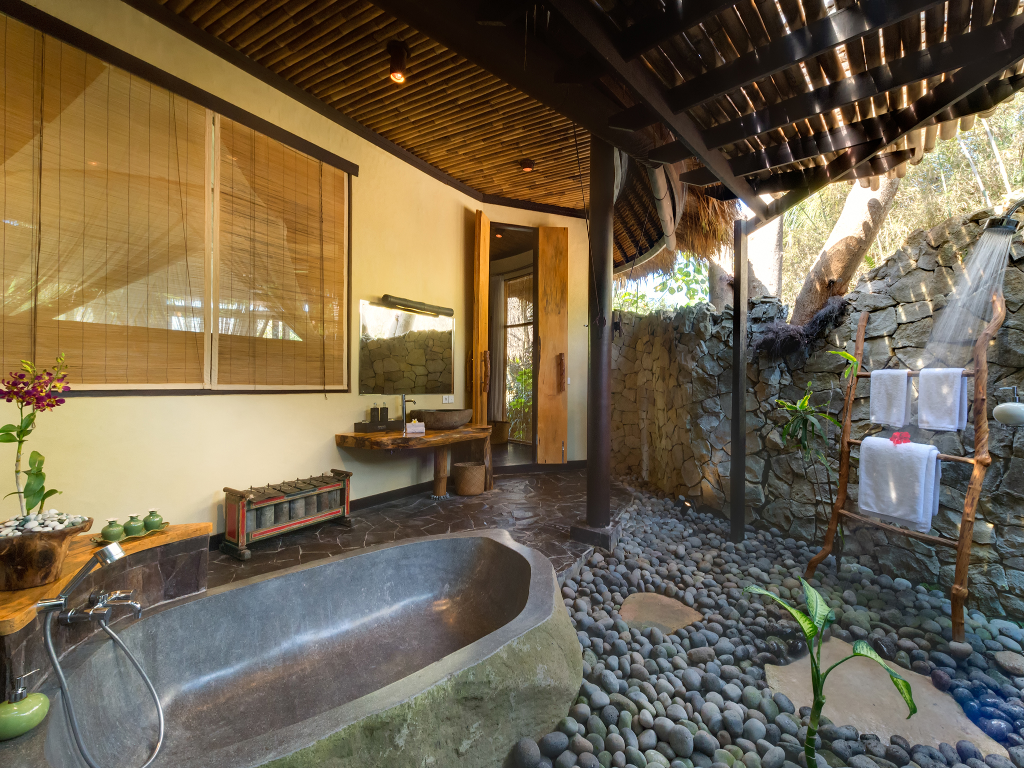 mandala thankas (Buddhist banners) adorn the walls, and boldly coloured cushions and bed linens are fashioned in a handmade patchwork of fabrics and stitching. Each garden bedroom is furnished with a king bed, and adjoined by a romantic, semi open-air bathroom with lots of recycled solid wood and stone features, including hollowed-out river rock tubs, washbasins, and rain showers bordered by small walled gardens. The garden master bedroom is another boat-shaped structure, accessed via a wooden bridge over a pond and furnished with a huge (2.3m-wide) bed. No bedroom is overlooked by the other buildings; each has a private terrace, bordered by short hedges and shrubs.