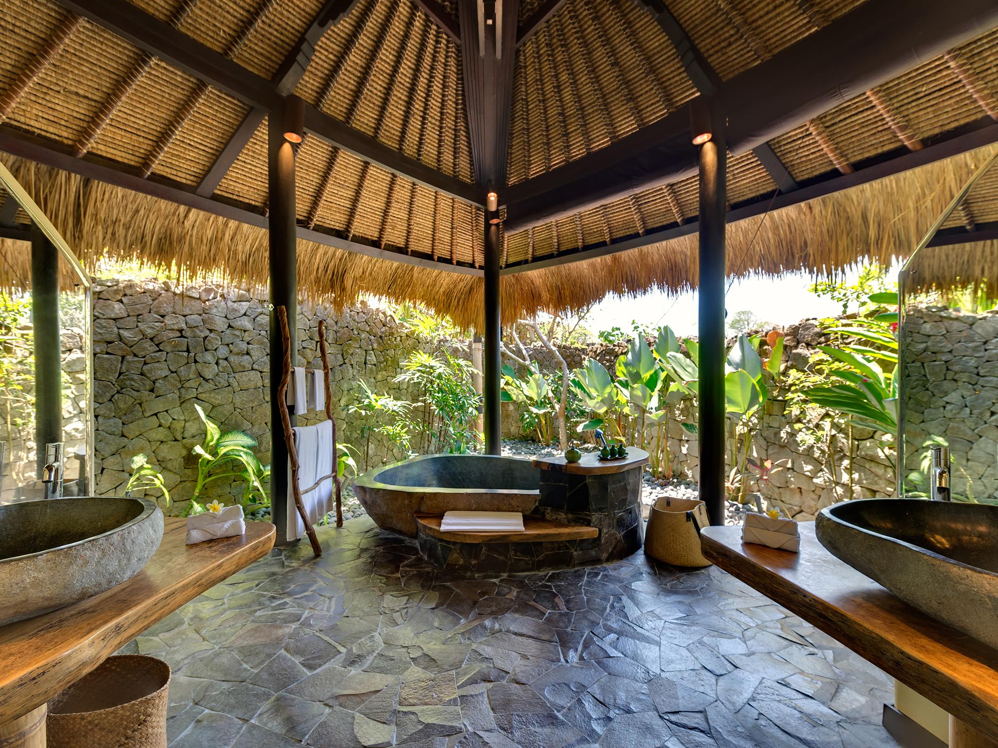The 18m freeform swimming pool is flanked by an ironwood deck furnished with sun beds and umbrellas. This area is a social hub; the large pool pavilion with raised timber floor and bar, glass-topped tables and bamboo chairs is ideal for casual al fresco dining, and doubles as a yoga studio. Alongside the pool is a conical bale (gazebo) and in a nearby corner of the garden is a raised massage pavilion with antique wooden panelling.