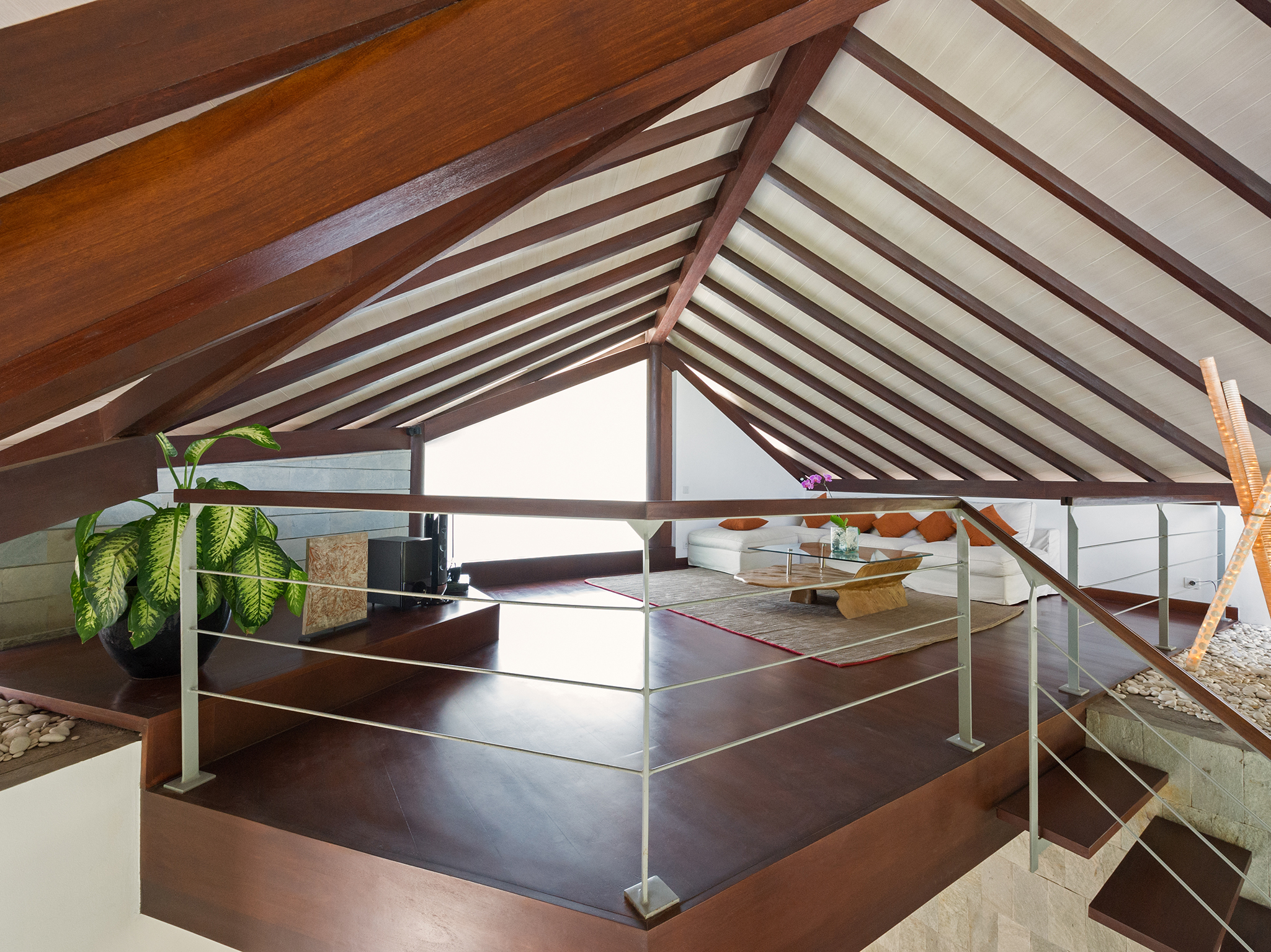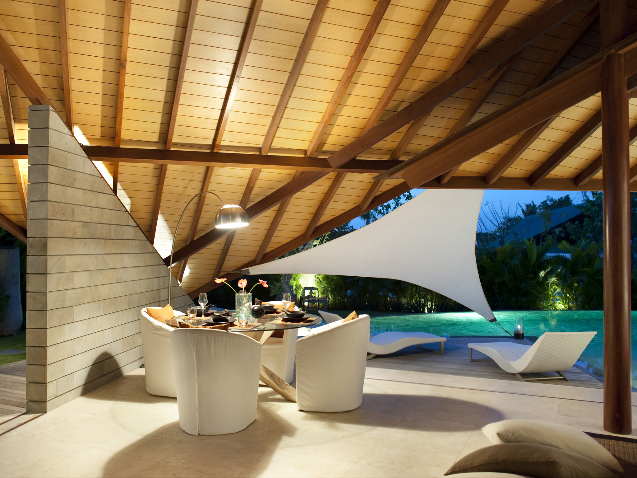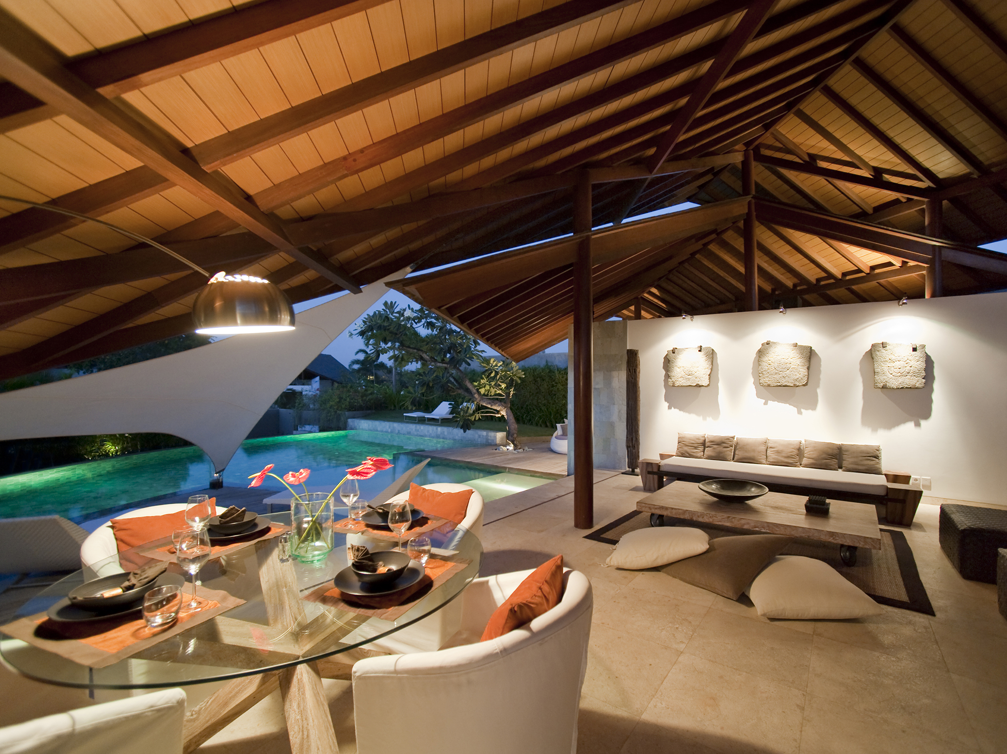 The seven two-bedroom villas at The Layar each lie among lush private gardens and are designed over multiple levels under angled, overlapping roofs. Their semi-open-air, fan-cooled living and dining spaces spread generously from pool decks, past large, well-equipped kitchens and, via open stairways, up to mezzanine media rooms tucked neatly below the sweeping roof line, where curved banks of built-in seating gaze towards the pool.