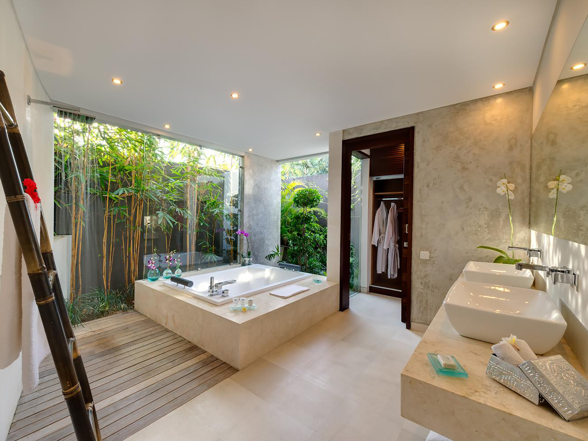 Two air-conditioned ensuite bedrooms are arranged on either side of the living area; both are exceptionally spacious and private and are fitted with king-size beds, sitting areas and flat-screen TVs. As in the living space, colour schemes are softly muted and soothing. Master bedrooms have sliding doors onto either a small deck or private corner of the garden. In both bedrooms, glamorous bathrooms with private garden areas are fitted with large bathtubs, showers and double vanities.