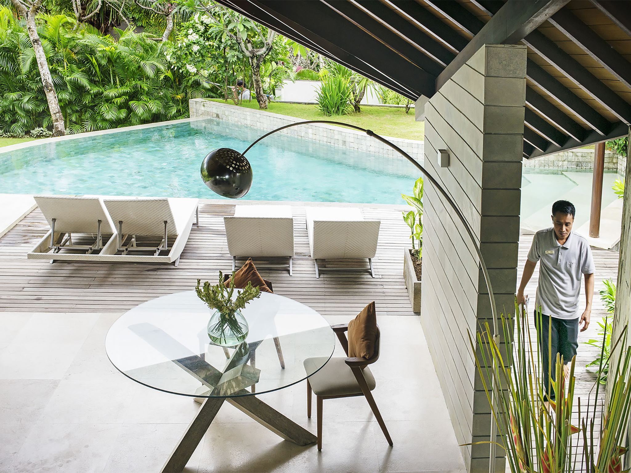 The light-flooded living and dining areas form the heart of the villas.  Handsome furniture sits atop acid-washed marble floors that flow from the edge of the pools to raised areas of polished Merbau-wood opening onto well-equipped kitchens.  Four of the three-bedroom villas also boast a mezzanine level media room.
