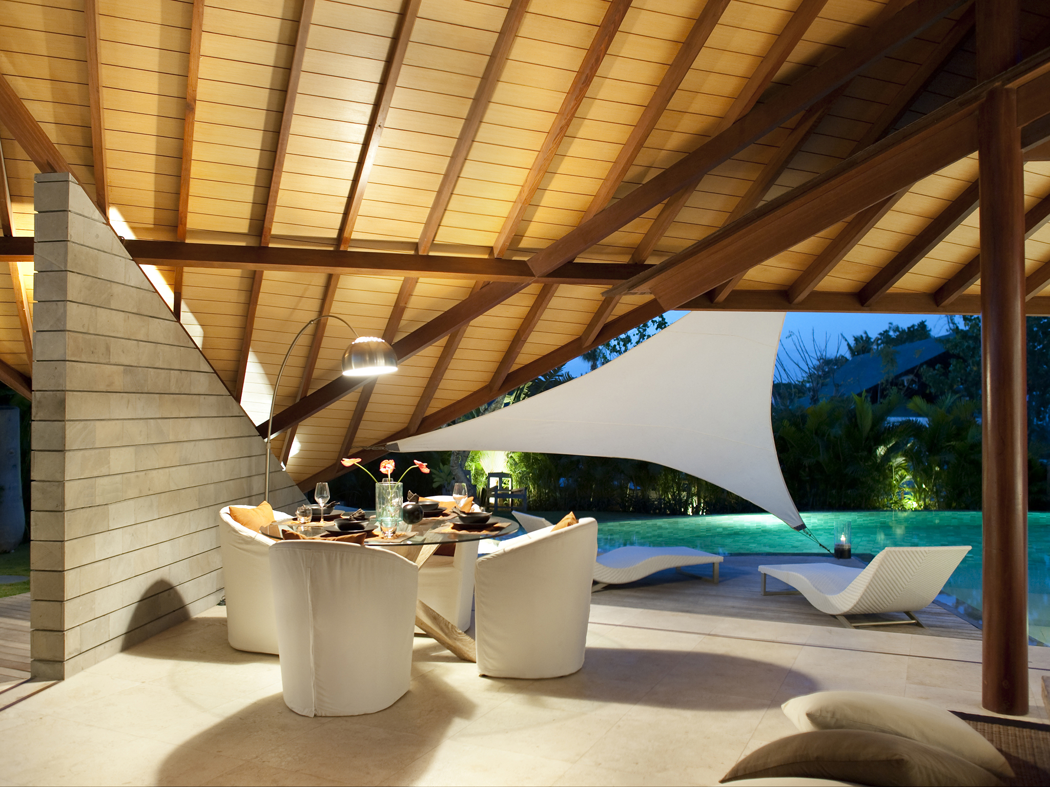 The Layar’s 11 three-bedroom villas flaunt the same striking architectural design features as the others in the 23-villa enclave.  As well as being defined by their sweeping roof lines, these villas are arranged over several levels, adding extra interest.  Welcoming semi-open-air living and dining rooms fan out from raised platforms alongside the kitchens and then merge seamlessly to pool decks and gardens.