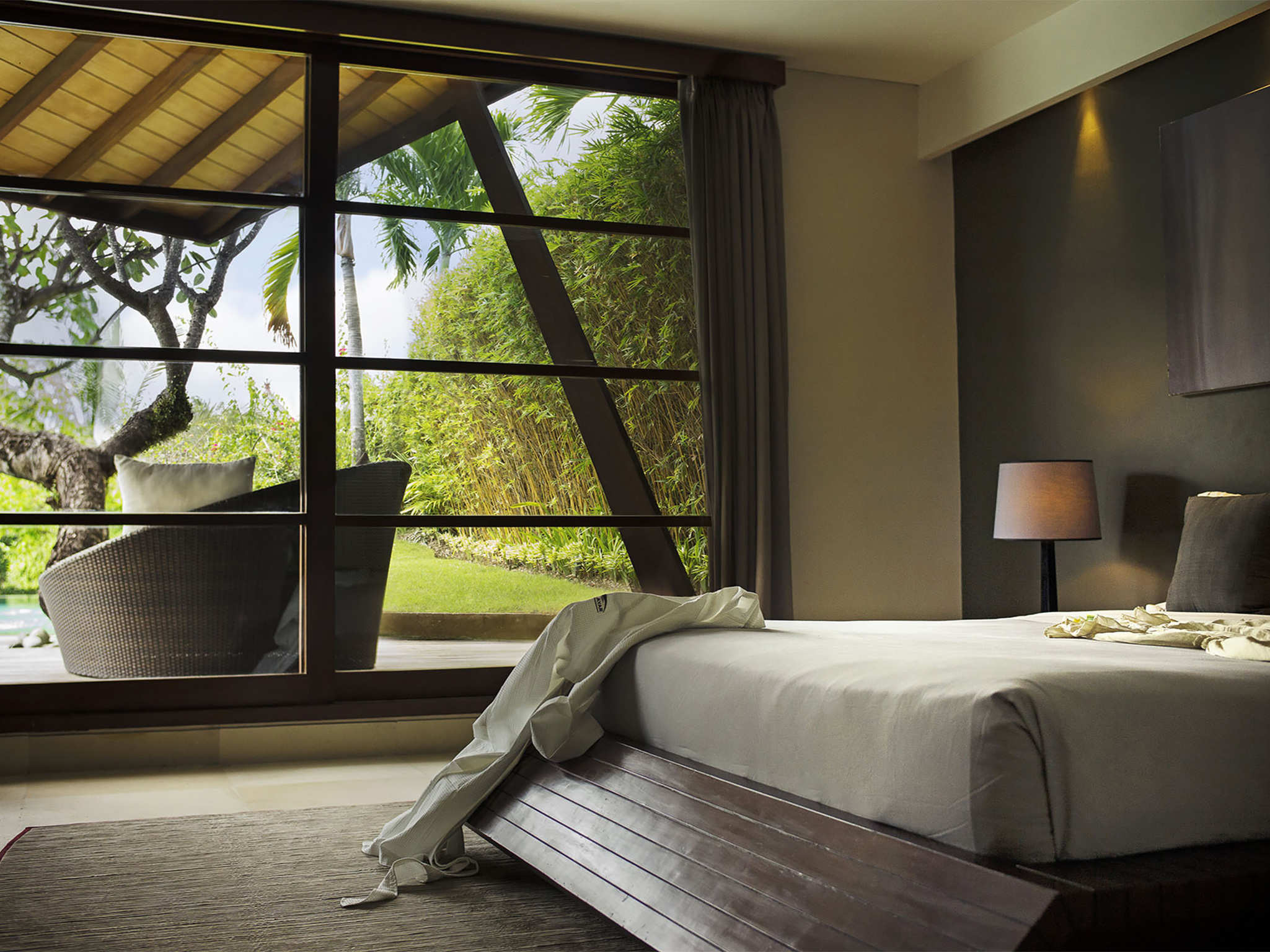 The three bedroom suites are all furnished with king-size beds, are very private, and have their own outdoor spaces – either a deck, terrace or garden bathroom.  The bedrooms lie off the main living areas behind statement walls of stone or via well-screened entrances set at an angle or on different levels.  The spacious master bedrooms come with glamorous bathrooms with large bathtub, shower, double basins and a private garden.  The guest bedrooms are just as enticing and secluded, with equally gorgeous indoor/outdoor bathrooms, many also featuring their own private garden areas.