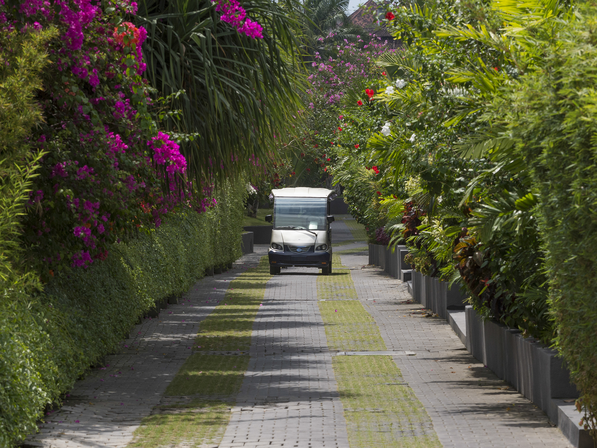 Two air-conditioned ensuite bedrooms are arranged on either side of the living area; both are exceptionally spacious and private and are fitted with king-size beds, sitting areas and flat-screen TVs.  As in the living space, colour schemes are softly muted and soothing.  Master bedrooms have sliding doors onto either a small deck or private corner of the garden. In both bedrooms, glamorous bathrooms with private garden areas are fitted with large bathtubs, showers and double vanities.