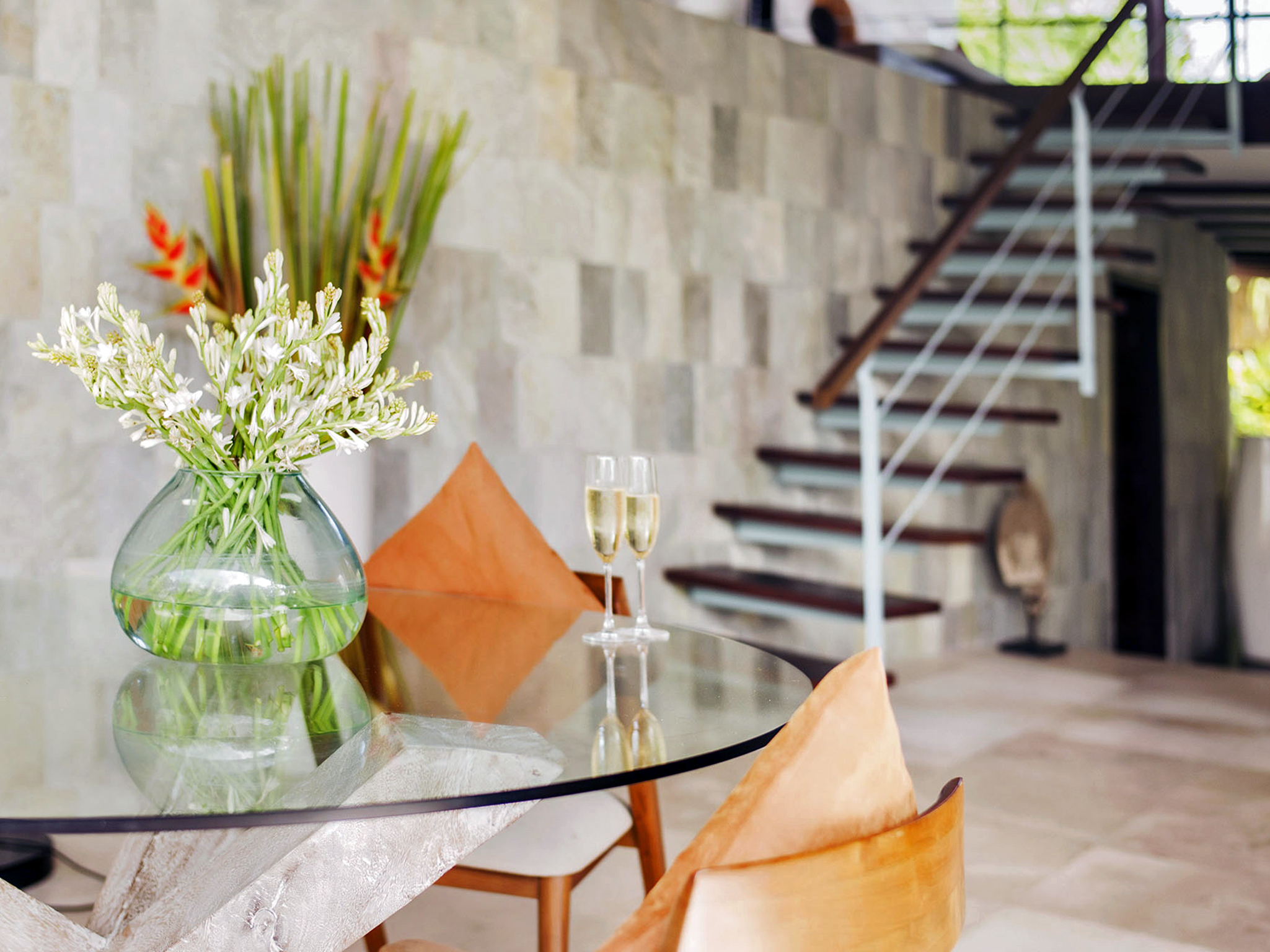 Couples will love the large, light-filled, air-conditioned bedroom with its king-size bed, Flat-screen TV, stylish seating area, window onto the courtyard and sliding doors to the pool deck. In the elegant ensuite bathroom is a foliage-fringed, semi-outdoor rain shower and a twin vanity.  A decadent black granite bathtub takes pride of place in the white-pebbled courtyard garden.