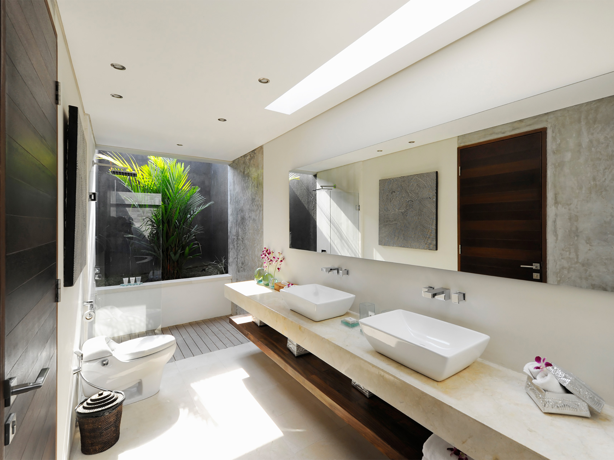 Couples will love the large, light-filled, air-conditioned bedroom with its king-size bed, Flat-screen TV, stylish seating area, window onto the courtyard and sliding doors to the pool deck. In the elegant ensuite bathroom is a foliage-fringed, semi-outdoor rain shower and a twin vanity. A decadent black granite bathtub takes pride of place in the white-pebbled courtyard garden.