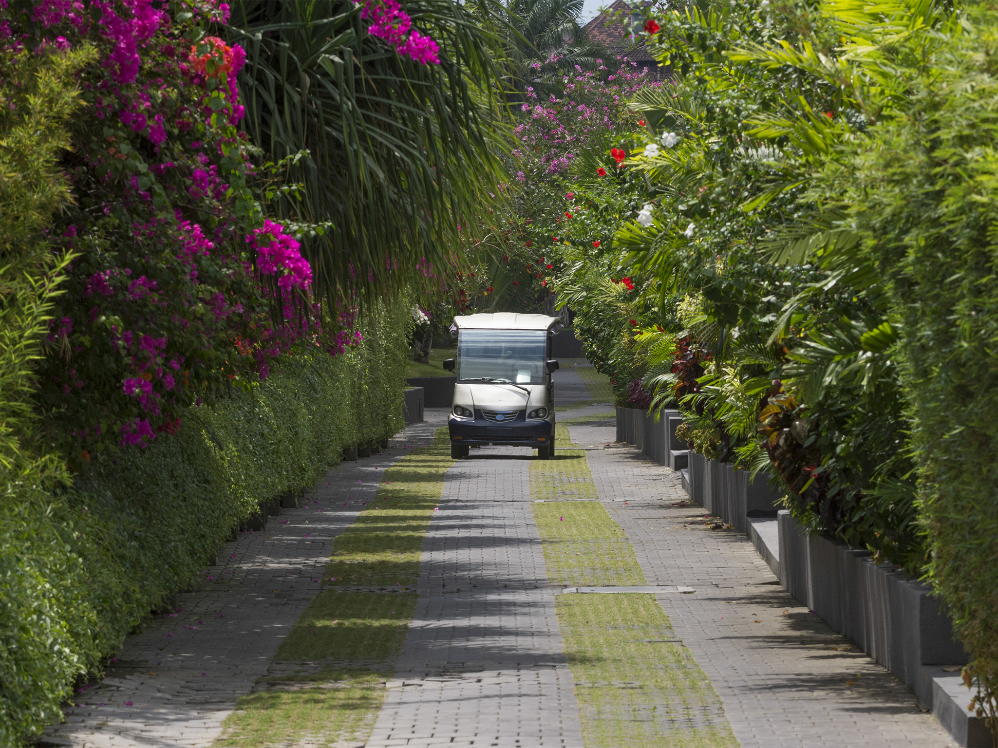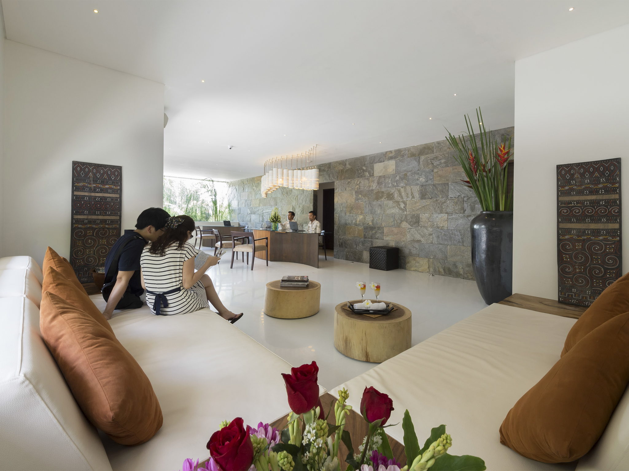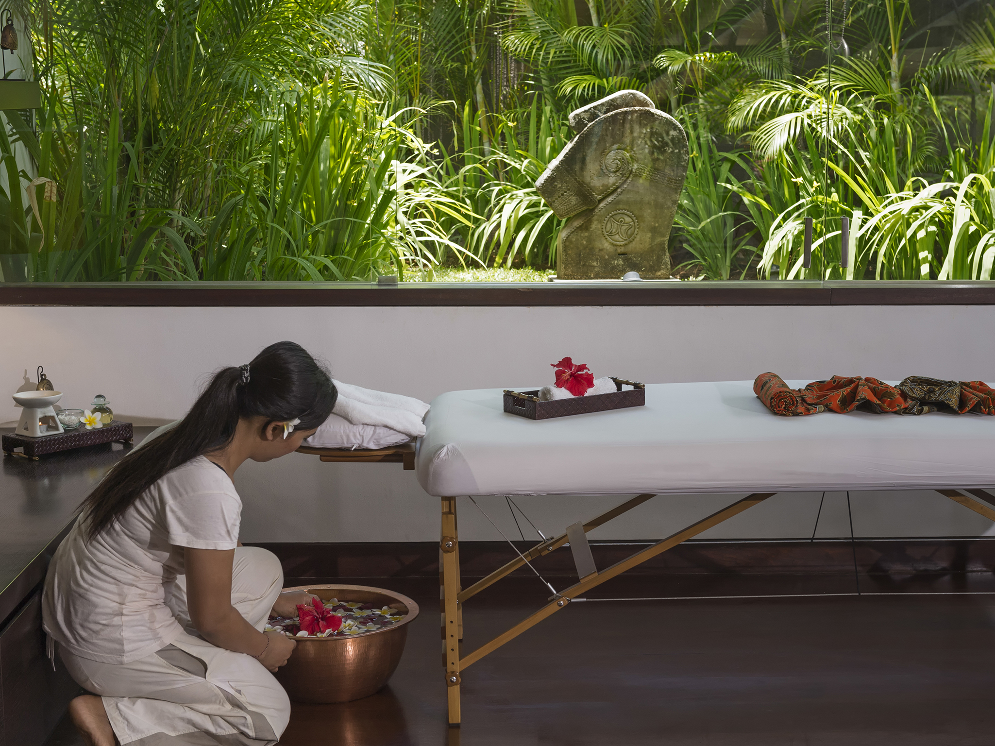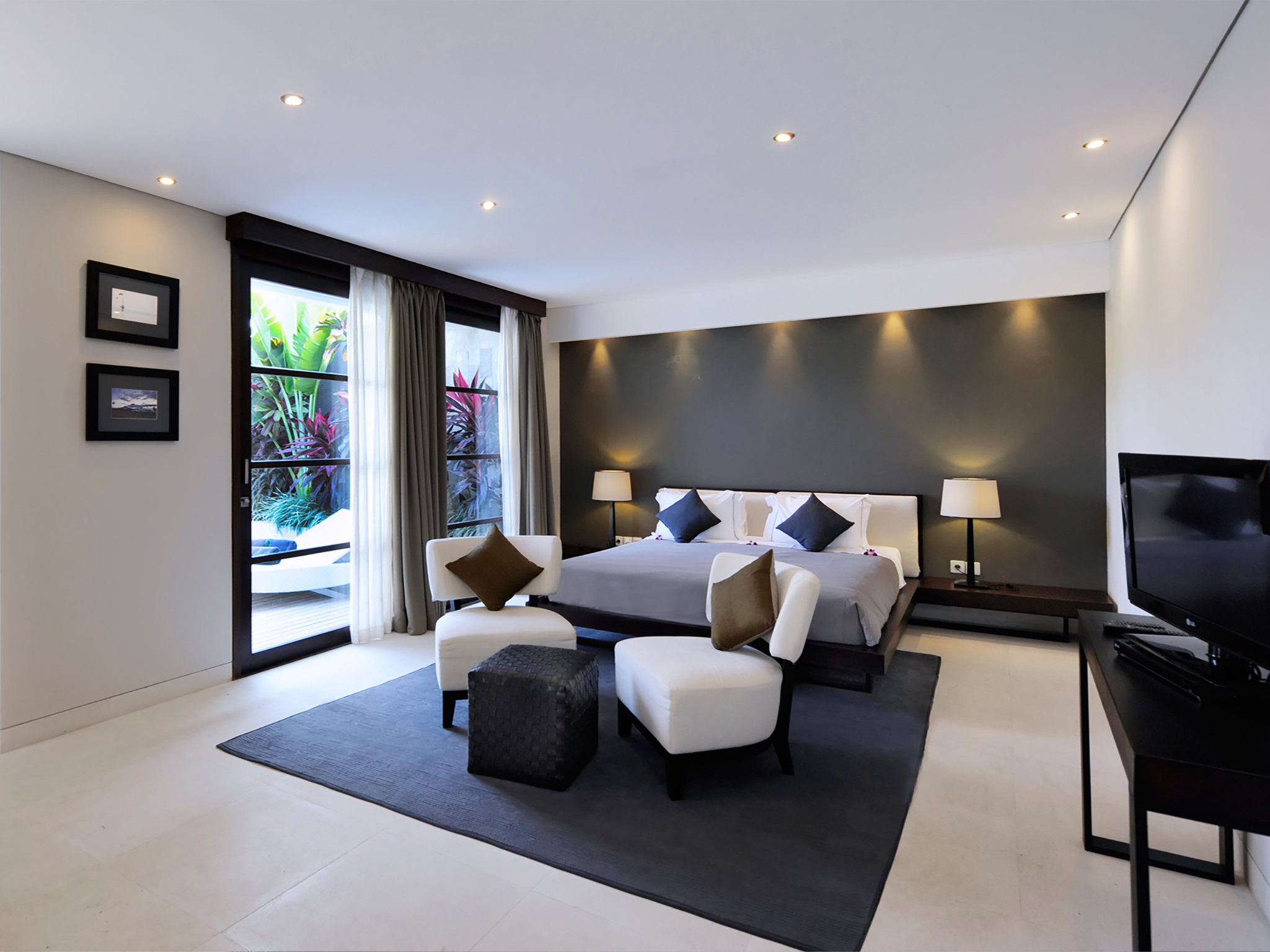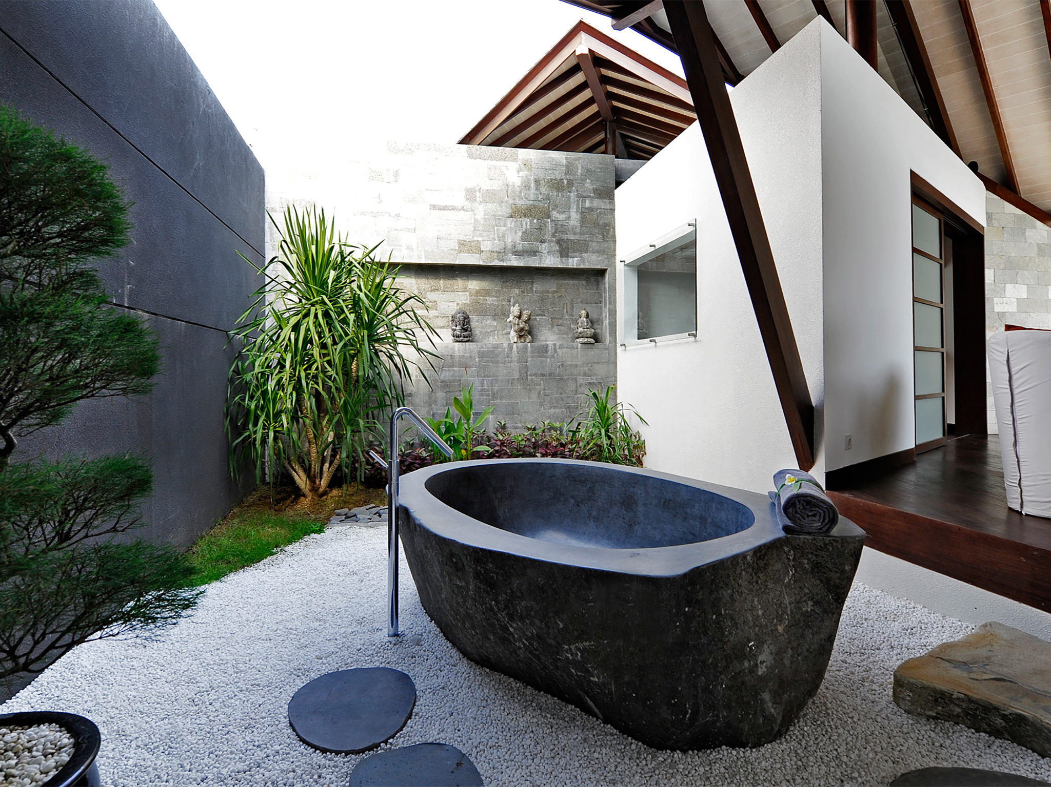 Couples will love the large, light-filled, air-conditioned bedroom with its king-size bed, Flat-screen TV, stylish seating area, window onto the courtyard and sliding doors to the pool deck. In the elegant ensuite bathroom is a foliage-fringed, semi-outdoor rain shower and a twin vanity. A decadent black granite bathtub takes pride of place in the white-pebbled courtyard garden.