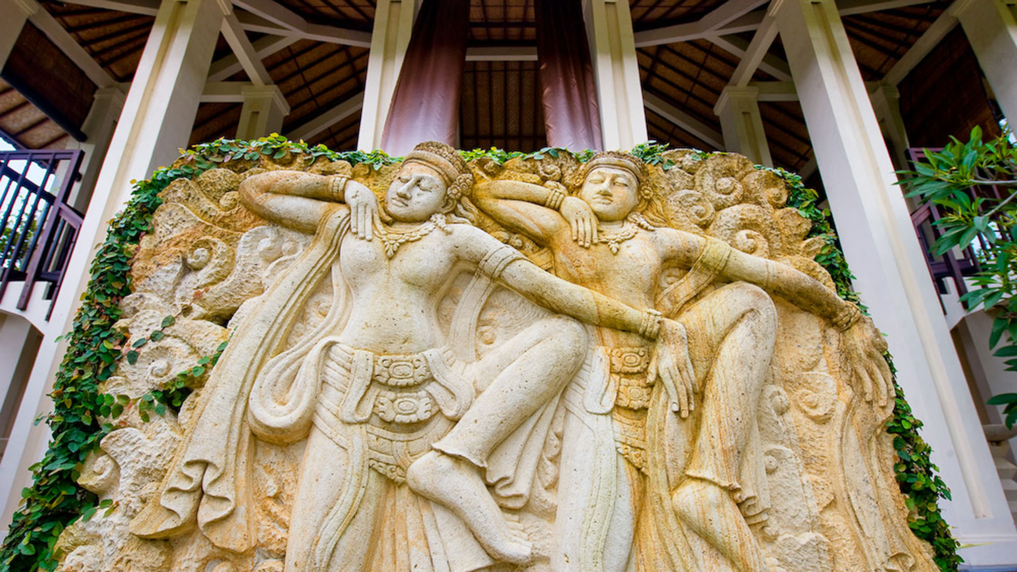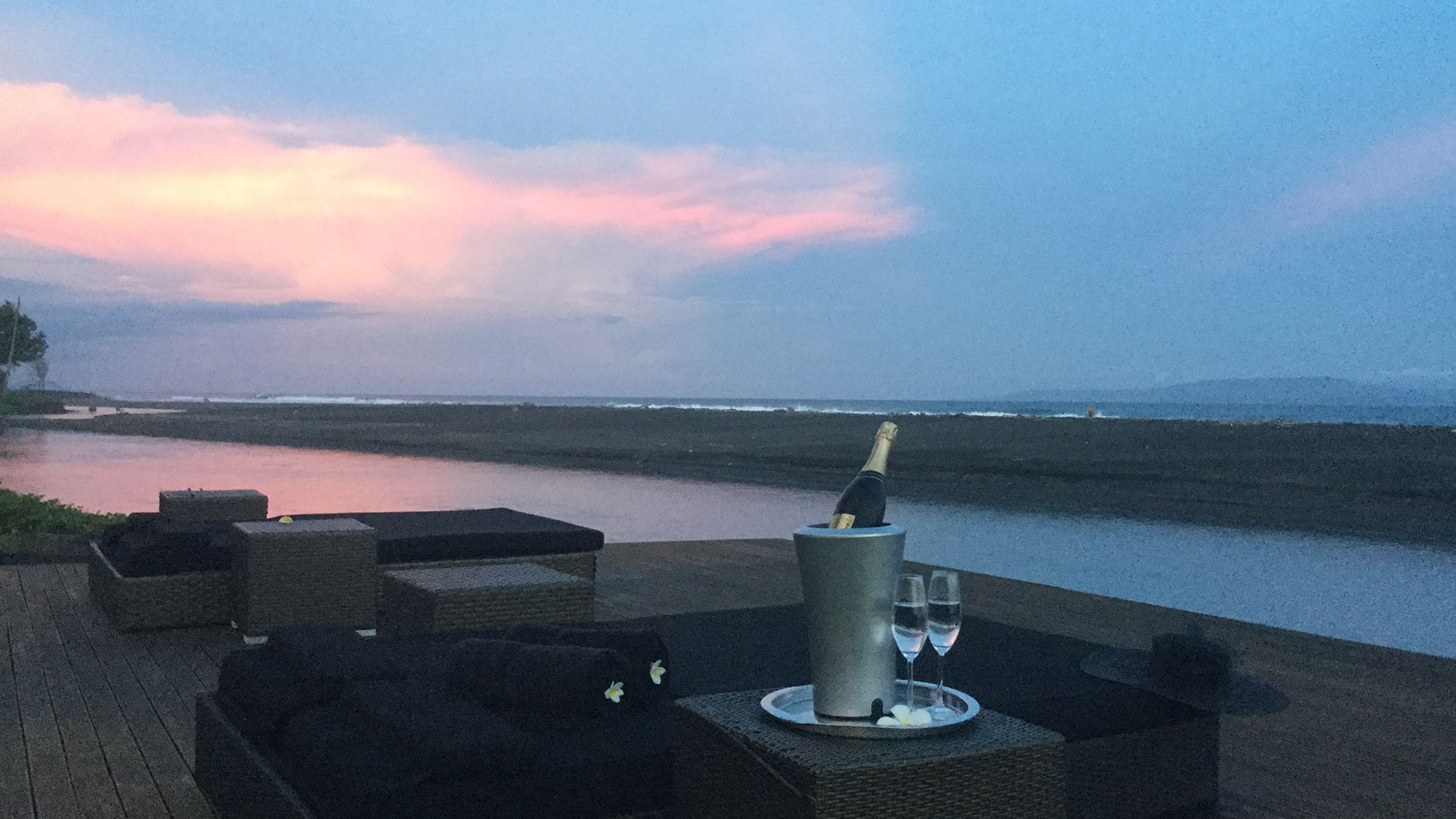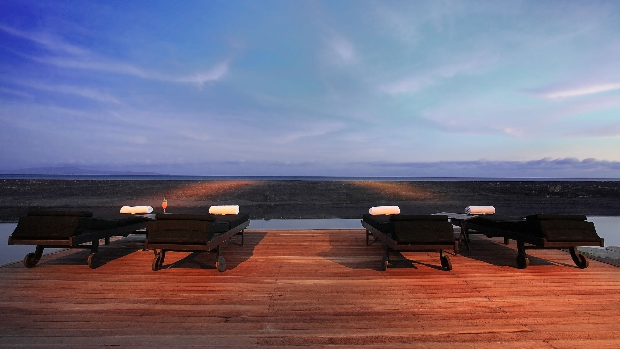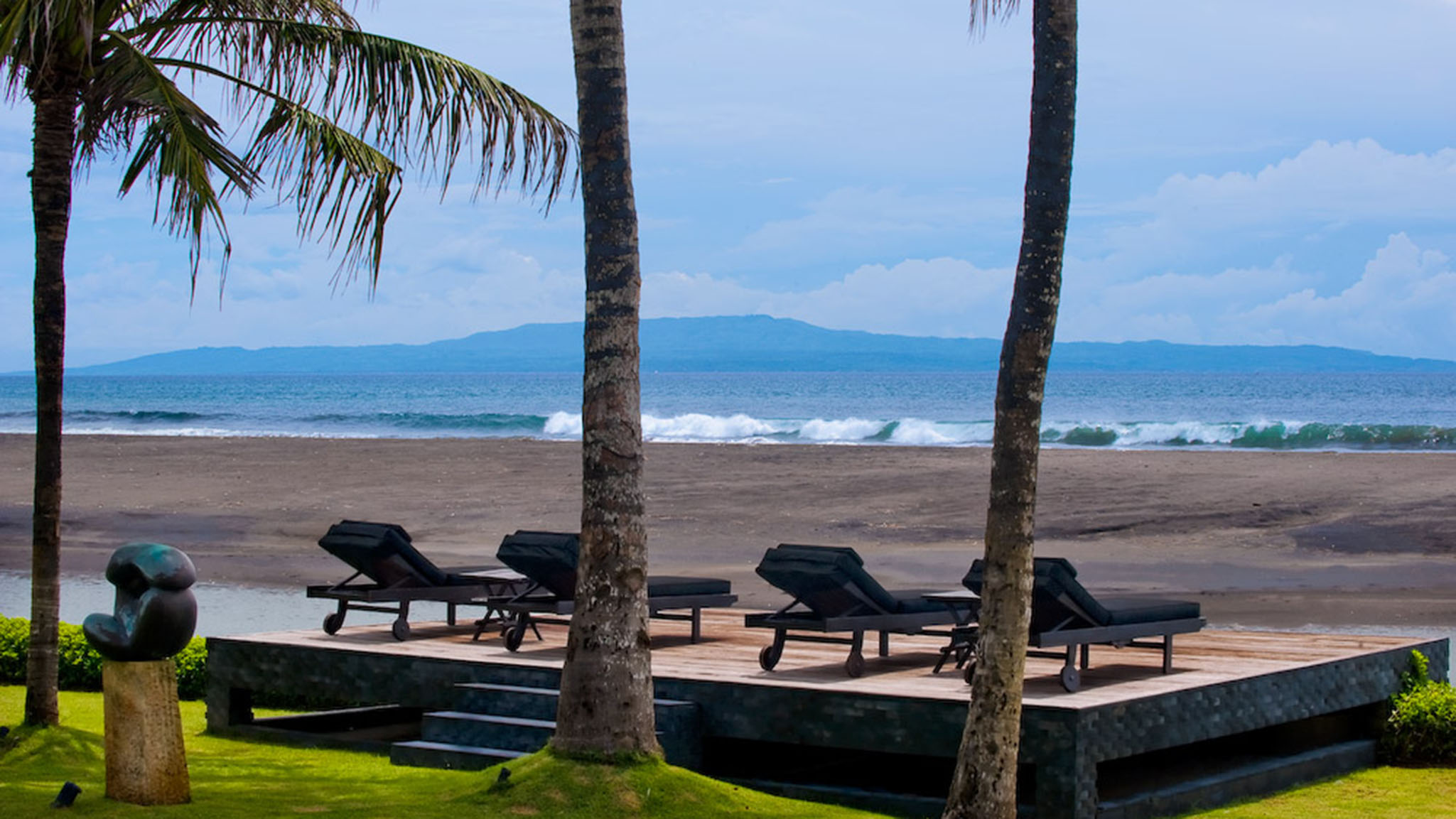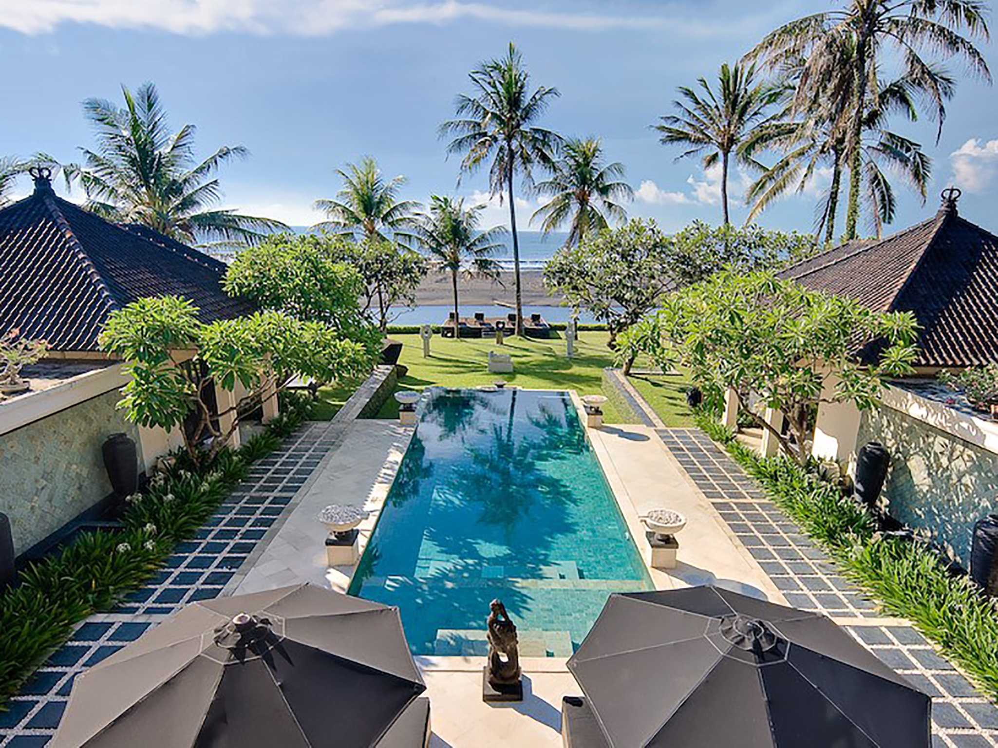 The main two-storey house has a huge vaulted ceiling, and looks down past the swimming pool and lawns to the beach. The second floor has an outstanding balcony with daybed to look down on the villa grounds and the crashing surf beyond. Within the main villa are the well-equipped – if a little dated – kitchen (not that you will ever need to go in) and a cosy entertainment room with a neat bed/sofa configuration for the whole family to lie back on and enjoy large screen-projected movies, of which there are over 100. In the atrium is a pleasant table for up to 17 diners and a rather formal seating area, both with great views over the pool and beach.