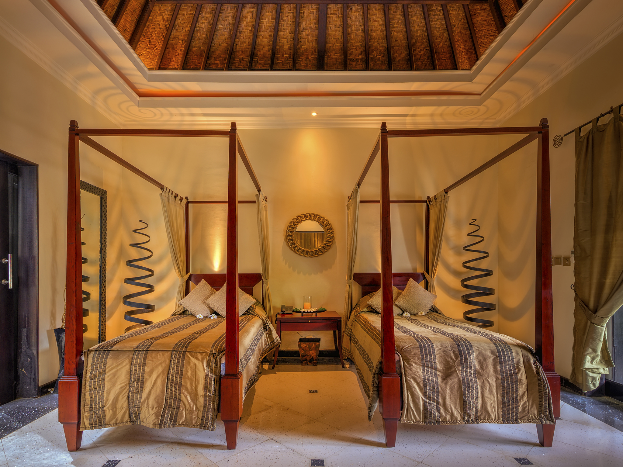 Running back towards the main house are two queen-bedded rooms which each connect to a twin room via internal sliding double doors. The queen bedrooms have a small sunken bath of stone which doubles as a shower whilst the twins have ensuite showers. There is no TV in these rooms just a simple stereo. All the bedrooms are air-conditioned.