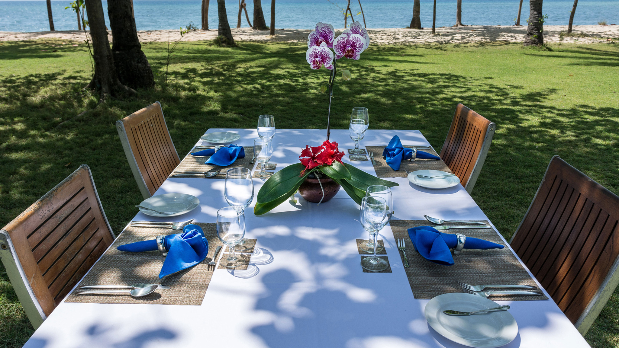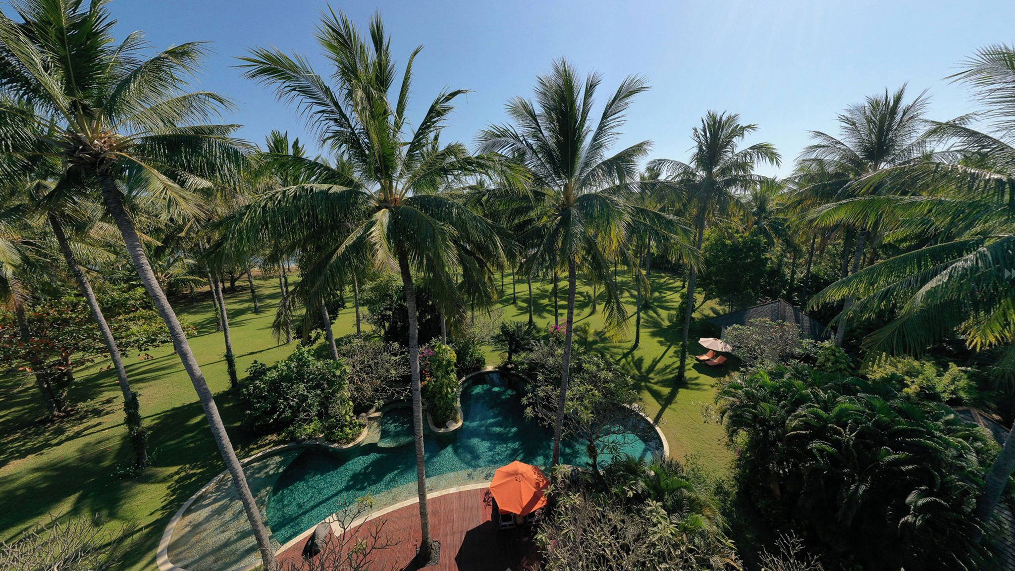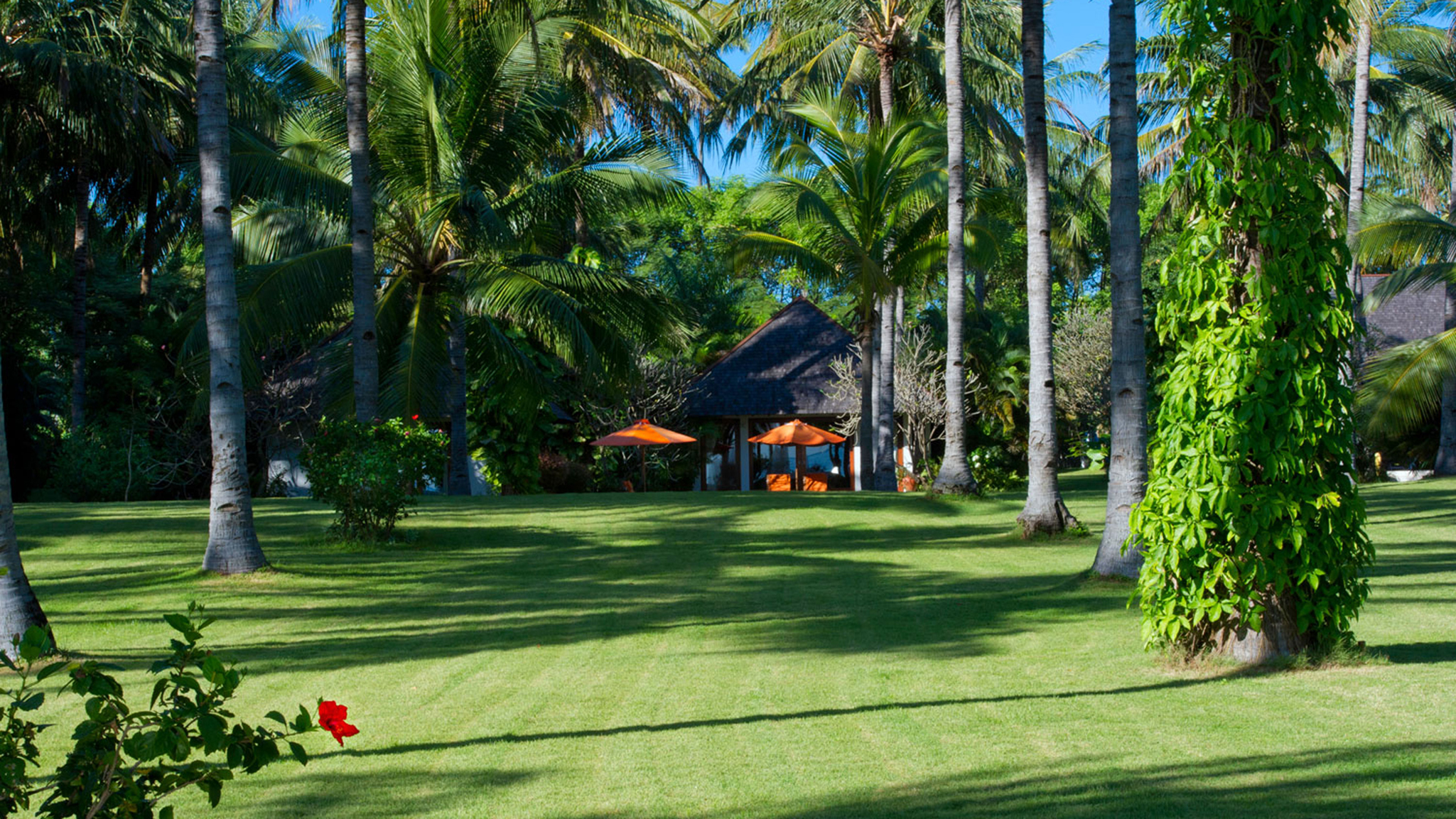 Positioned in pairs either side of the living pavilions (but with plenty of space between them), the four air-conditioned sleeping pavilions all have large sliding glass doors opening out on to the gardens. Each room is equipped with a king-sized bed and two built-in daybeds or single beds, making them ideal for small families. Three of the bedrooms have TVs, DVDs and iPod docks. The indoor/outdoor bathrooms all have showers (three have tubs) and feature quirky elements such as ‘secret windows’ and mysterious carved stone faces.