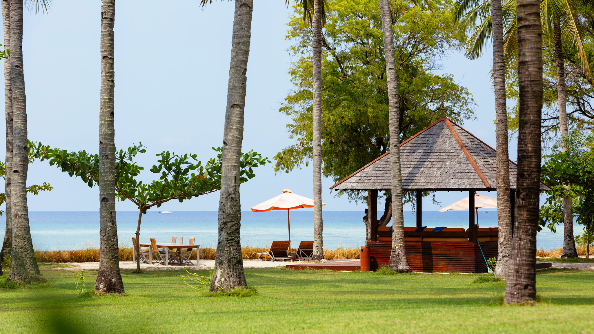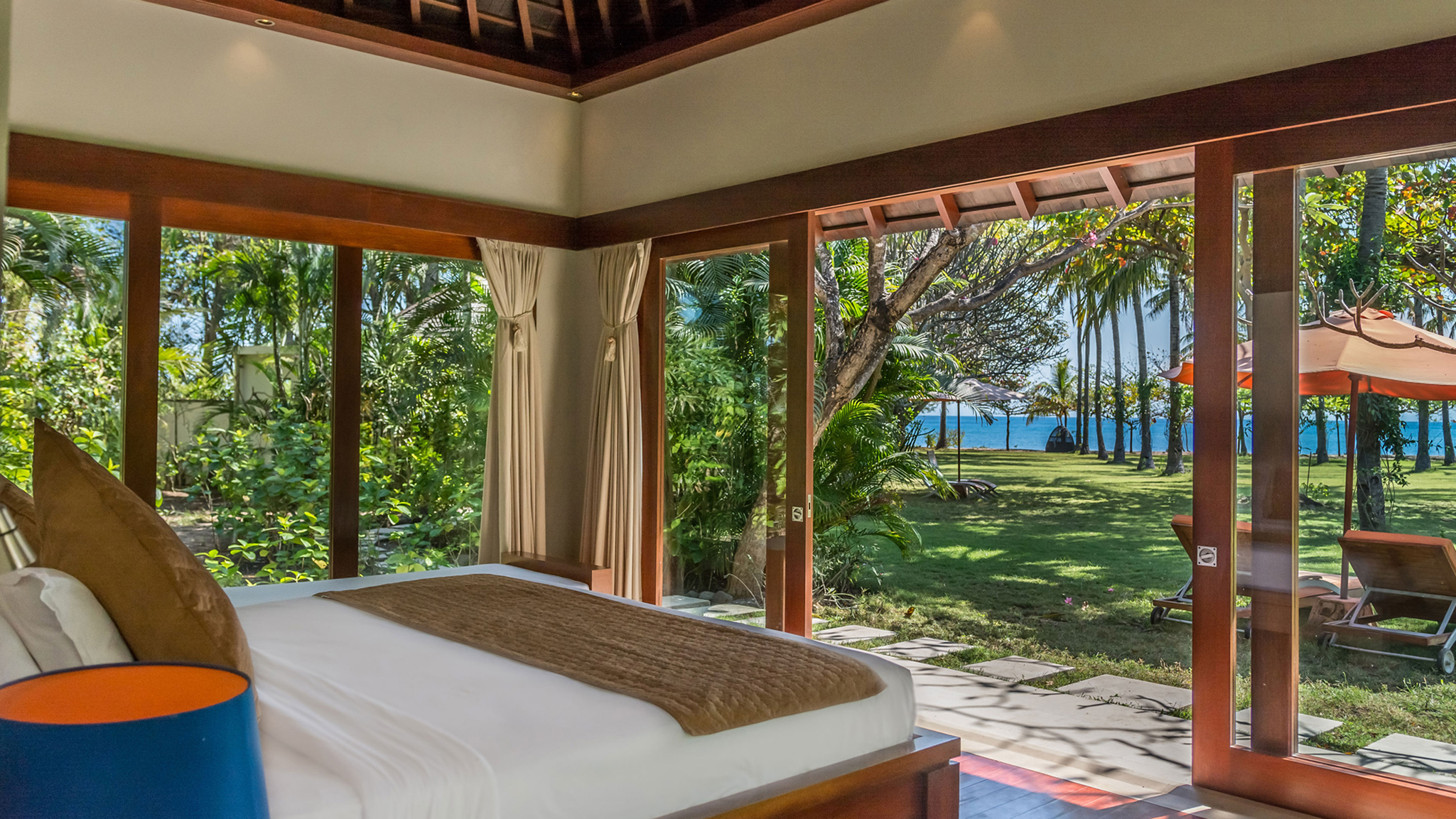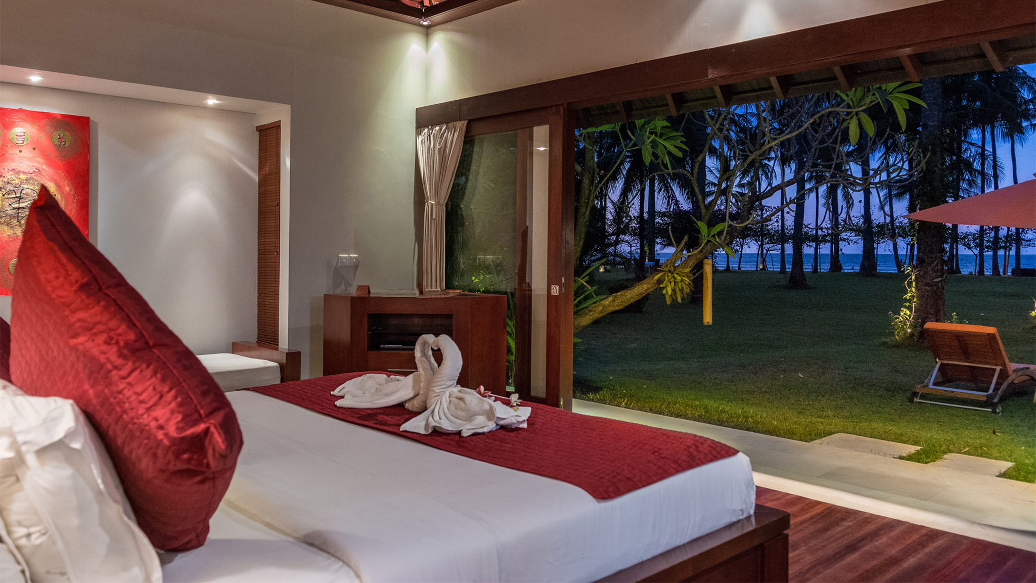 To the left of the living room, and along a corridor of lotus-filled ponds, is the large, open dining hall with a massive 12-seater teak table. Just beyond that lies a modern kitchen divided into two separate cooking areas (one for guest use and one for the staff). A long breakfast bar is perfect for casual breakfasts or evening aperitifs. For the ultimate in daytime relaxation, head across the garden to the beachside bale (gazebo) nestled right on the edge of the sand and, since the tide ebbs only slightly, only ever a few steps from the water. Loaded with cushions, the bale can accommodate 10 or more reclining bodies in comfort and, more importantly, shade. There’s even a room service phone in here!