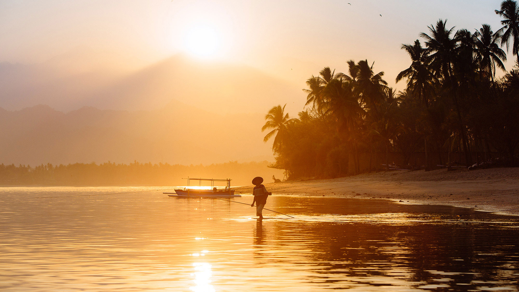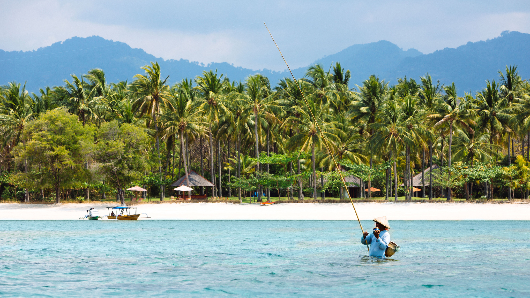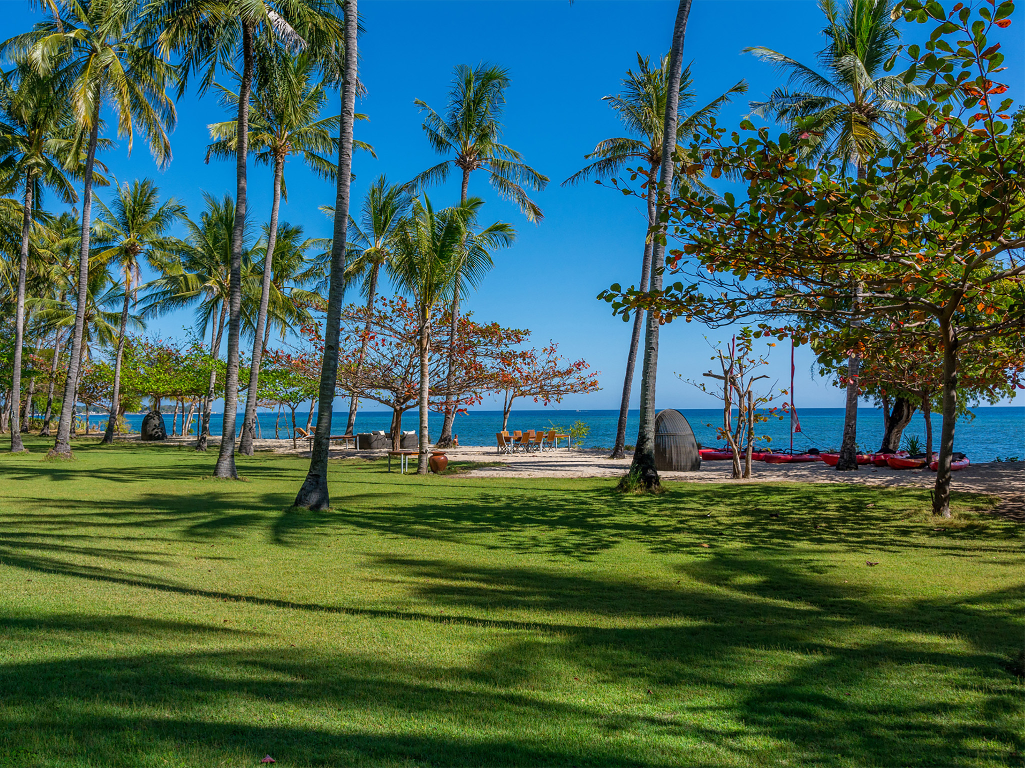To the left of the living room, and along a corridor of lotus-filled ponds, is the large, open dining hall with a massive 12-seater teak table. Just beyond that lies a modern kitchen divided into two separate cooking areas (one for guest use and one for the staff). A long breakfast bar is perfect for casual breakfasts or evening aperitifs. For the ultimate in daytime relaxation, head across the garden to the beachside bale (gazebo) nestled right on the edge of the sand and, since the tide ebbs only slightly, only ever a few steps from the water. Loaded with cushions, the bale can accommodate 10 or more reclining bodies in comfort and, more importantly, shade. There’s even a room service phone in here!