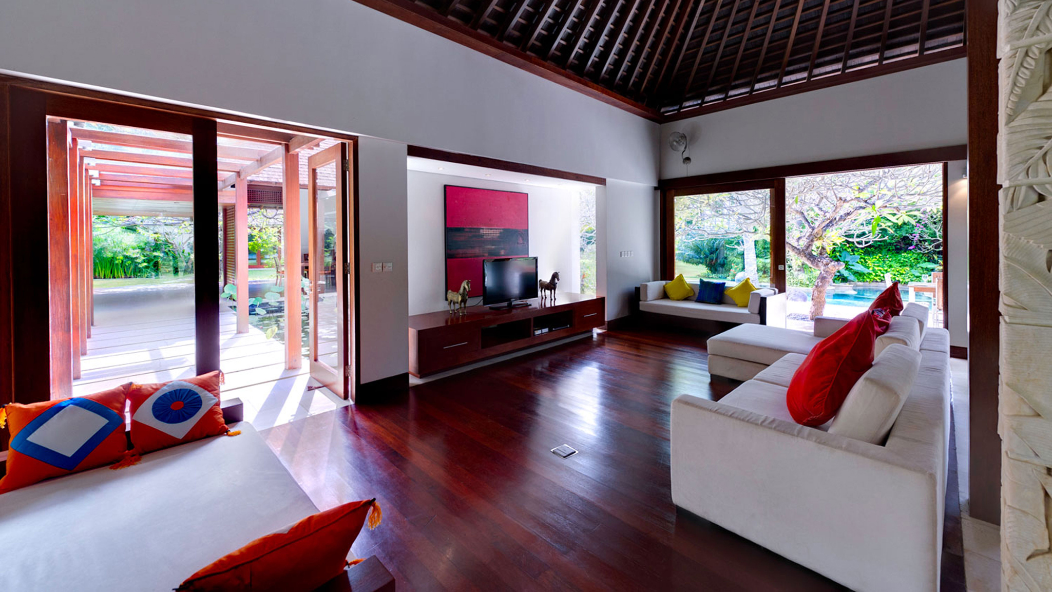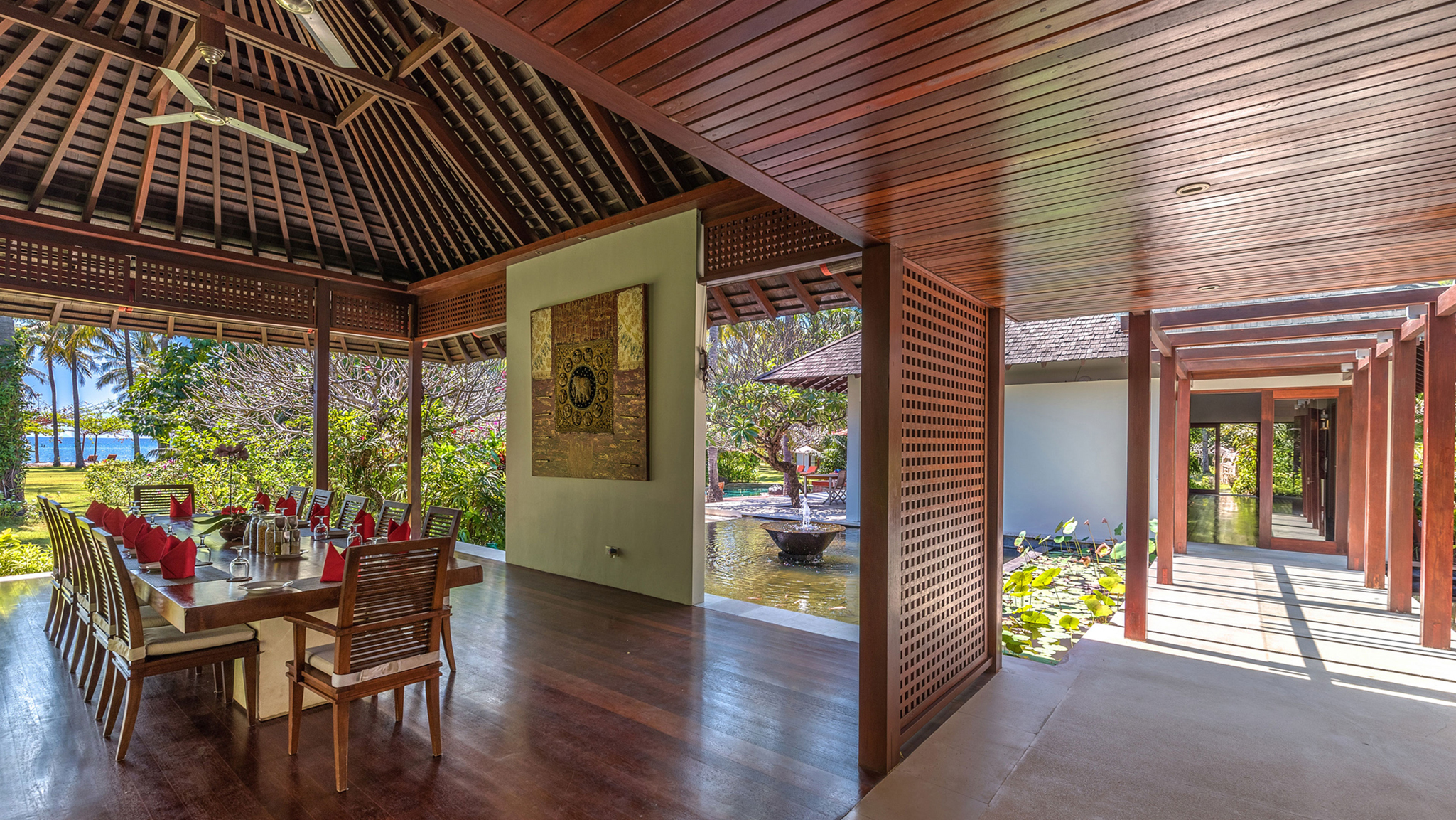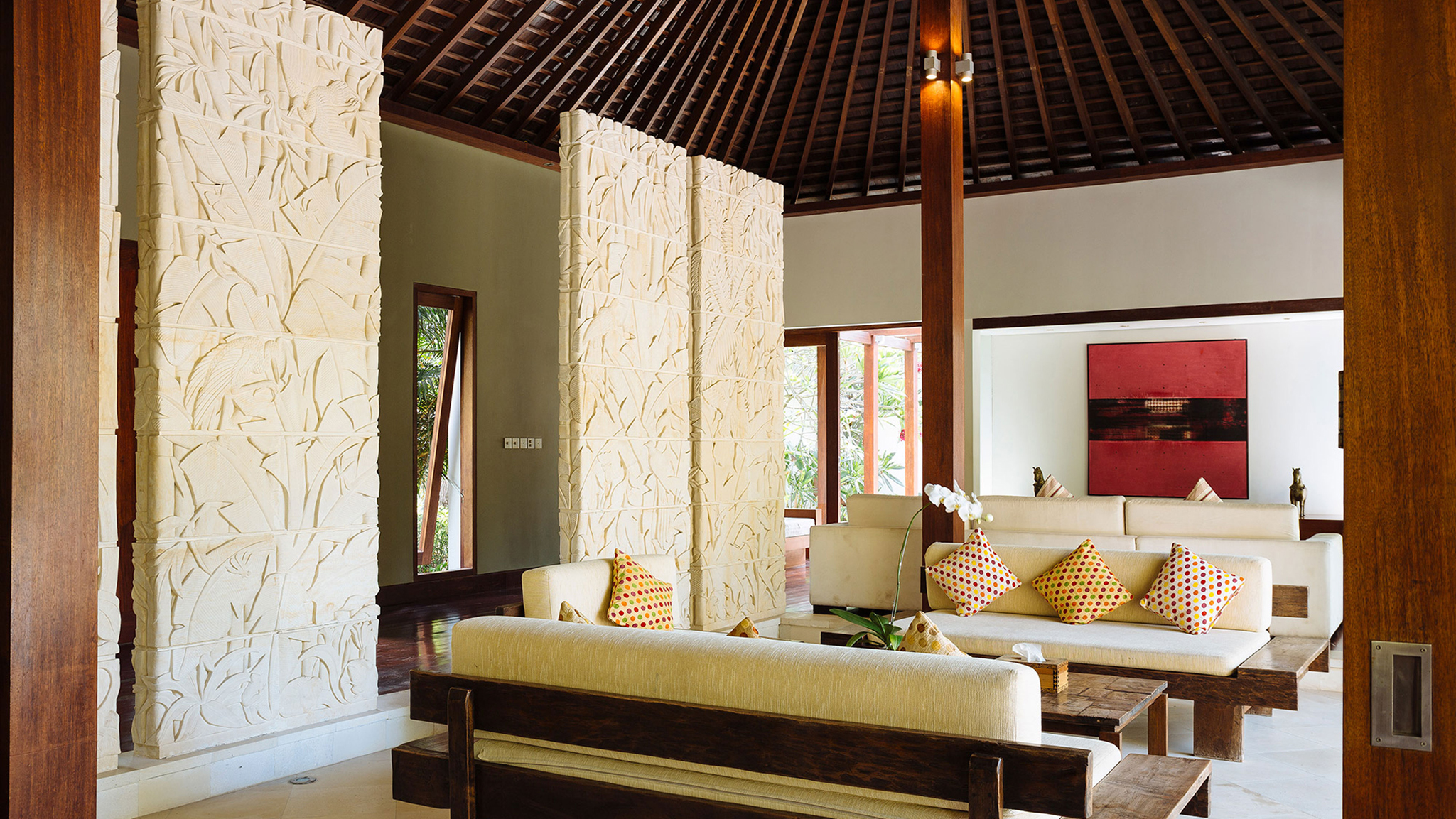 Entering the villa through large solid wood doors into the living room, one is immediately struck by the glorious views through the massive French windows out over a wide stone terrace to the pool, the luxuriant gardens and the ocean beyond. The enormous, lofty living pavilion is cooled by sea breezes and ceiling fans (though air conditioning is available). The living room is divided into three areas with a billiard table at one end, TV/DVD (and iPod dock) at the other, and a sitting area furnished with teak sofas and tables in the middle. A free-standing stone-carved fresco – reflecting images of the lush garden beyond – dominates this comfortable living space which is large enough to accommodate a multitude of activities without stepping on anyone’s toes.