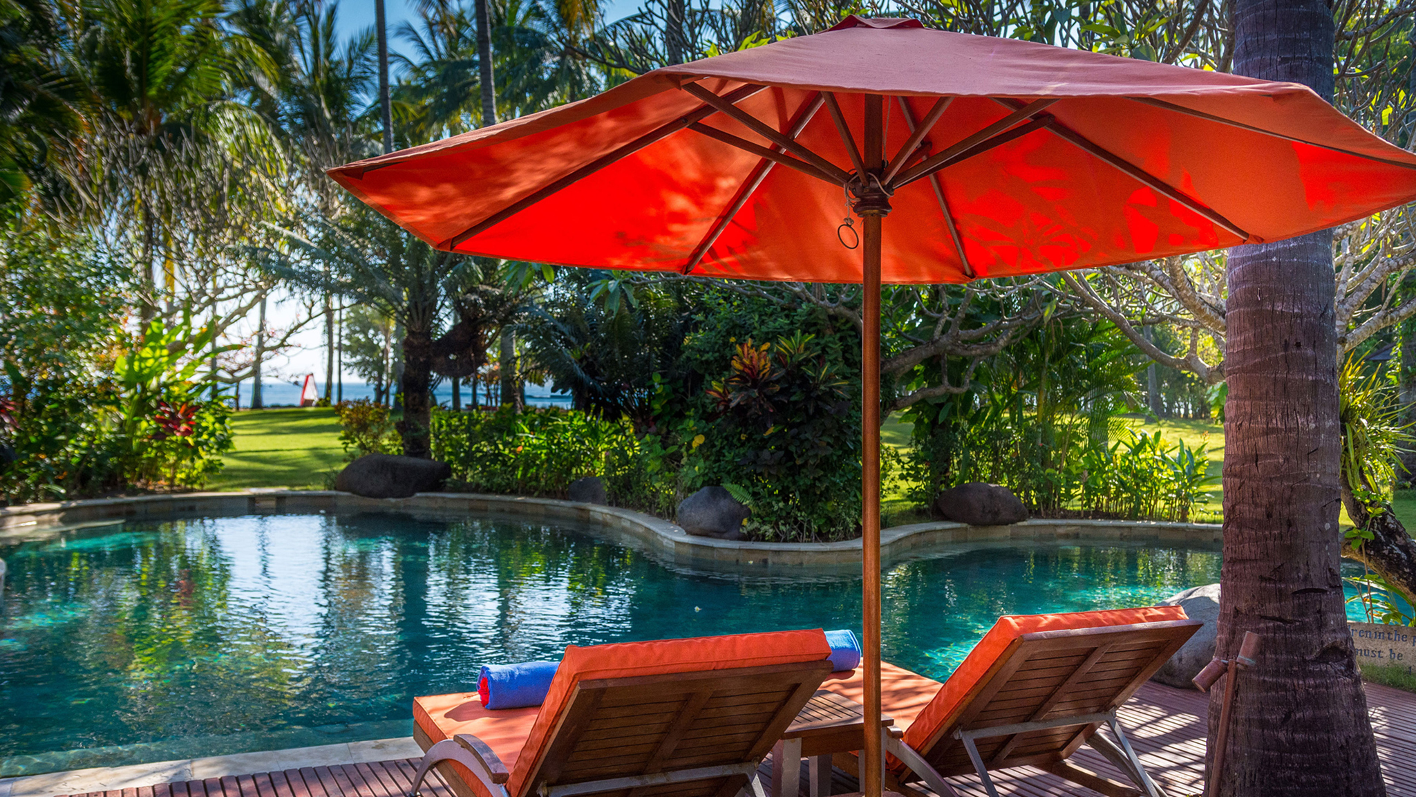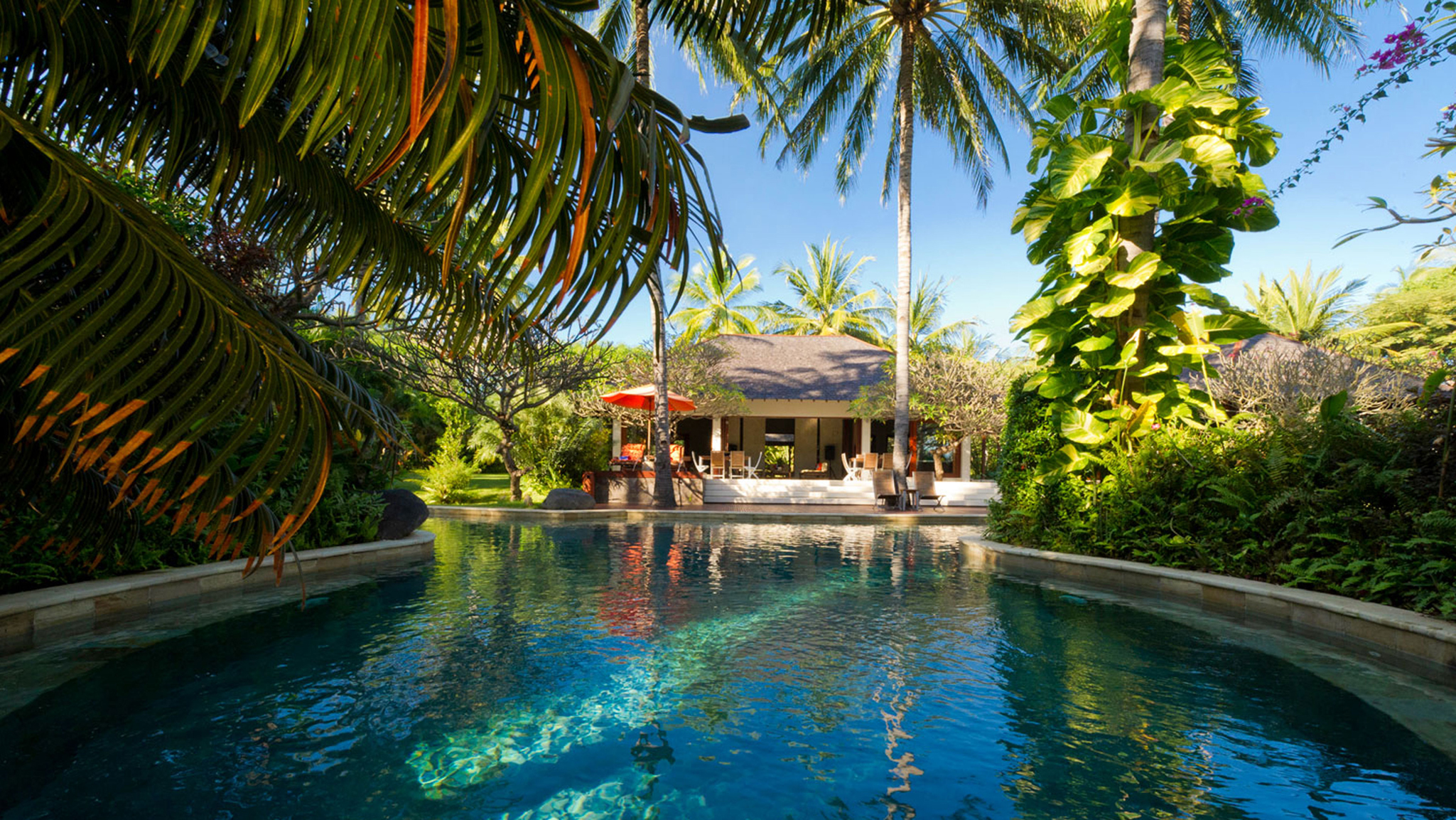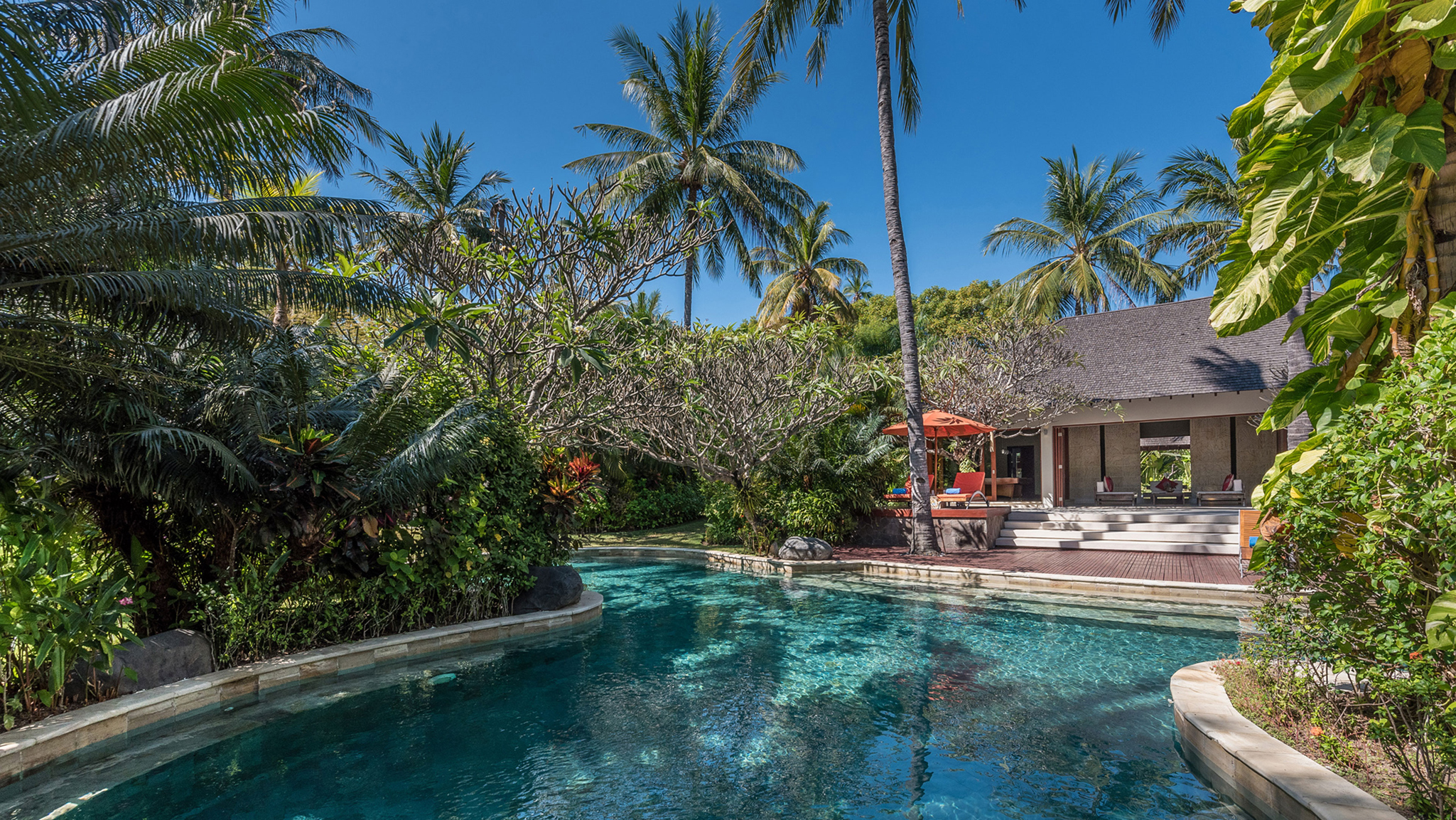 Entering the villa through large solid wood doors into the living room, one is immediately struck by the glorious views through the massive French windows out over a wide stone terrace to the pool, the luxuriant gardens and the ocean beyond. The enormous, lofty living pavilion is cooled by sea breezes and ceiling fans (though air conditioning is available). The living room is divided into three areas with a billiard table at one end, TV/DVD (and iPod dock) at the other, and a sitting area furnished with teak sofas and tables in the middle. A free-standing stone-carved fresco – reflecting images of the lush garden beyond – dominates this comfortable living space which is large enough to accommodate a multitude of activities without stepping on anyone’s toes.