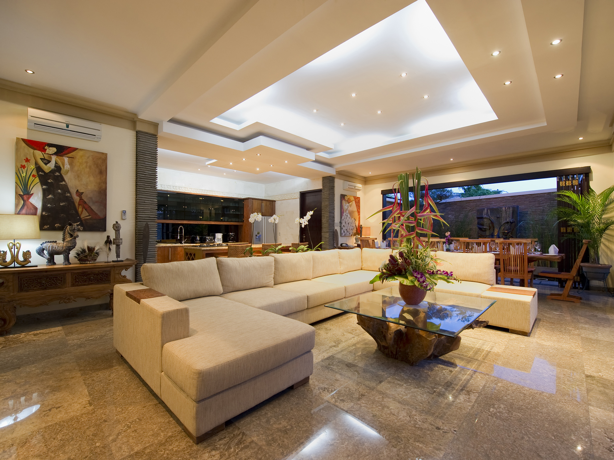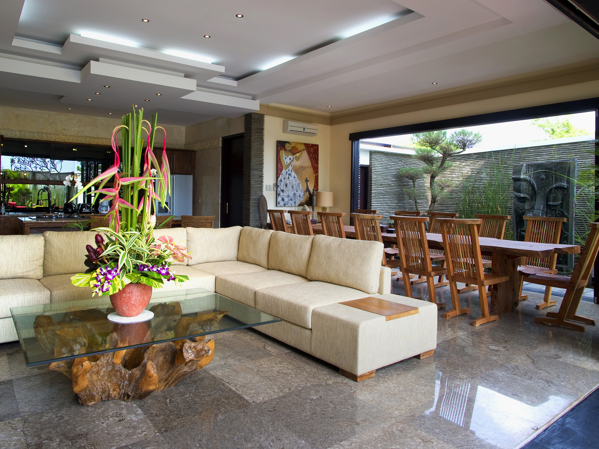 Back at ground level, a pathway leads to timber decking with the swimming pool to your right and two ground floor bedrooms on your left. These bedrooms are mirror images of each other and come with king-sized beds, writing desks, walk-through dressing rooms and tropical bathrooms with twin glass sinks, a tub and a tropical rain shower. At the far end of the swimming pool, folding glass doors connect the pool terrace to a spacious open-plan living room with both ceiling fans and air conditioning. An oversized sofa is placed to view the pool whilst a large flat-screen TV with satellite channels, DVD player and surround-sound is positioned to one side. To the right is a long, 12-seater dining table, whilst to the back of the room a feature kitchen is separated from the lounge area by a marble topped breakfast bar. Perfectly equipped for the western cook the kitchen comes with an oven, a microwave, a three burner hob, a coffee machine and a large fridge as well as a stylish selection of appliances.