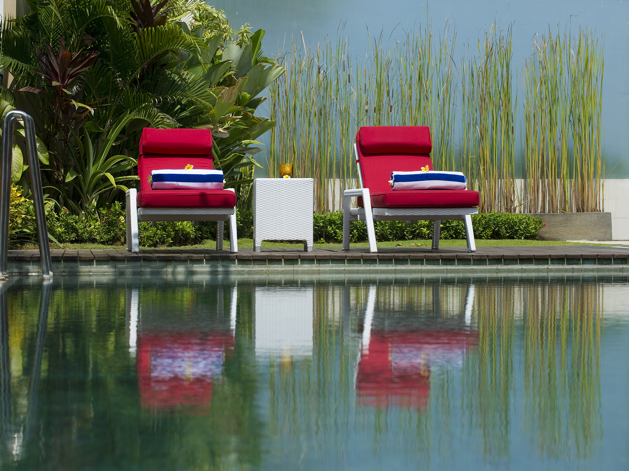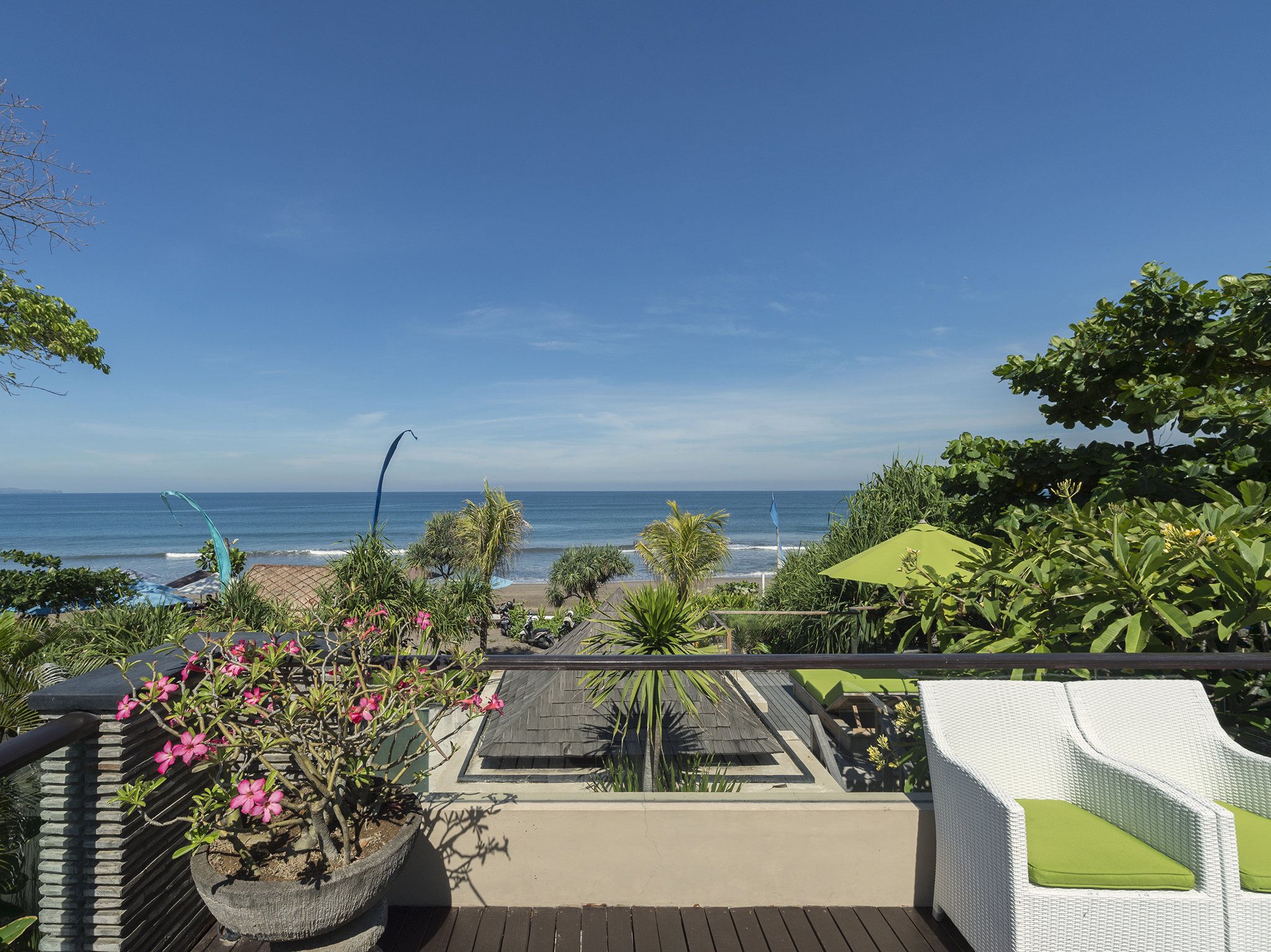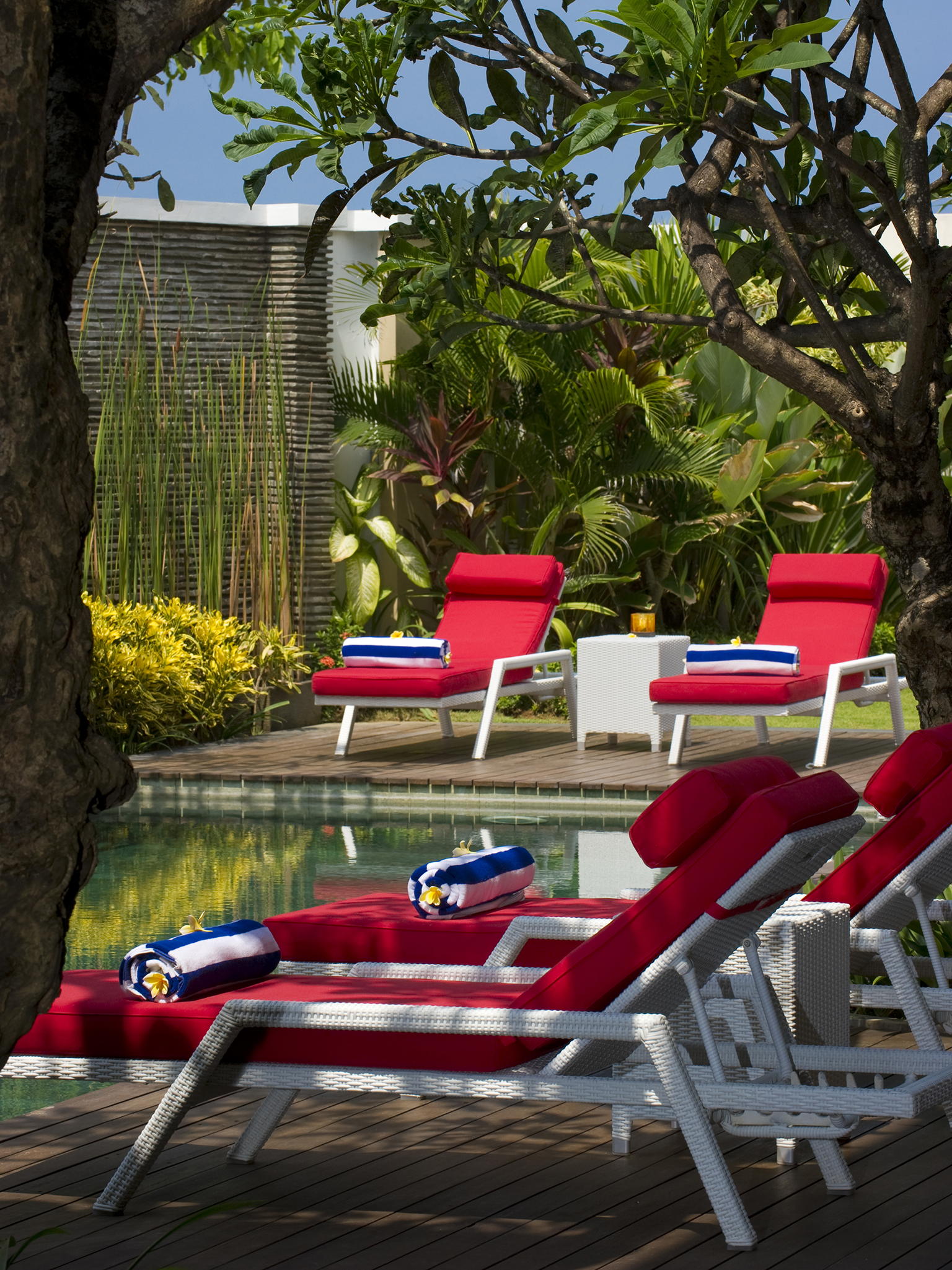 Stepping stones neatly placed over a reflection pool topped with floating plants bridges the gap between LeGa shaded entrance porch and a private walled garden where the whole L-shaped property presents itself beautifully before you. Up some stairs, above the villa entrance is a newly built wooden deck furnished with sun loungers and an umbrella, providing a very private relaxation pad on a par with the five-star beach clubs that line the beach in the neighbourhood.