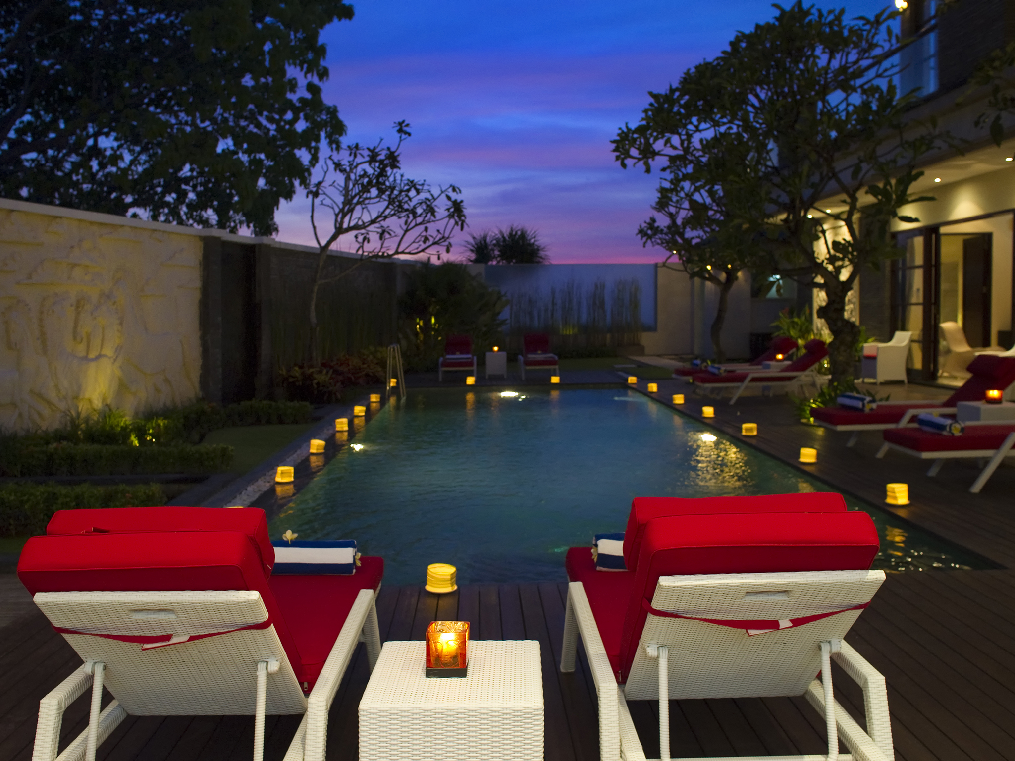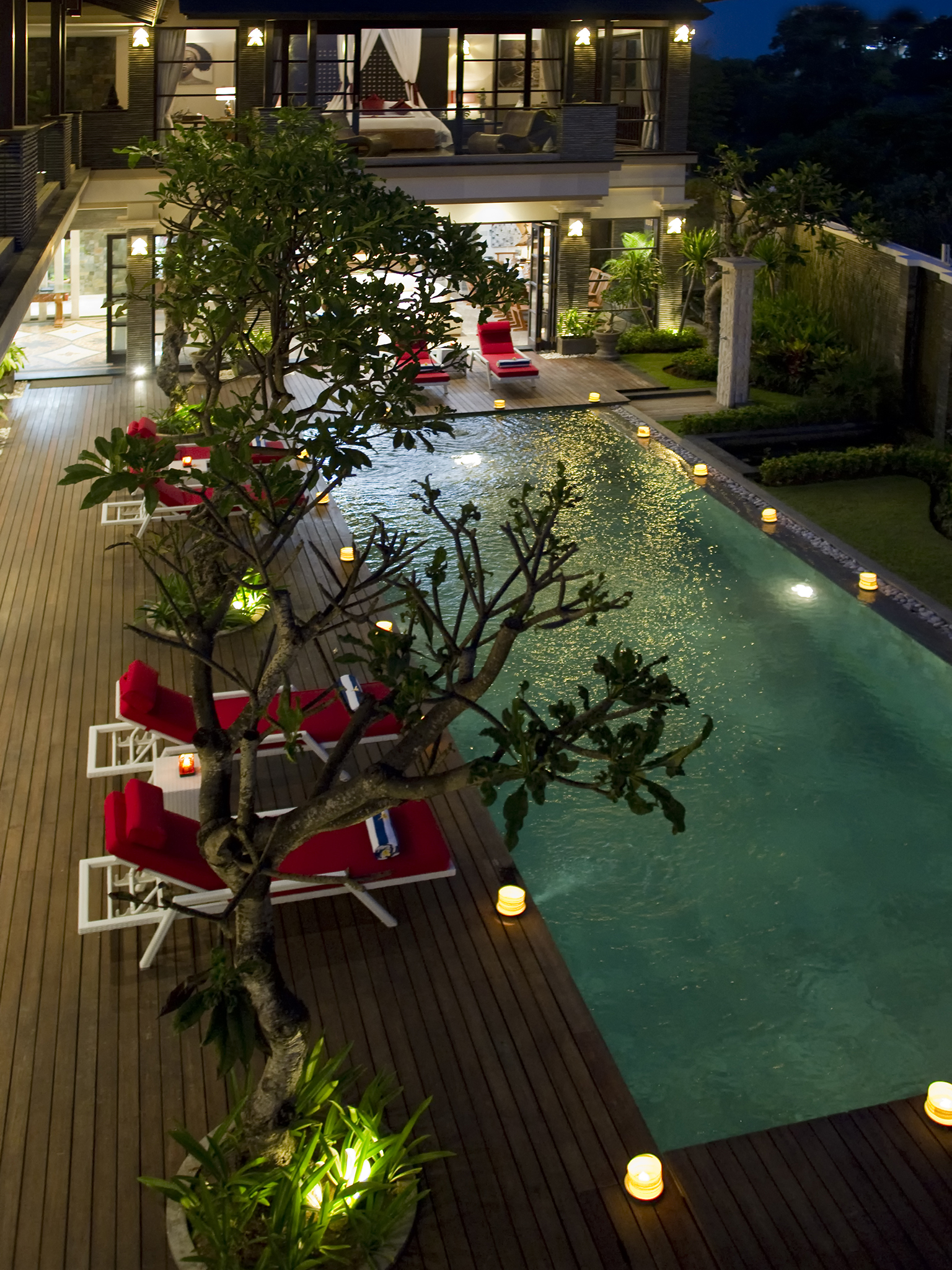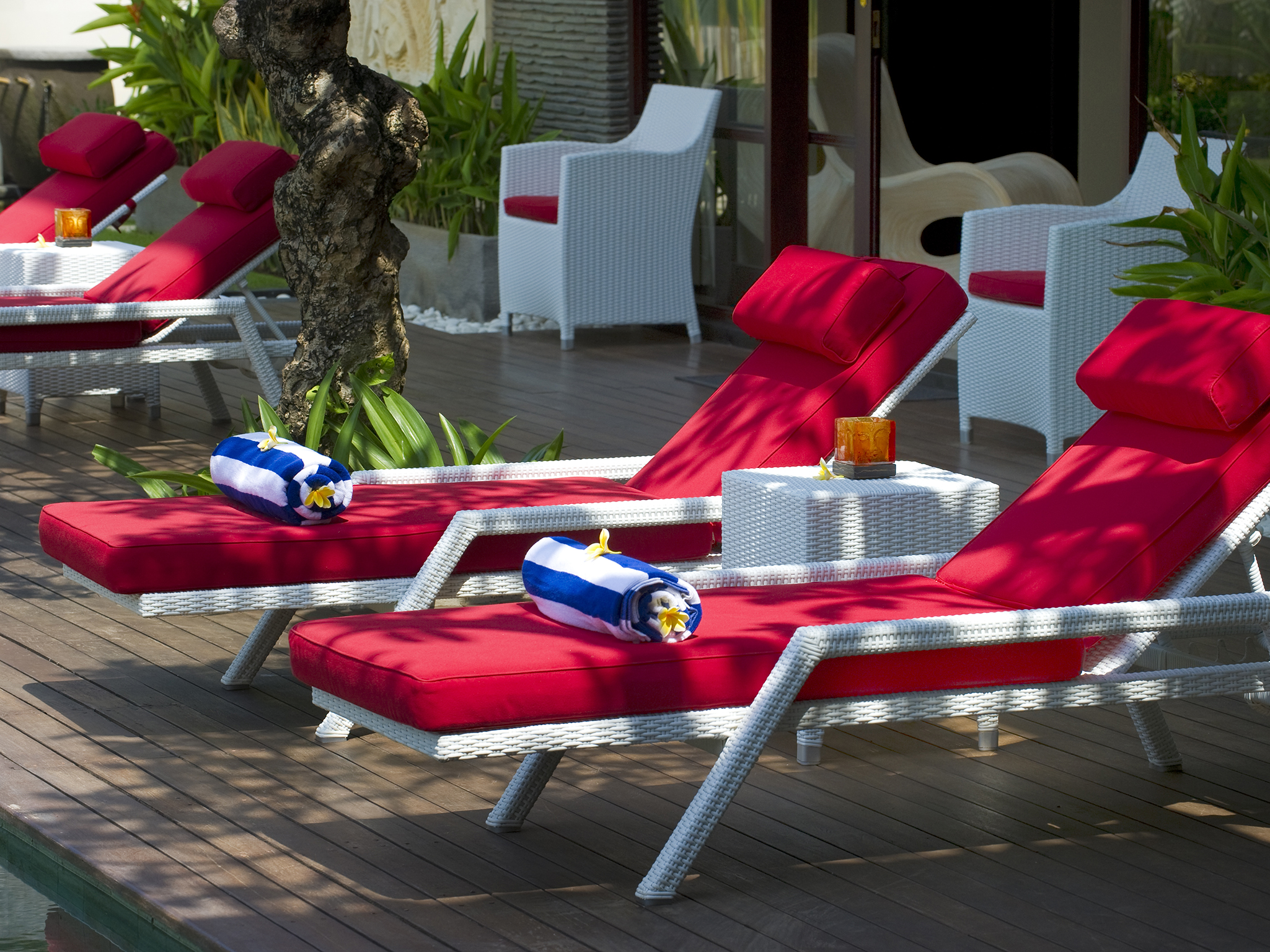 Stepping stones neatly placed over a reflection pool topped with floating plants bridges the gap between LeGa shaded entrance porch and a private walled garden where the whole L-shaped property presents itself beautifully before you. Up some stairs, above the villa entrance is a newly built wooden deck furnished with sun loungers and an umbrella, providing a very private relaxation pad on a par with the five-star beach clubs that line the beach in the neighbourhood.