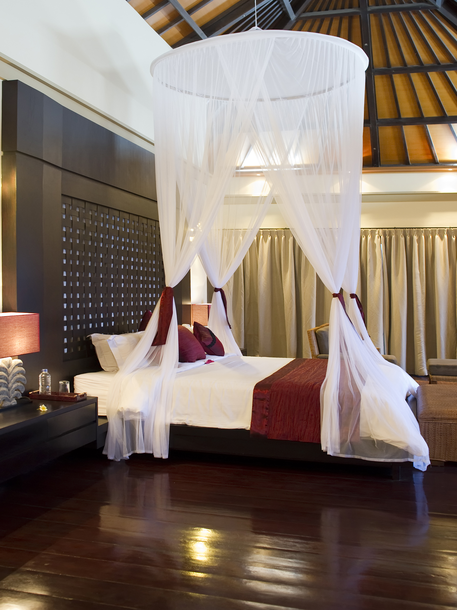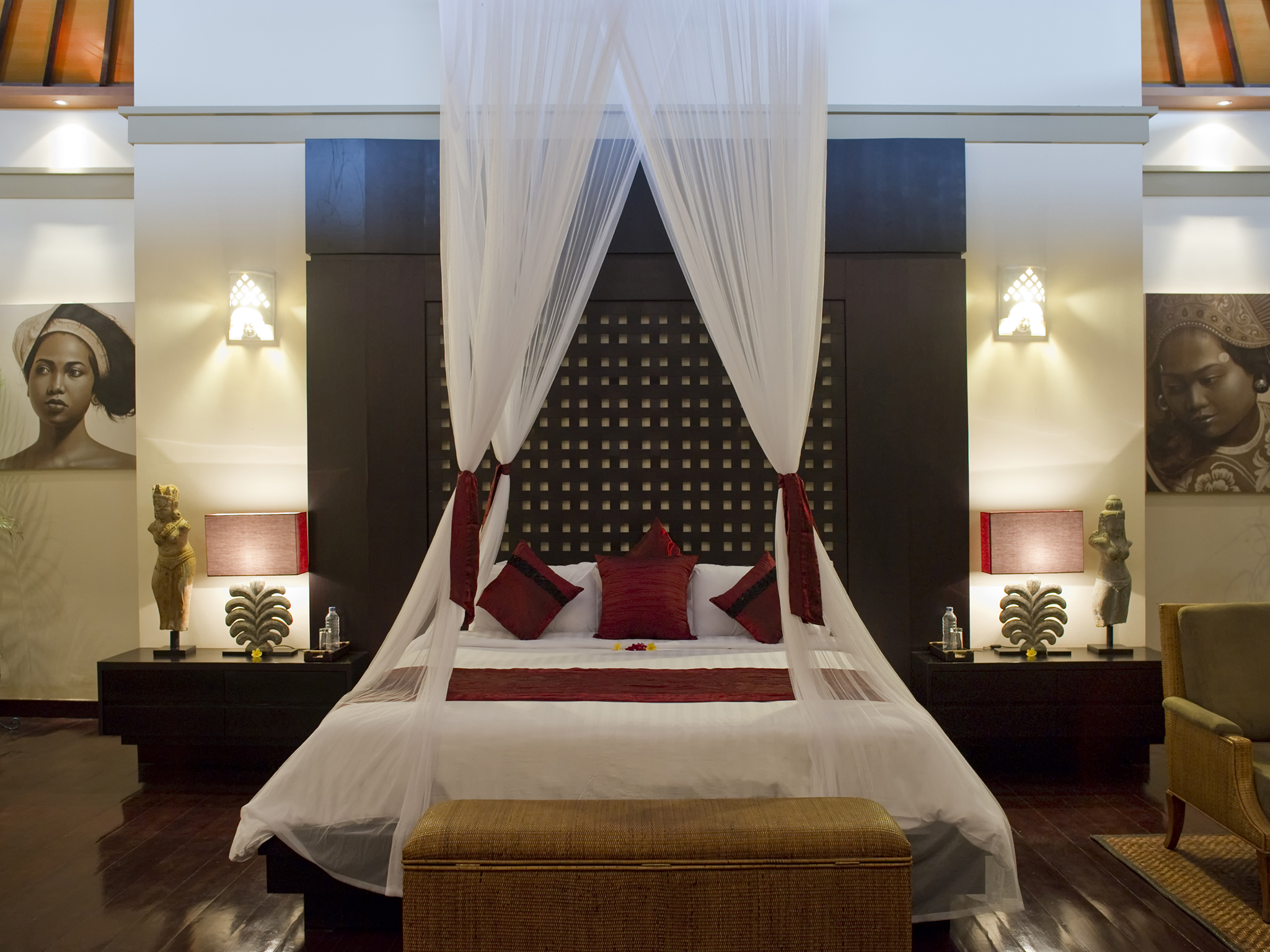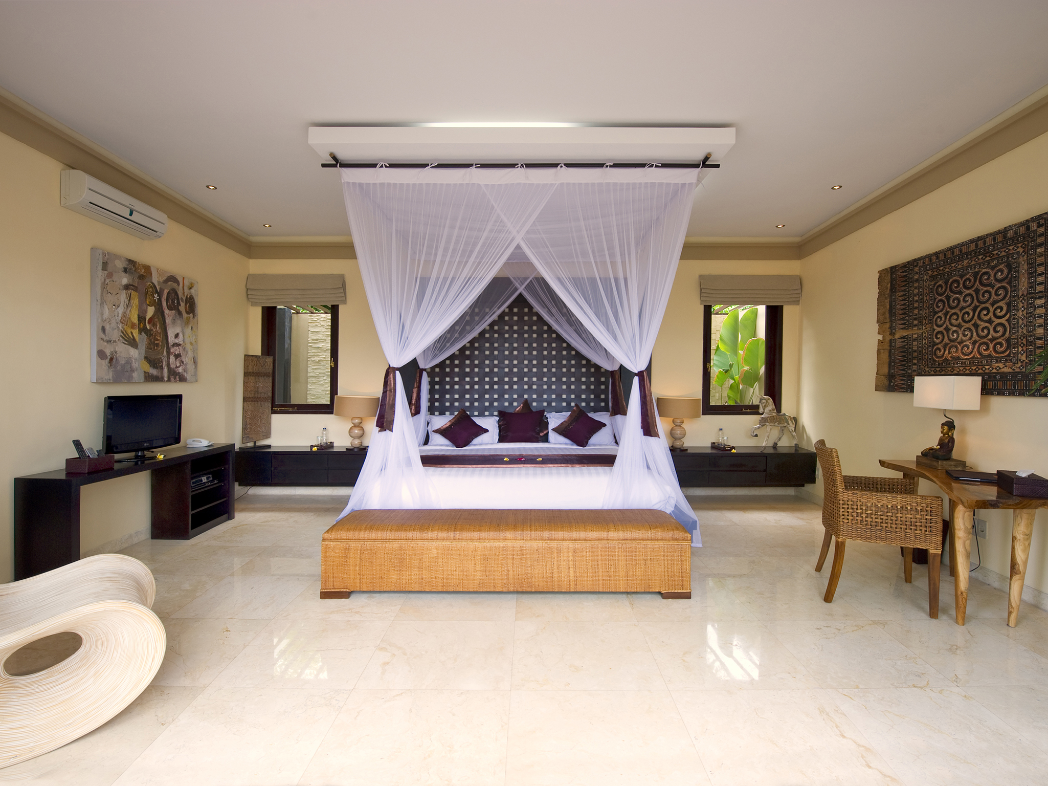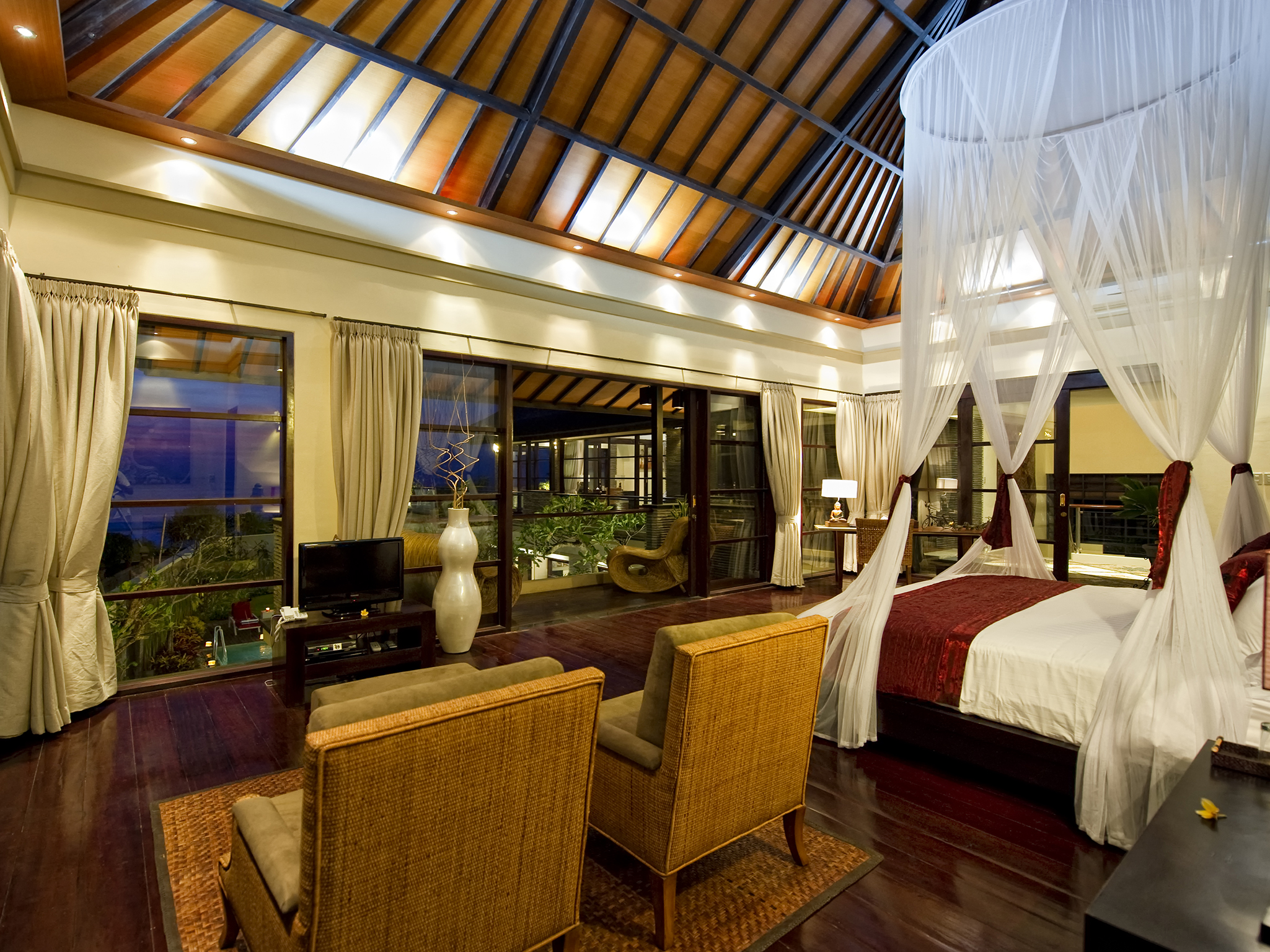 A stone staircase from the hallway adjacent to the living room leads up to the three remaining bedrooms. Immediately to the left is a guestroom with sea views from its side windows, a king-size bed and ensuite bathroom with tub and overhead rain shower as well as a small walk-through dressing room. To the front and right of the stairs are the two master bedrooms, both of which boast unobstructed views of the sea. The master bedroom to the right is a huge space with king-size bed, lounge area and private balcony above the pool whilst the master bedroom to the front is similarly styled but comes with an attached lounge with rattan seating that leads to a large terrace with all-weather rattan sofas topped with red cushions boasting stunning sea and sunset views. Bathrooms of these master bedrooms come with dressing areas, tubs and semi-open-air tropical rain showers. All bedrooms are air conditioned and come with satellite TVs and DVD players.