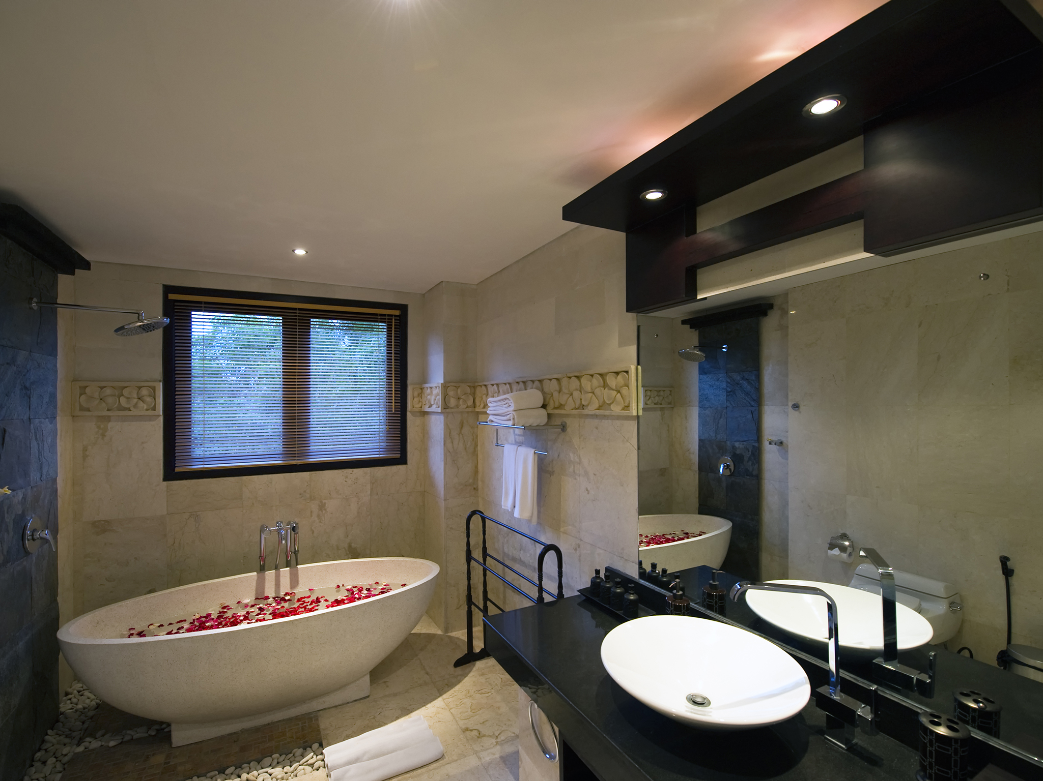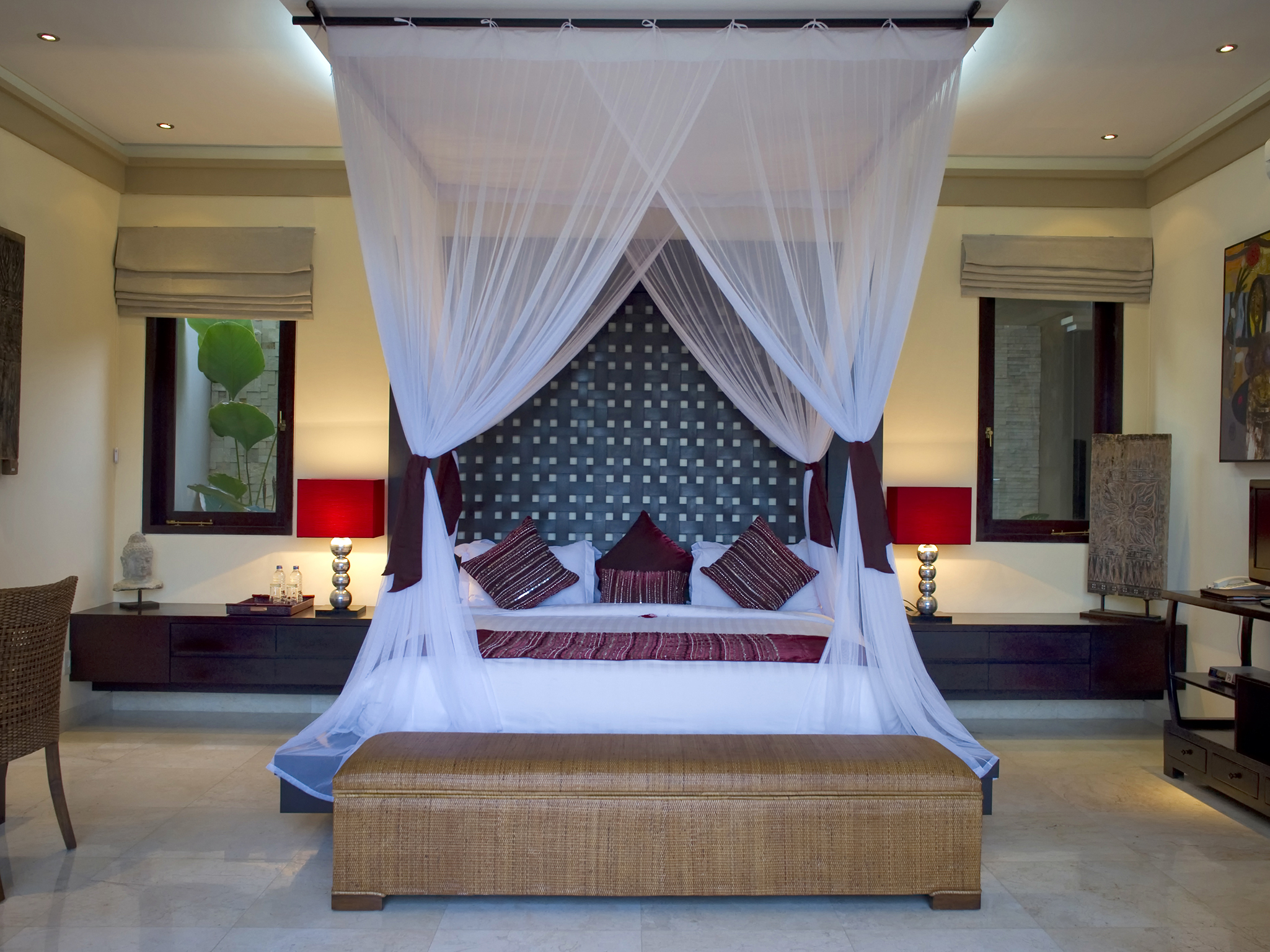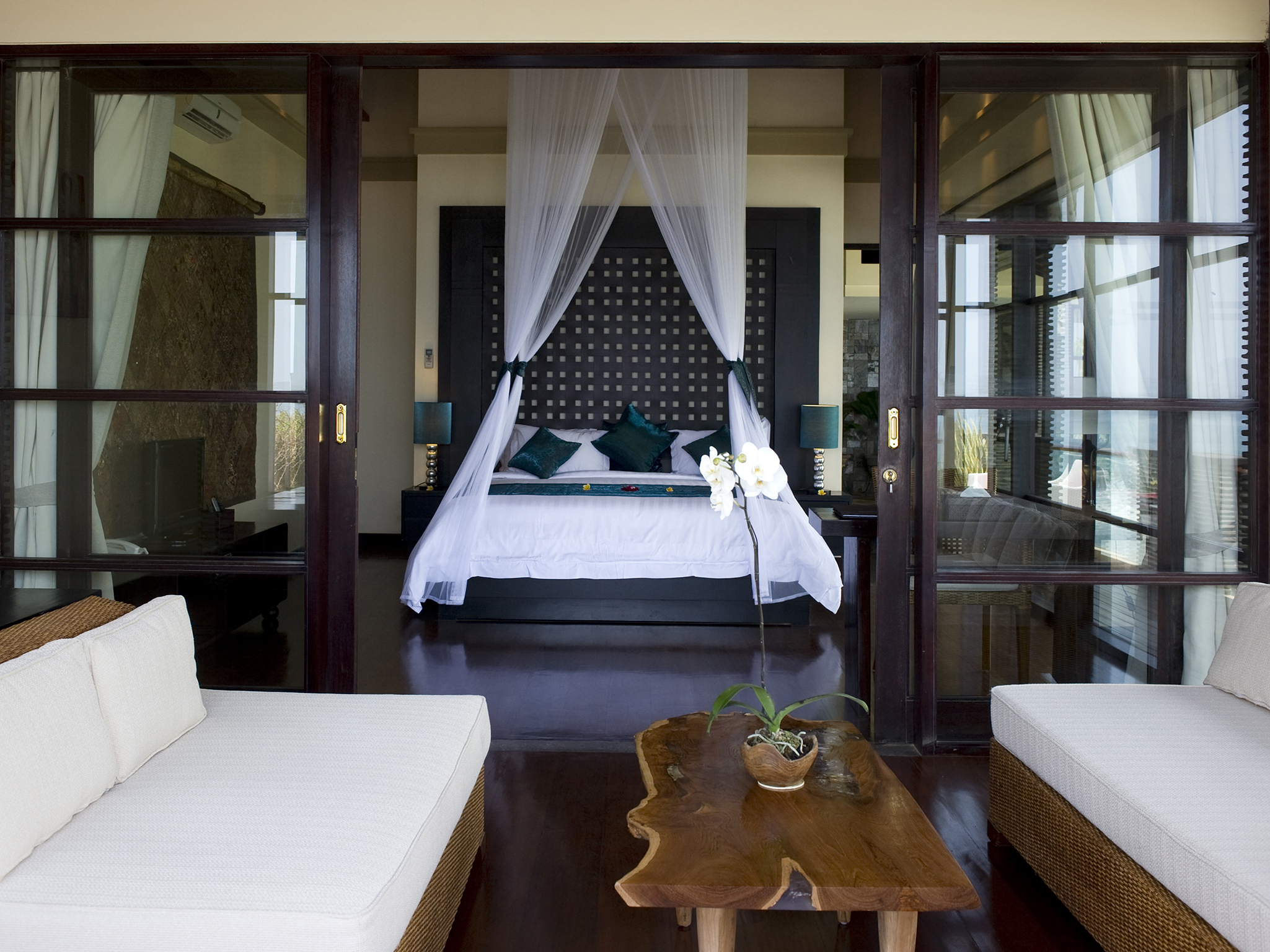 A stone staircase from the hallway adjacent to the living room leads up to the three remaining bedrooms. Immediately to the left is a guestroom with sea views from its side windows, a king-size bed and ensuite bathroom with tub and overhead rain shower as well as a small walk-through dressing room. To the front and right of the stairs are the two master bedrooms, both of which boast unobstructed views of the sea. The master bedroom to the right is a huge space with king-size bed, lounge area and private balcony above the pool whilst the master bedroom to the front is similarly styled but comes with an attached lounge with rattan seating that leads to a large terrace with all-weather rattan sofas topped with red cushions boasting stunning sea and sunset views. Bathrooms of these master bedrooms come with dressing areas, tubs and semi-open-air tropical rain showers. All bedrooms are air conditioned and come with satellite TVs and DVD players.