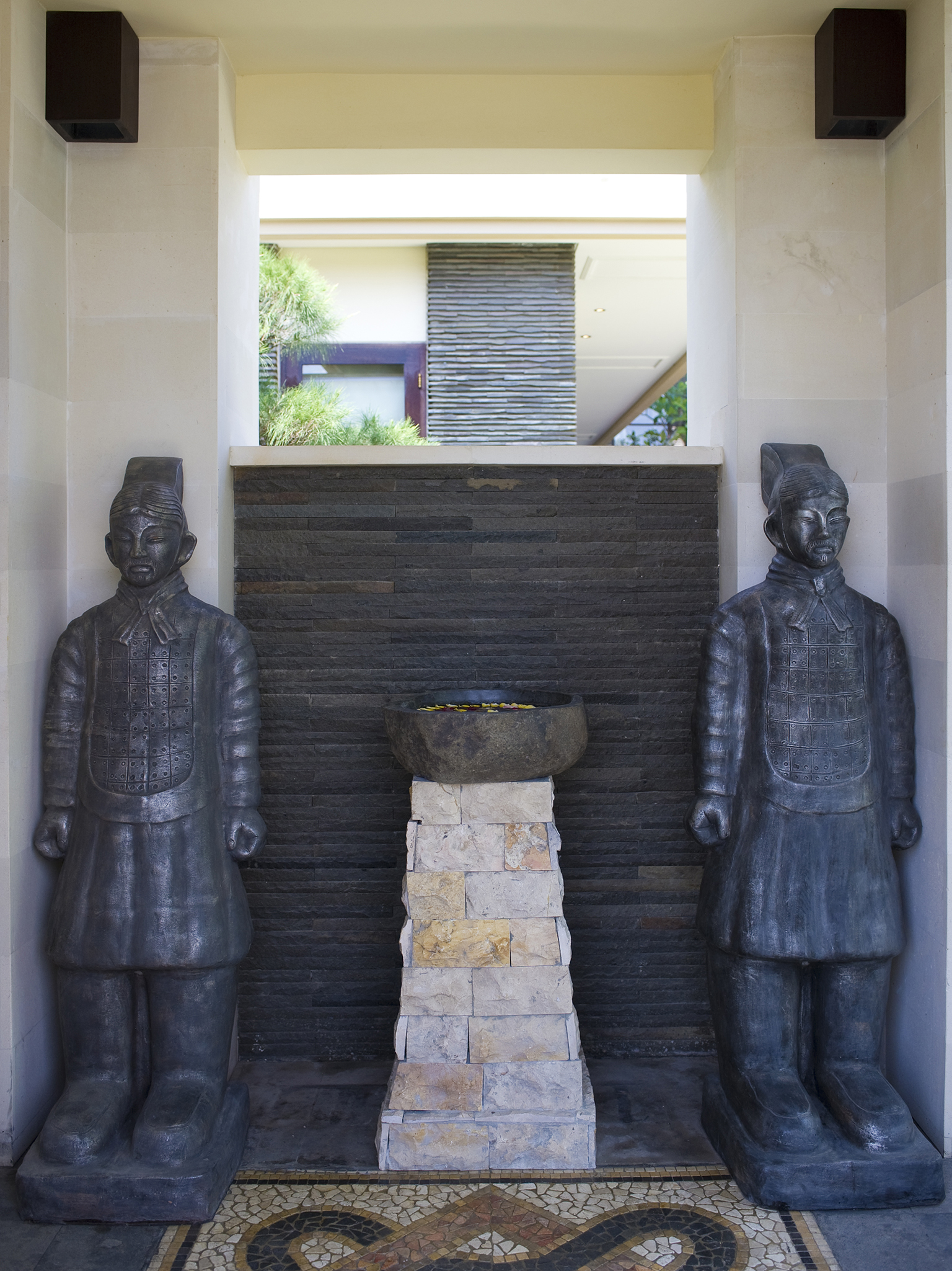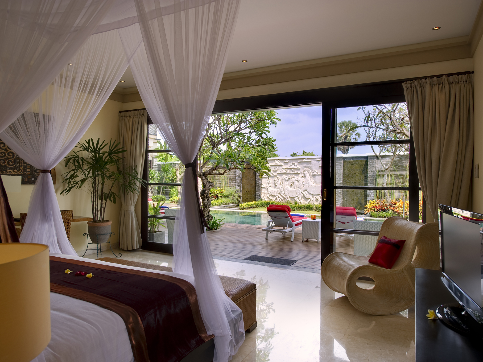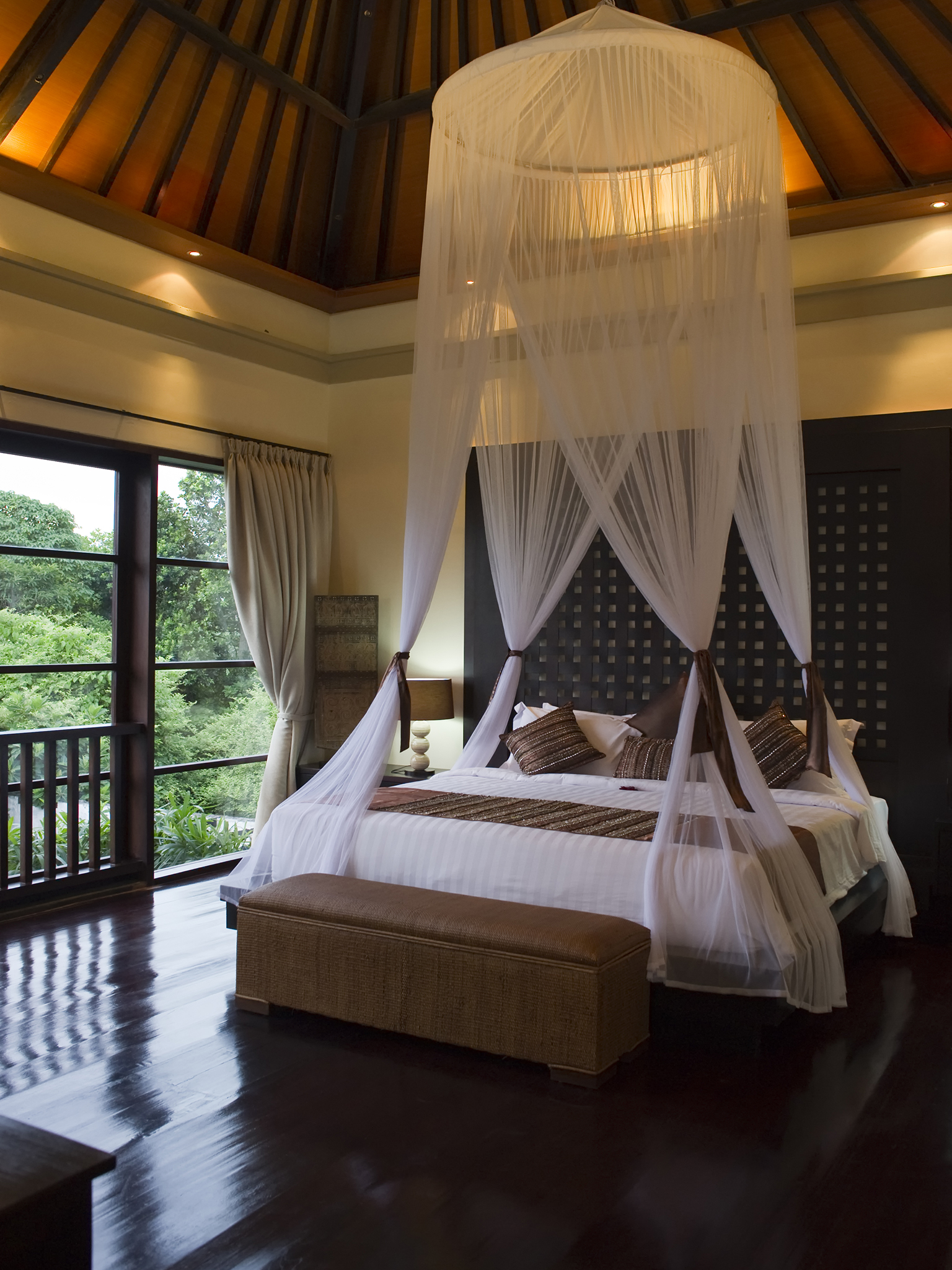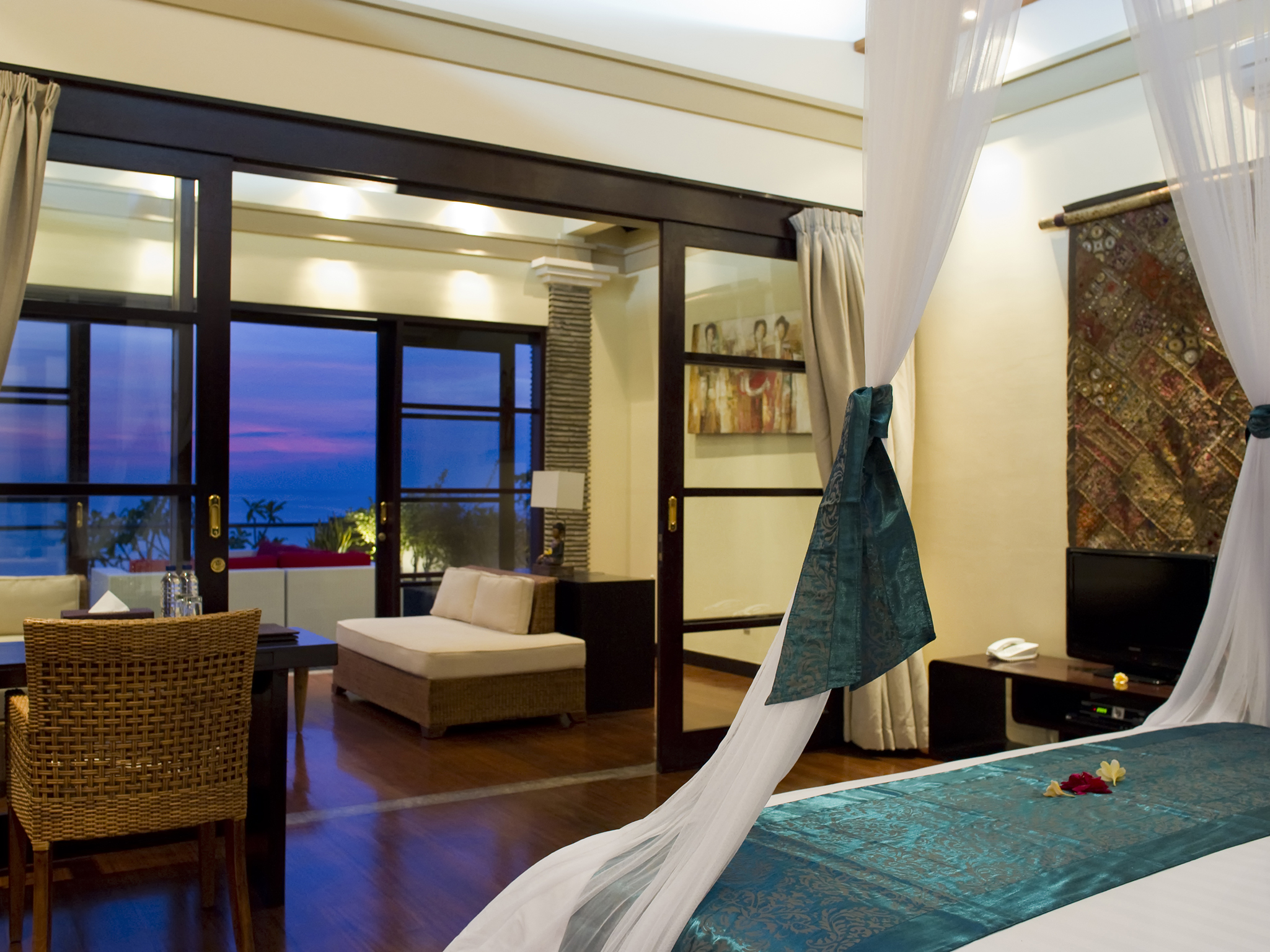 A stone staircase from the hallway adjacent to the living room leads up to the three remaining bedrooms. Immediately to the left is a guestroom with sea views from its side windows, a king-size bed and ensuite bathroom with tub and overhead rain shower as well as a small walk-through dressing room. To the front and right of the stairs are the two master bedrooms, both of which boast unobstructed views of the sea. The master bedroom to the right is a huge space with king-size bed, lounge area and private balcony above the pool whilst the master bedroom to the front is similarly styled but comes with an attached lounge with rattan seating that leads to a large terrace with all-weather rattan sofas topped with red cushions boasting stunning sea and sunset views. Bathrooms of these master bedrooms come with dressing areas, tubs and semi-open-air tropical rain showers. All bedrooms are air conditioned and come with satellite TVs and DVD players.